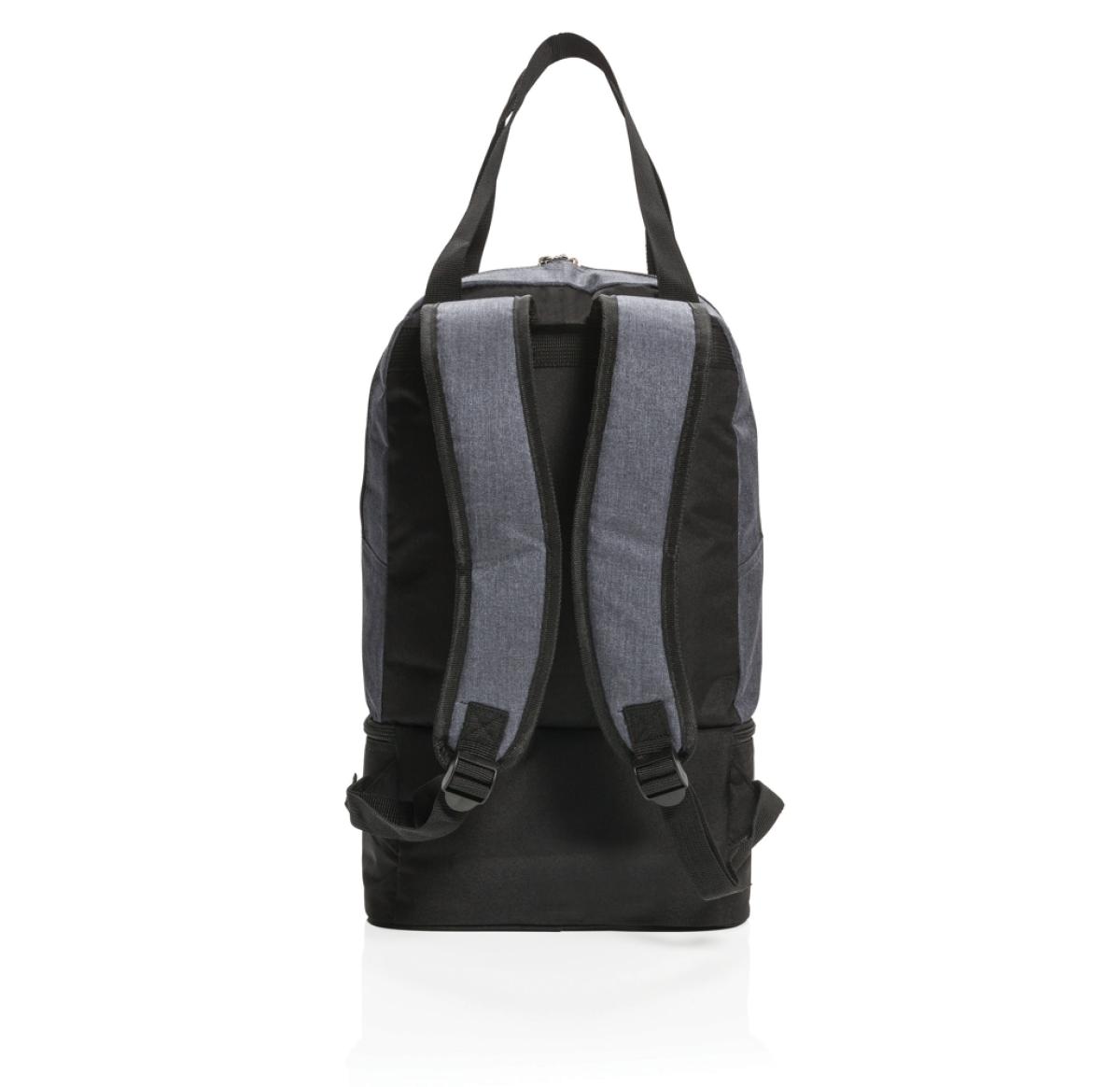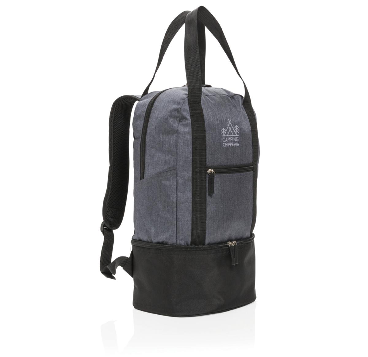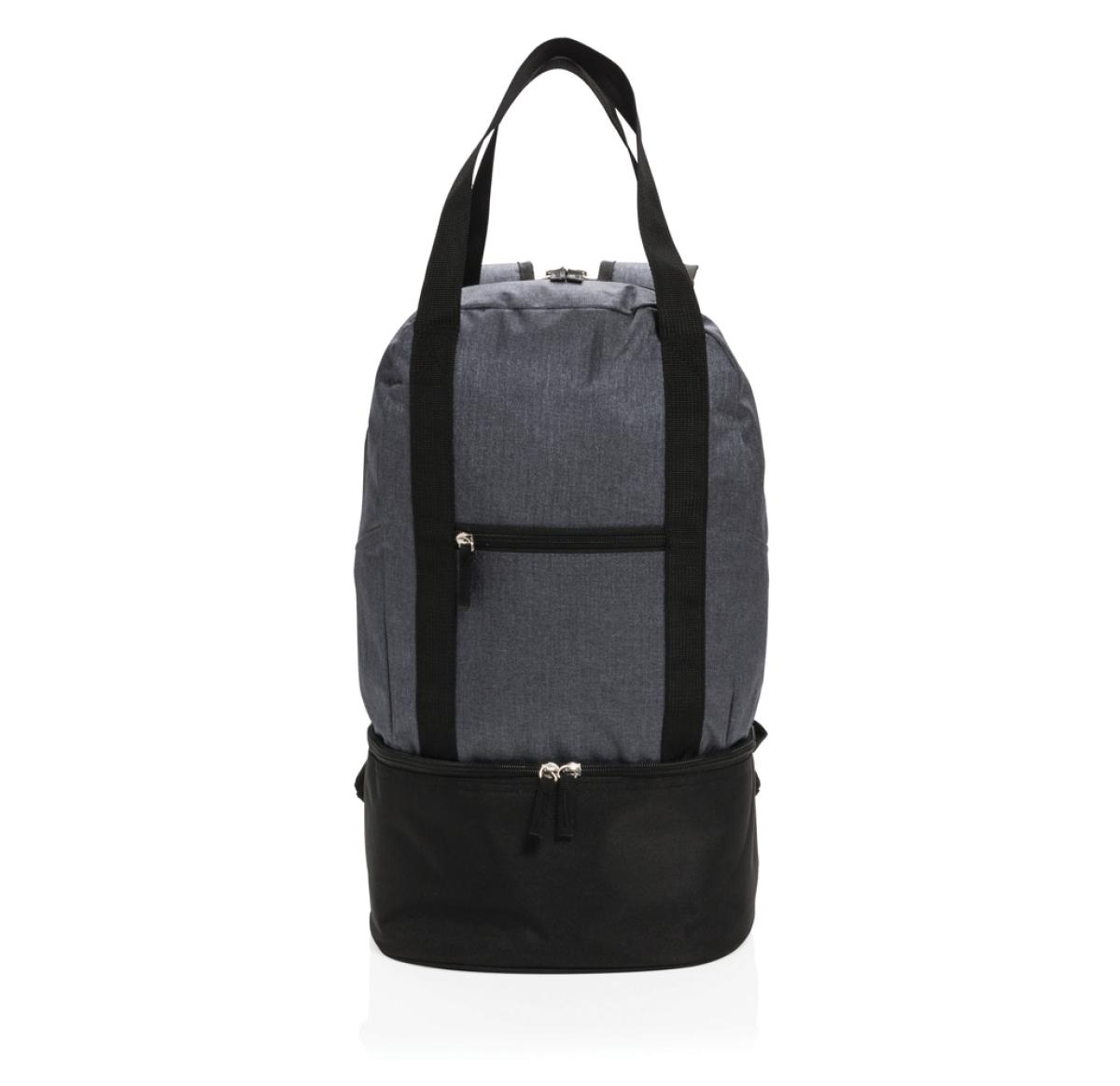This two tone 500D polyester backpack has a main compartment for your beach gear and a bottom cooler compartment with space for up to 8 cans. Easy switch to tote bag with the straps.