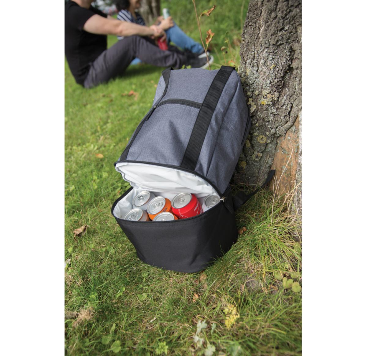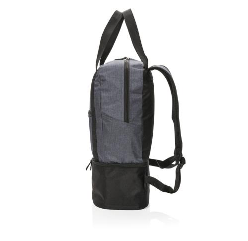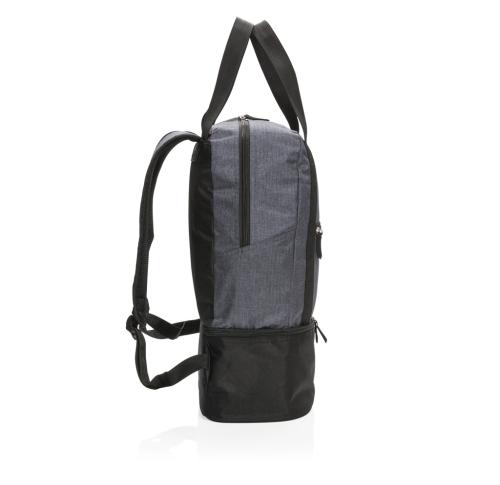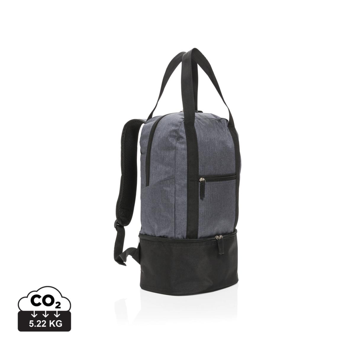This two tone 500D polyester backpack has a main compartment for your beach gear and a bottom cooler compartment with space for up to 8 cans. Easy switch to tote bag with the straps.