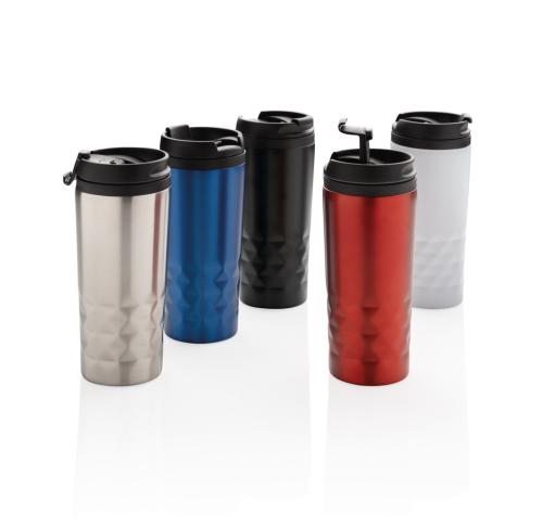 Fashionable stainless steel tumbler with geometric details. Inner body is made out of plastic. Handwash only. Content 300ml.