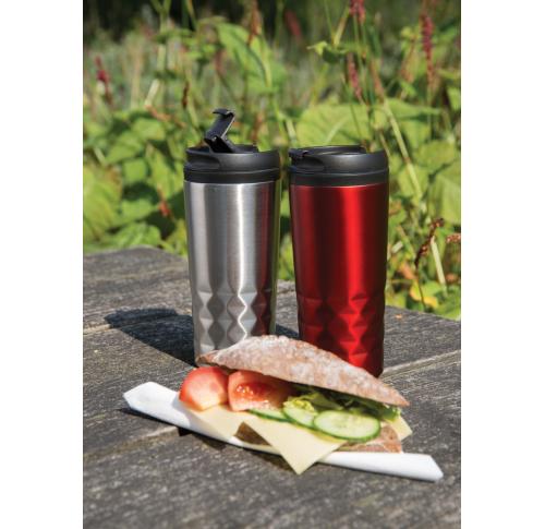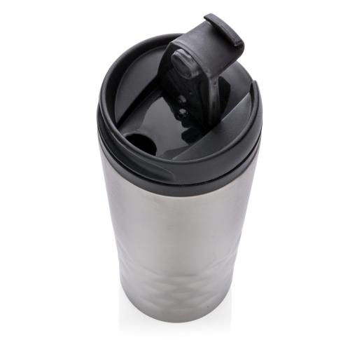 Fashionable stainless steel tumbler with geometric details. Inner body is made out of plastic. Handwash only. Content 300ml.