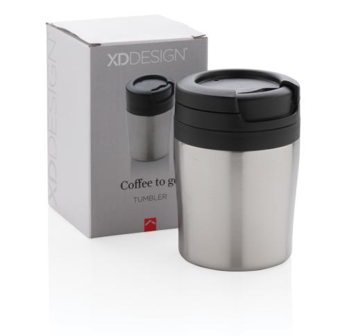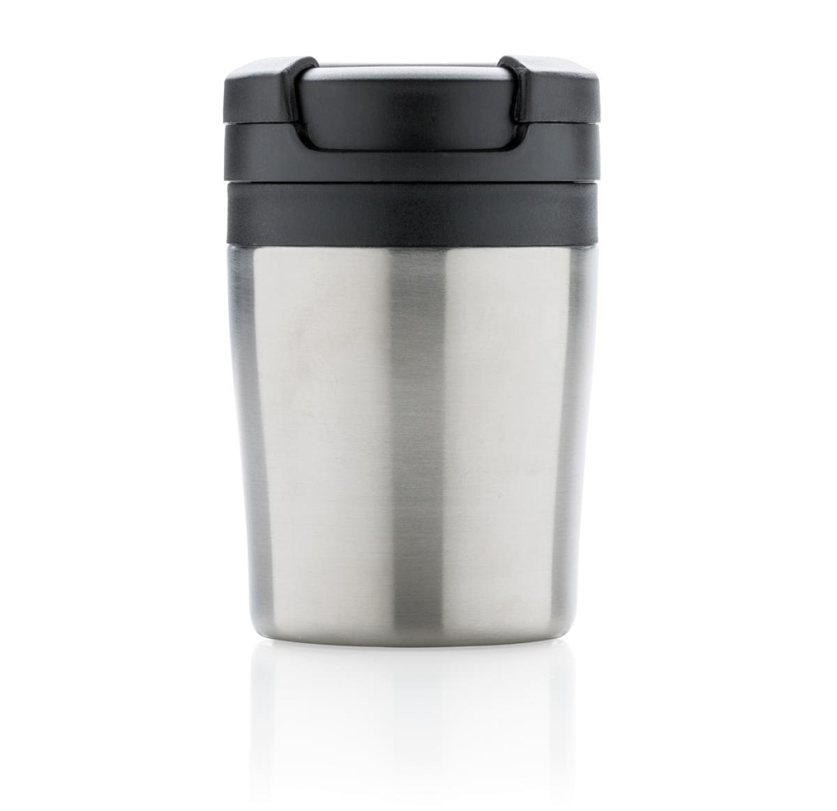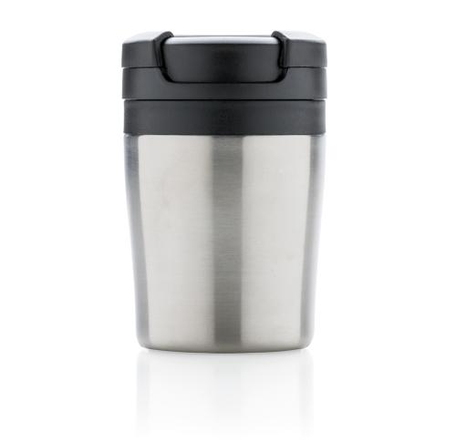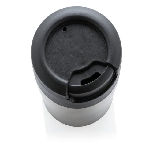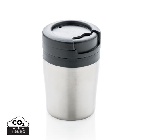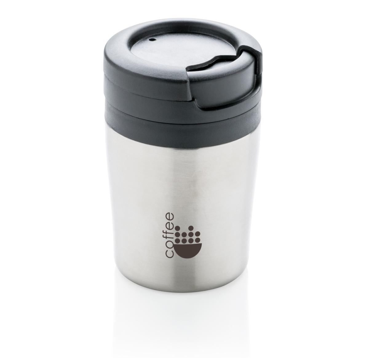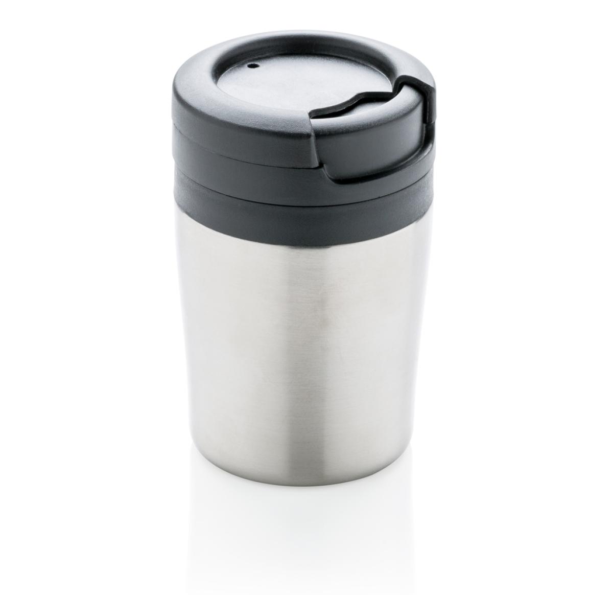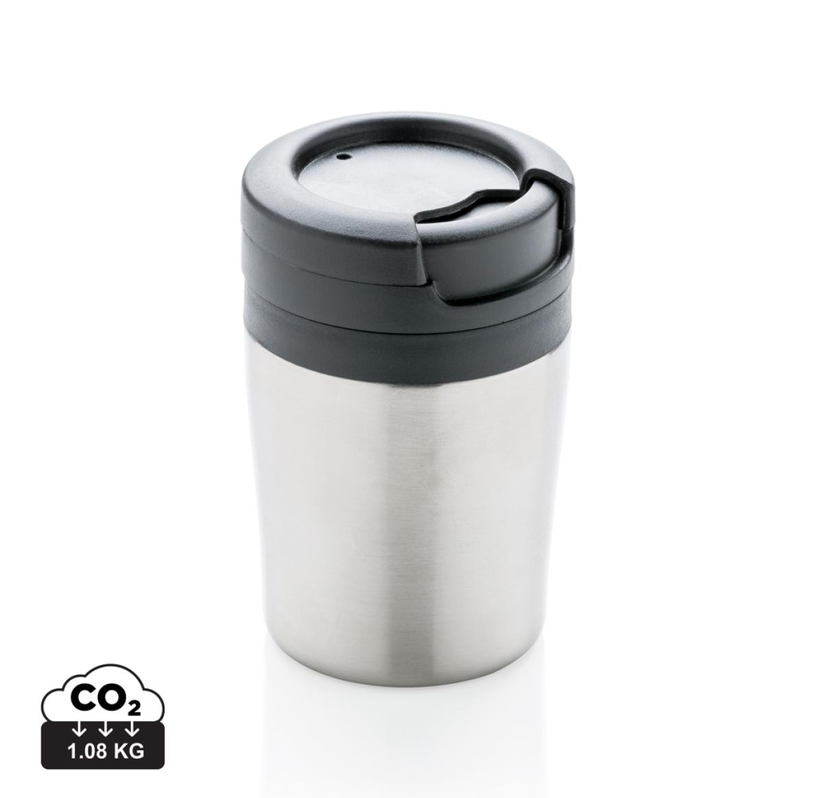 Less is more. Being 8cm high this is the perfect double wall mug for your coffee machine. PP inner. Easy twist spill proof lid. Great for Ristretto, Espresso and Lungo coffee. Hand washable only. Content 160ml. Registered design®