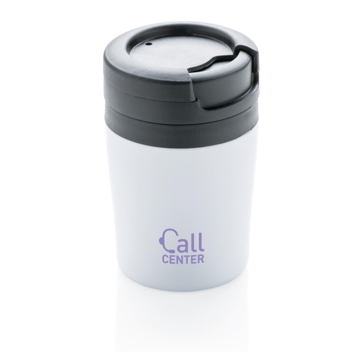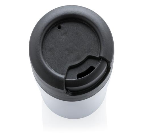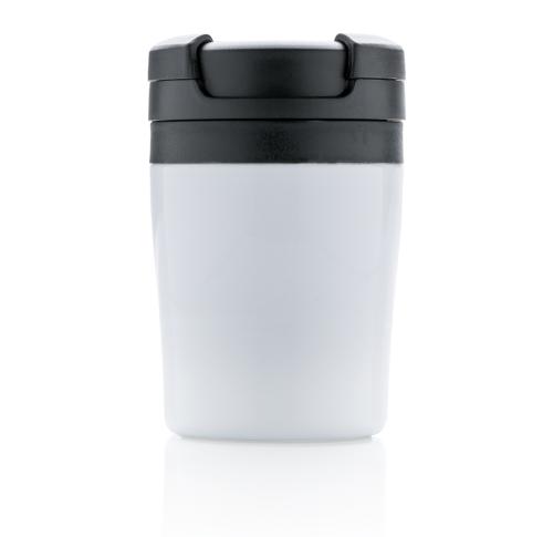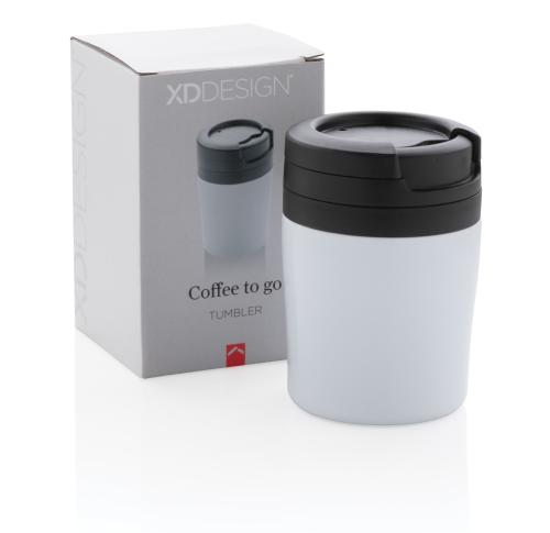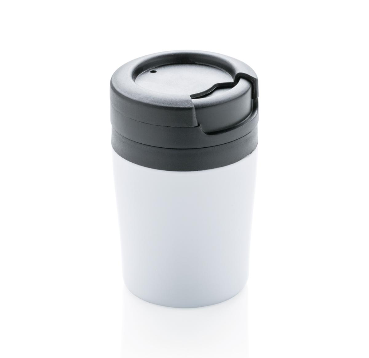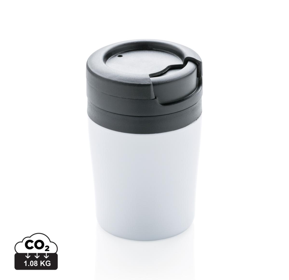 Less is more. Being 8cm high this is the perfect double wall mug for your coffee machine. PP inner. Easy twist spill proof lid. Great for Ristretto, Espresso and Lungo coffee. Hand washable only. Content 160ml. Registered design®