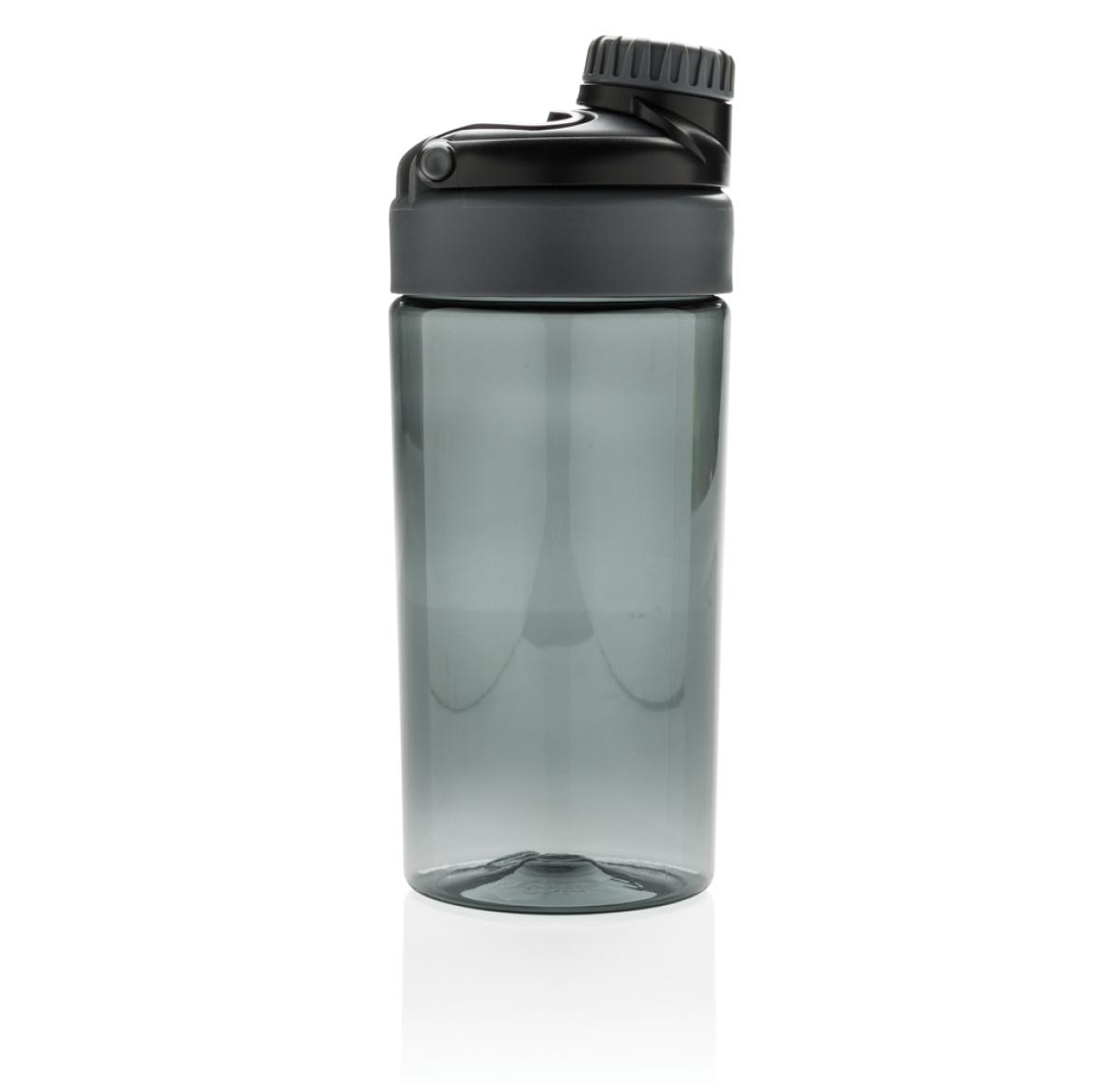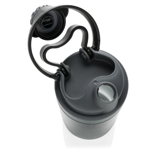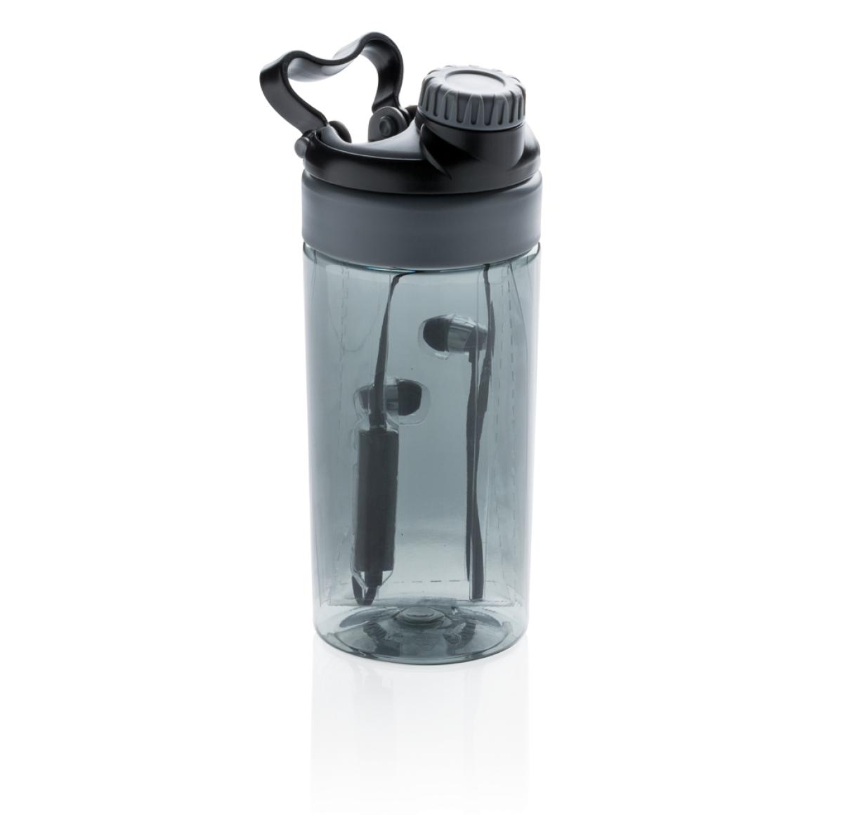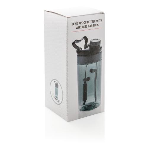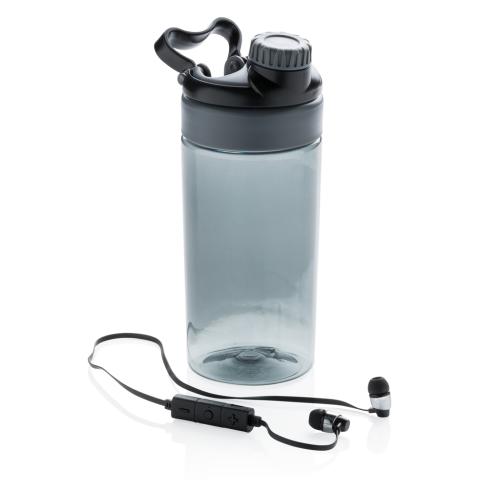 Leakproof tritan bottle with unique lid incorporating easy carry handle. Sweatproof wireless Bluetooth 4.0 earbuds inside. 55 mAh battery inside for 3 hours of music. Includes microphone, phone pickup function and volume control. Includes micro USB cable.