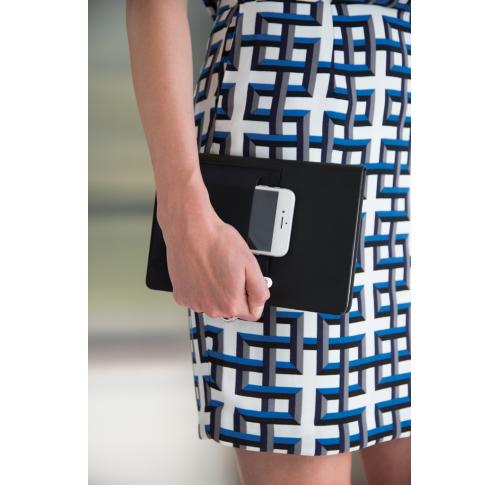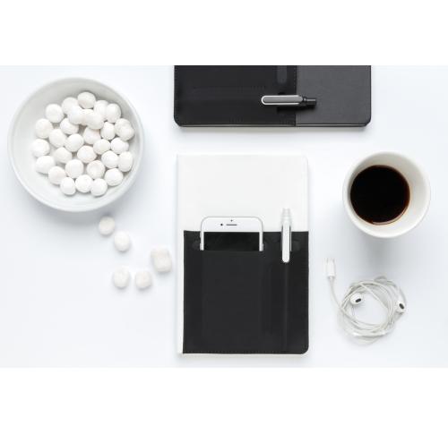 A5 notebook with 160 cream coloured lined pages of 80g/m2 paper inside. Front cover has a flexible phone pocket, pen pocket and larger sleeve pocket for documents. Phone pocket is 8cm wide which fits iPhone 7 plus.