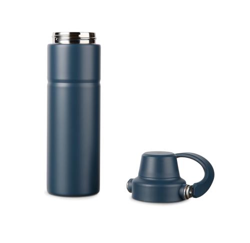 A modern and durable double wall vacuum bottle crafted from recycled stainless steel. Perfectly designed for functionality with its convenient handle, this bottle is ideal for adventures. The lid features two openings: a sip-friendly top for easy access and a larger opening for effortless refills and easy cleaning. The double walled insulation keeps your drink cold for up to 12 hours and hot for up to 4 hours, ensuring you stay refreshed throughout your journey. Not dishwasher or microwave safe, only handwash. Certified by RCS (Recycled Claim Standard), RCS certification guarantees that the entire supply chain of recycled materials is certified. The total recycled content is based on the overall product weight. This product contains 65% RCS certified recycled stainless steel.