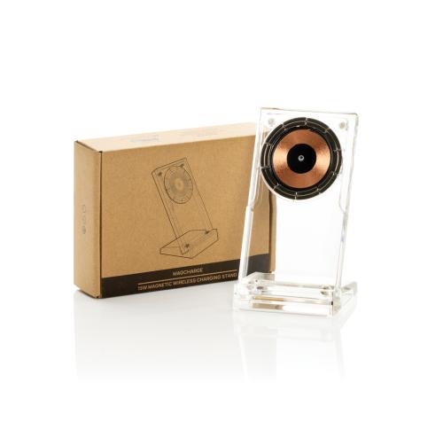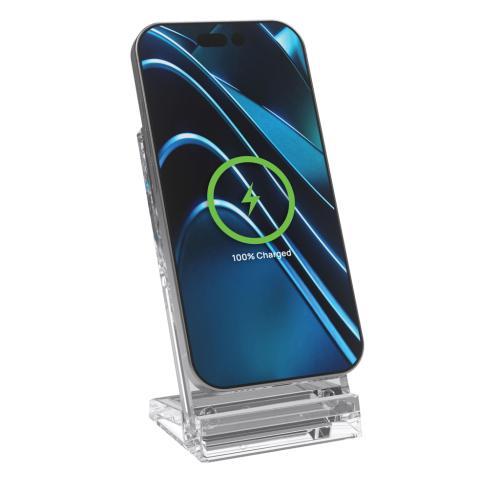 Charge your phone effortlessly with our 15W wireless charging stand, designed for all phones that support magnetic wireless charging. Featuring powerful magnets, your phone stays securely in place, whether positioned vertically or horizontally—perfect for calls, browsing, or watching videos. Crafted from premium acrylic, this stand isn’t just functional—it’s a stunning decorative piece. Personalise it with vibrant full-colour prints or transform it into a unique custom trophy that reflects your style. The stand comes with a 120 cm USB-C fast charge cable, ensuring seamless connectivity and fast charging every time. Upgrade your workspace or home with a charger that combines form, function, and flair! Packed in FSC certified kraft box.