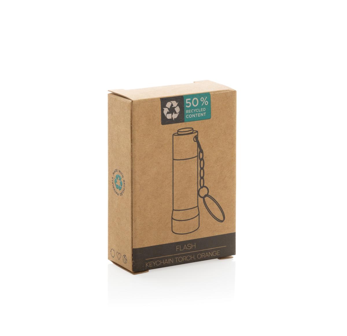 3 LED pocket size torch made with RCS recycled aluminum Total recycled content: 50% based on total item weight. RCS certification ensures a completely certified supply chain of the recycled materials. With 15 lumen that allow an operating time up to 6 hours on one set of batteries (included) With keychain. Beam distance: 3 metre. Packed in FSC® mix kraft packaging.