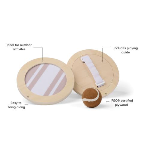 This is the ideal outdoor game to bring to the beach or park. It includes one ball and two velcro catchers, crafted from FSC® certified plywood. The design is sporty yet refined, featuring a two-tone striped pattern on the catchers and a matching brown ball. The game is conveniently packed in a canvas bag with a mesh back making it easy to bring along. Instruction leaflet is included.