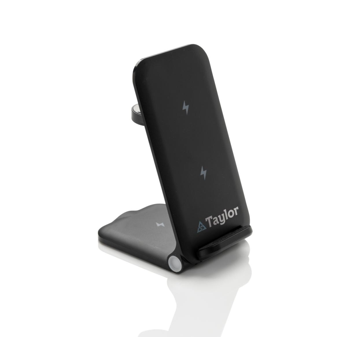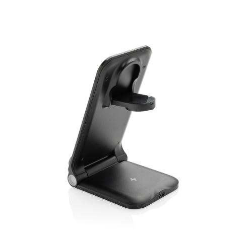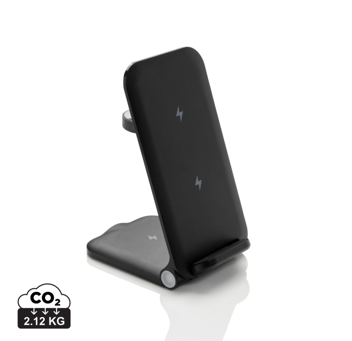 3-in-1 wireless charger stand made with RCS recycled ABS. Total recycled content: 51% based on total item weight. RCS certification ensures a completely certified supply chain of the recycled materials. The wireless charger comes equipped with a 15W wireless charger and an additional 5W wireless charger suitable for earbuds cases or other small wireless chargeable devices and a 2.5W wireless charger for smartwatches ( Apple watches only). Foldable design so easy to take with you. Including RCS certified 120 cm recycled TPE cable. Packed in FSC® mix kraft packaging. Item and accessories 100% PVC free. Input: 9V/3A for optimal use. Output: Phone: 9V/1.1A; 9V/1.67 A/(15W), Earbuds: 5V/1A (5W), Watch: 5V/0.5A.