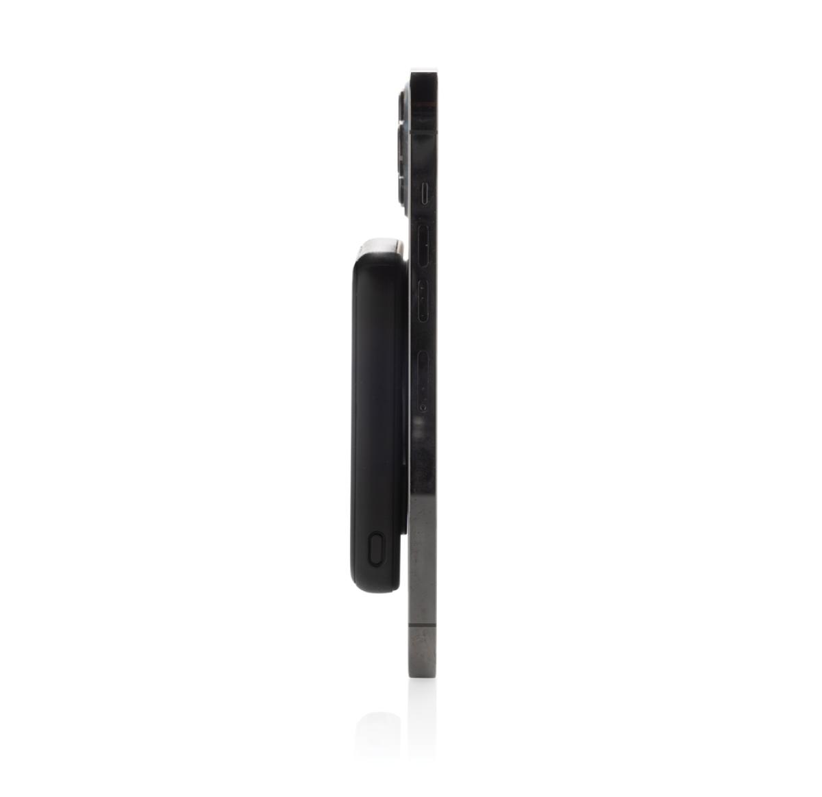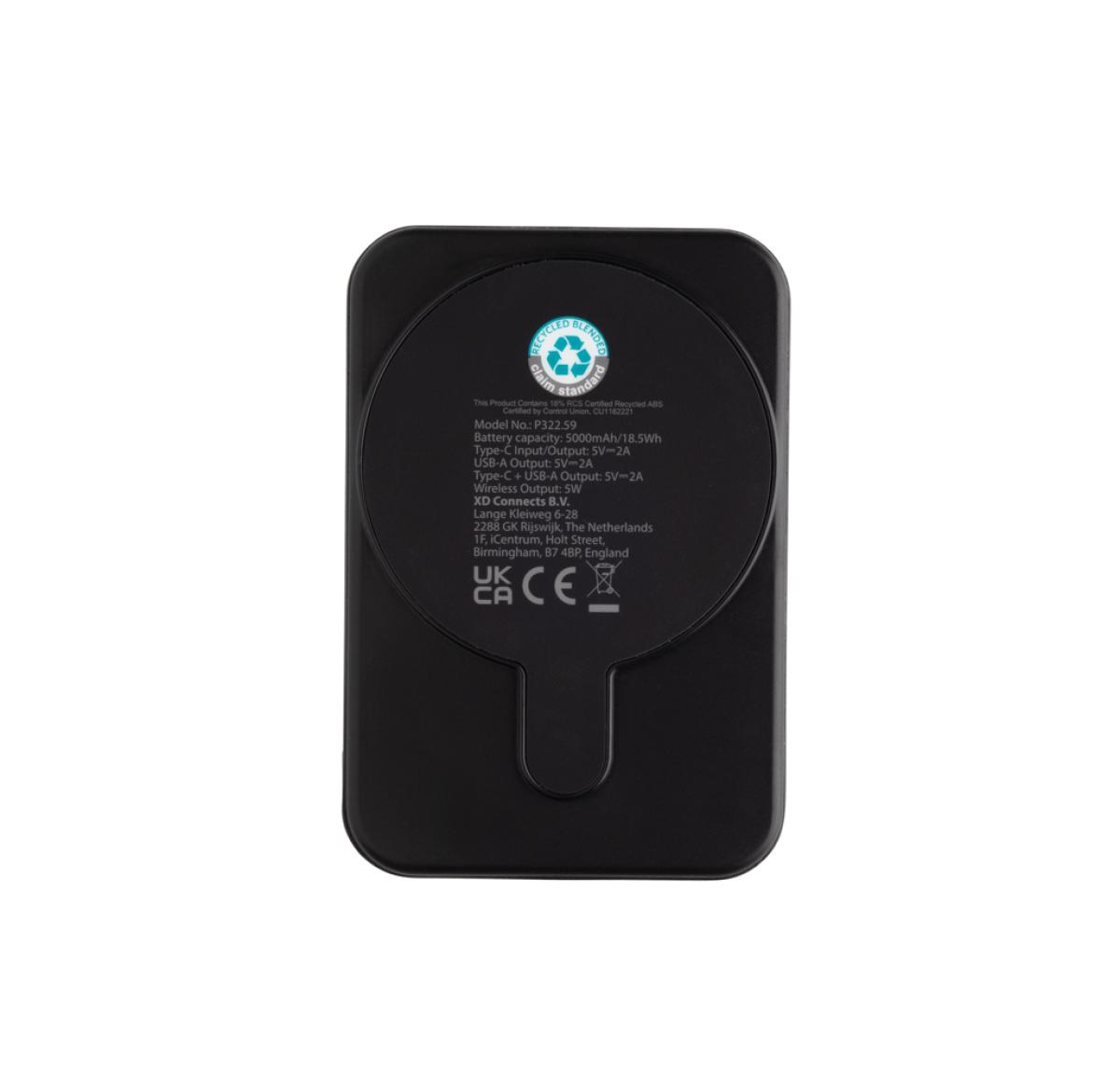5.000 mAh pocket size powerbank with 5W magnetic wireless charger where the case is made out of RCS certified recycled ABS plastic. RCS (Recycled Claim Standard) is a standard to verify the recycled content of a product throughout the whole supply chain. Total recycled content: 20 % based on total item weight. With USB A and UCB C output option. The powerbank contains a long lasting grade A 5.000 mAh lithium polymer battery. The power indicators will indicate the remaining energy level so you always know when to re-charge.; Type-C Input 5V/2.4A; USB C /USB A output:5V/2A.4A Item and accessories PVC free. Including RCS certified recycled TPE charging cable. Packed in FSC® mix packaging.