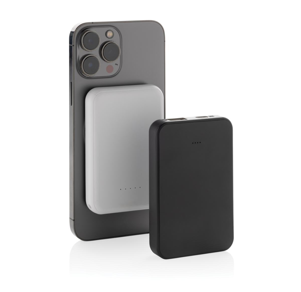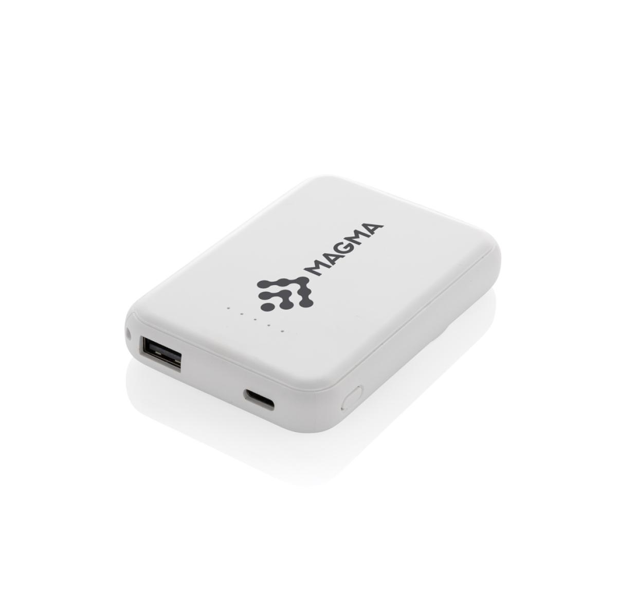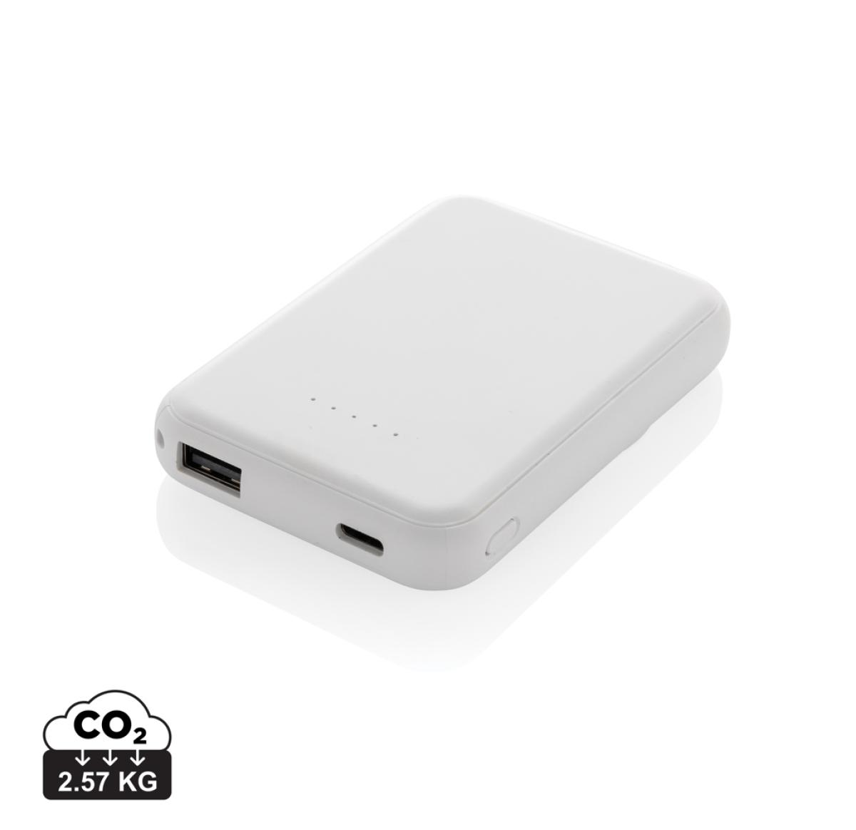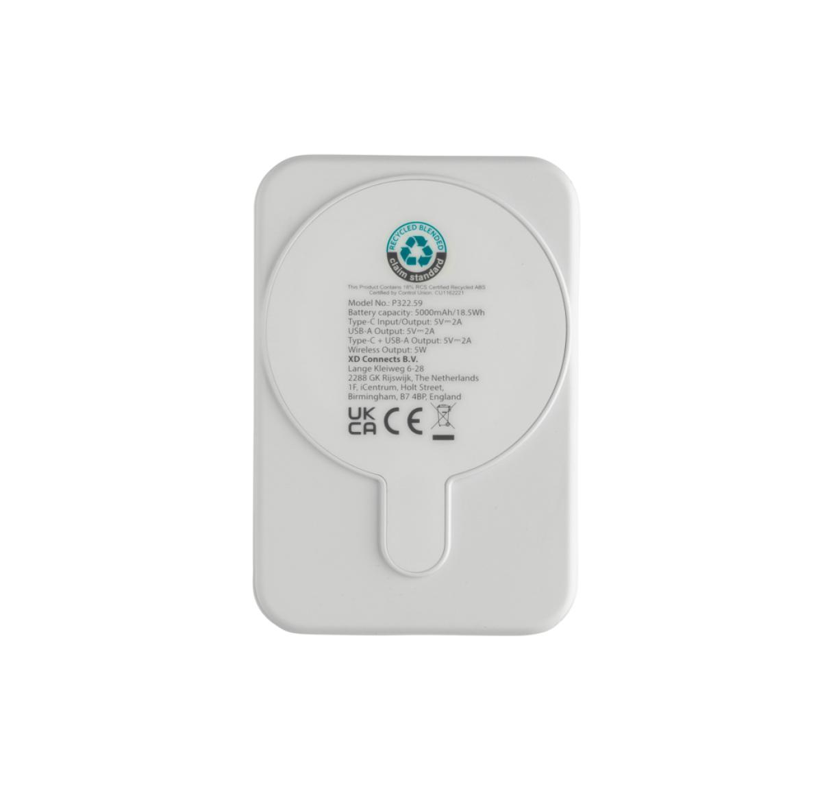 5.000 mAh pocket size powerbank with 5W magnetic wireless charger where the case is made out of RCS certified recycled ABS plastic. RCS (Recycled Claim Standard) is a standard to verify the recycled content of a product throughout the whole supply chain. Total recycled content: 20 % based on total item weight. With USB A and UCB C output option. The powerbank contains a long lasting grade A 5.000 mAh lithium polymer battery. The power indicators will indicate the remaining energy level so you always know when to re-charge.; Type-C Input 5V/2.4A; USB C /USB A output:5V/2A.4A Item and accessories PVC free. Including RCS certified recycled TPE charging cable. Packed in FSC® mix packaging.