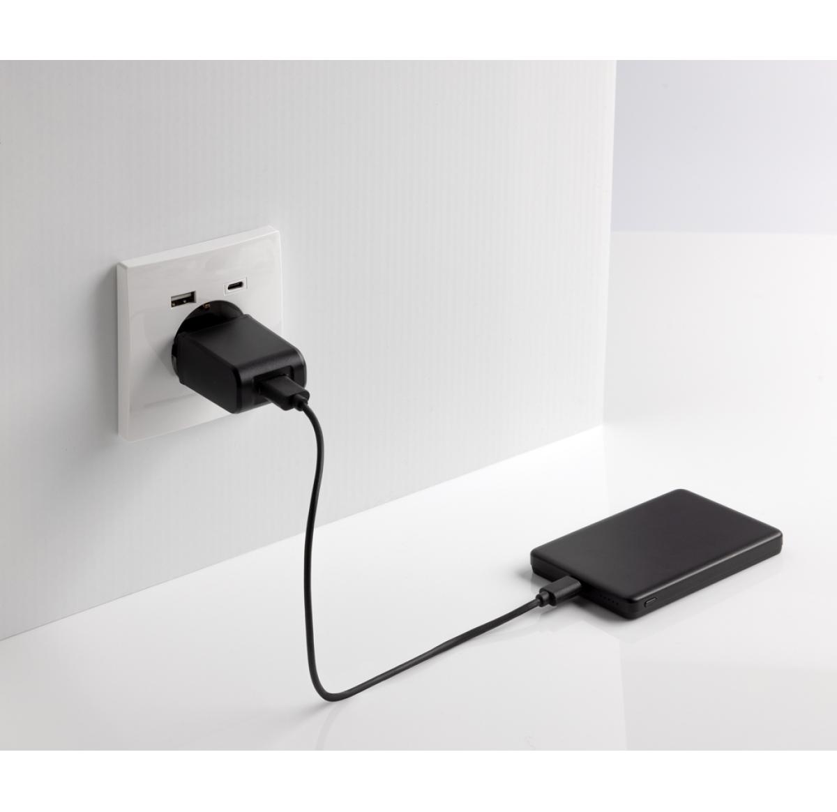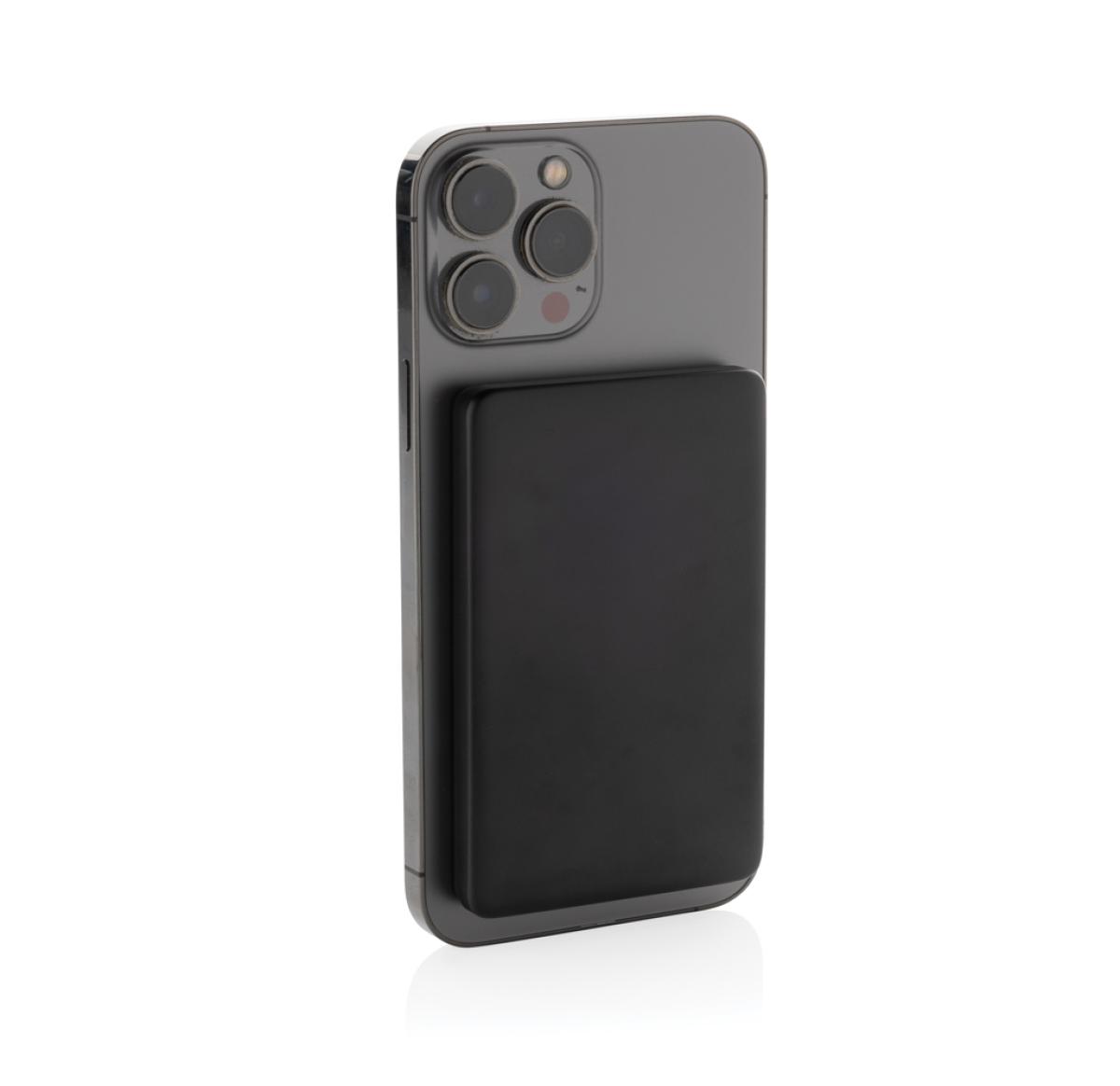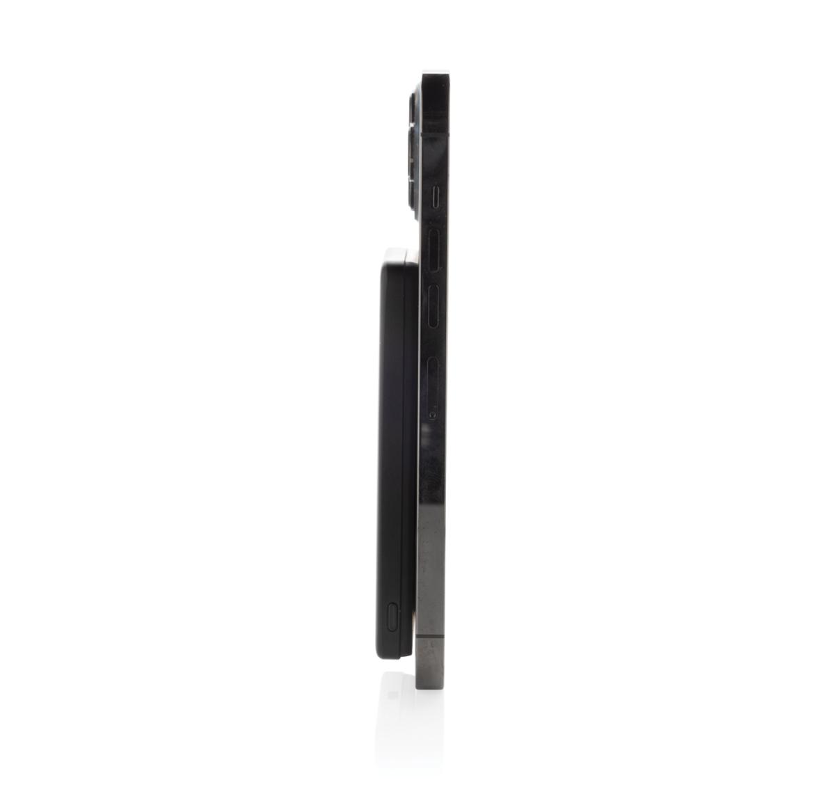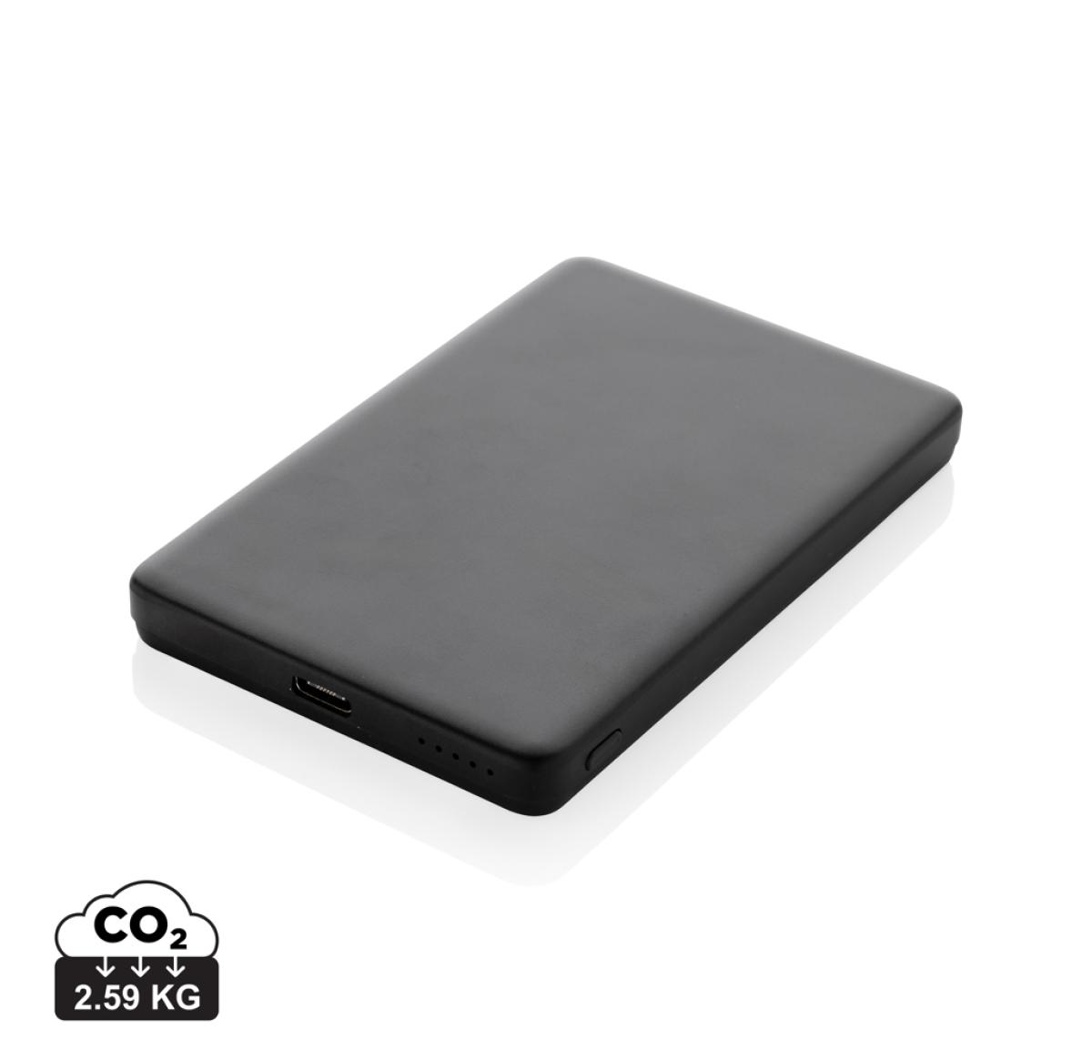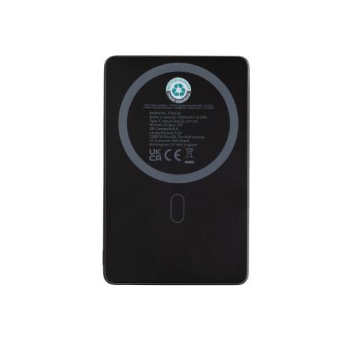 5.000 mAh ultra thin powerbank with 5W magnetic wireless charger where the case is made out of RCS certified recycled aluminum and recycled ABS plastic. RCS (Recycled Claim Standard) is a standard to verify the recycled content of a product throughout the whole supply chain. Total recycled content: 23 % based on total item weight. The powerbank contains a long lasting grade A 5.000 mAh lithium polymer battery. The power indicators will indicate the remaining energy level so you always know when to re-charge.; Type-C Input 5V/2.4A; USB C output:5V/2A.4A Item and accessories PVC free. Including RCS certified recycled TPE charging cable. Packed in FSC® mix packaging.