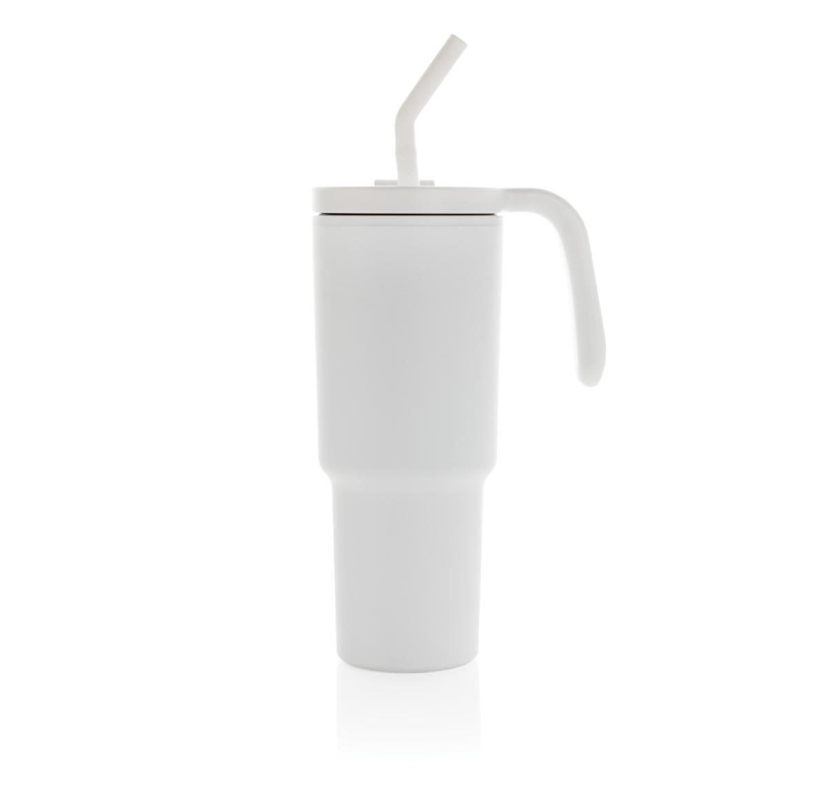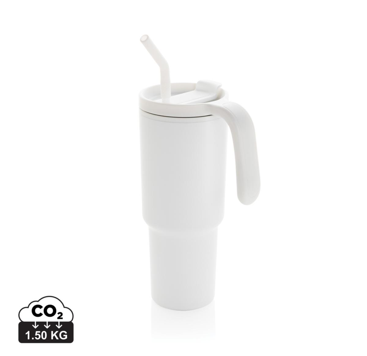The most popular mug now suitable for perfect 360 round body printing. A 900ml tumbler designed for eco-friendly hydration, made with recycled materials. Whether you're working, exercising, or travelling, this tumbler is your perfect companion. The innovative lid features a rotating cap with three positions: a spill-resistant straw opening, a sipping spout, and a fully sealed lid. The ergonomic handle with comfort-grip inserts ensures easy carrying, and the slim base fits most car cup holders. Hand wash only. BPA-free. Capacity: 900ml. Includes FSC®-certified kraft gift packaging. Total recycled content: 36% based on total item weight.