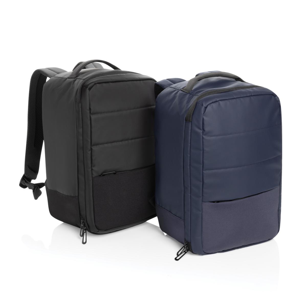The Armond Aware™ RPET Free On Board Travel Pack is designed for the budget-conscious or short business traveller. Made from rPET with a PU water-resistant coating and backed with AWARE technology, this backpack features a 15 inch padded laptop compartment on the right side, perfect for MacBooks or smaller devices. The interior, lined with rPET, ensures your belongings stay organised, while the adjustable shoulder straps and sturdy webbing handle on top provide comfort and convenience. With a front zipper pocket and a mini trolley compartment complete with an elastic strap, this pack is perfect for business or weekend trips. Its compact size fits under any budget airline seat, so you won't have to worry about extra baggage fees. Made with recycled polyester embedded with the AWARE™ tracer. 2% of proceeds of each product sold with AWARE™ will be donated to Water.org. PVC free.