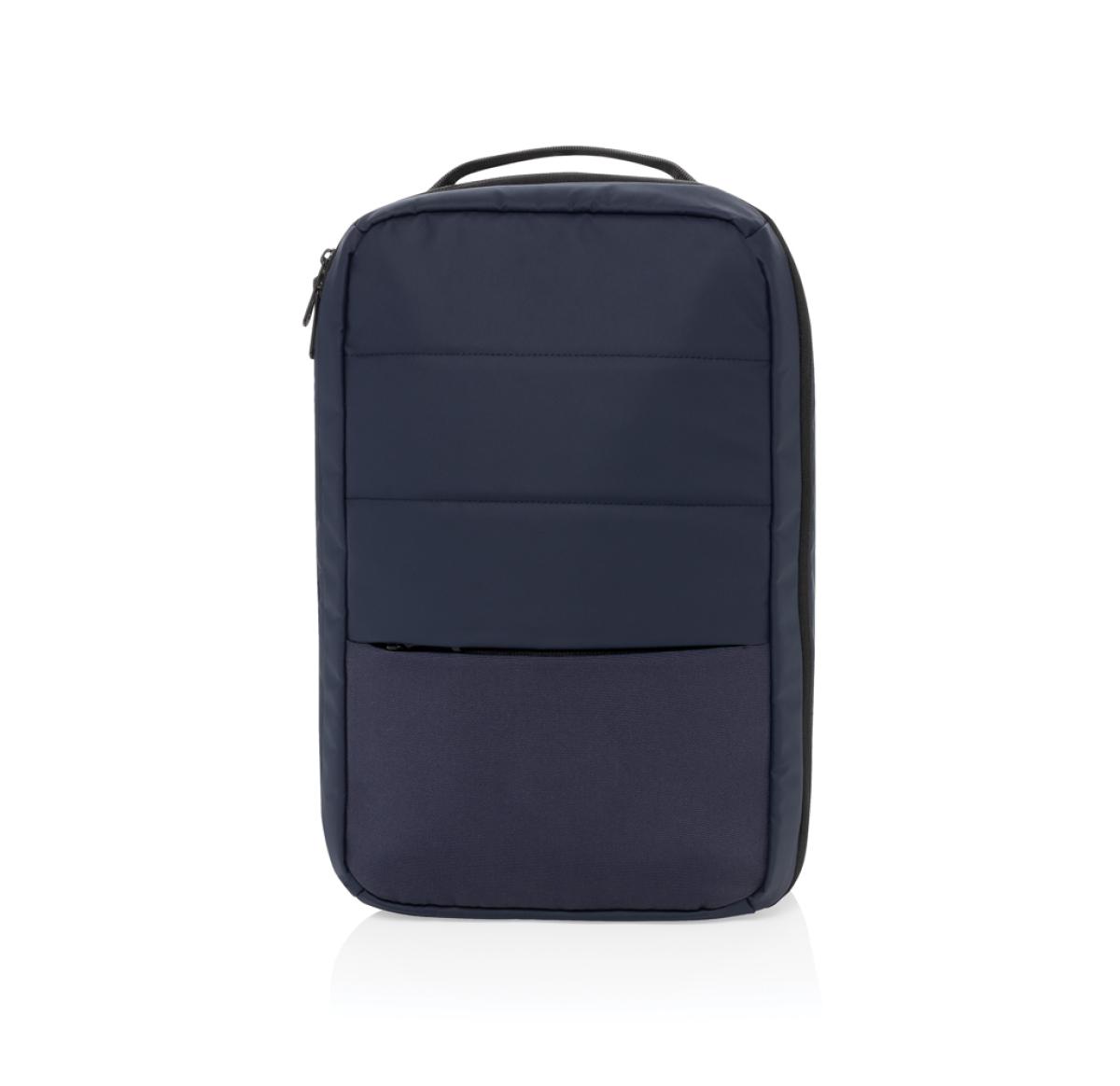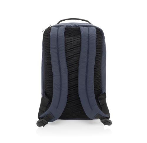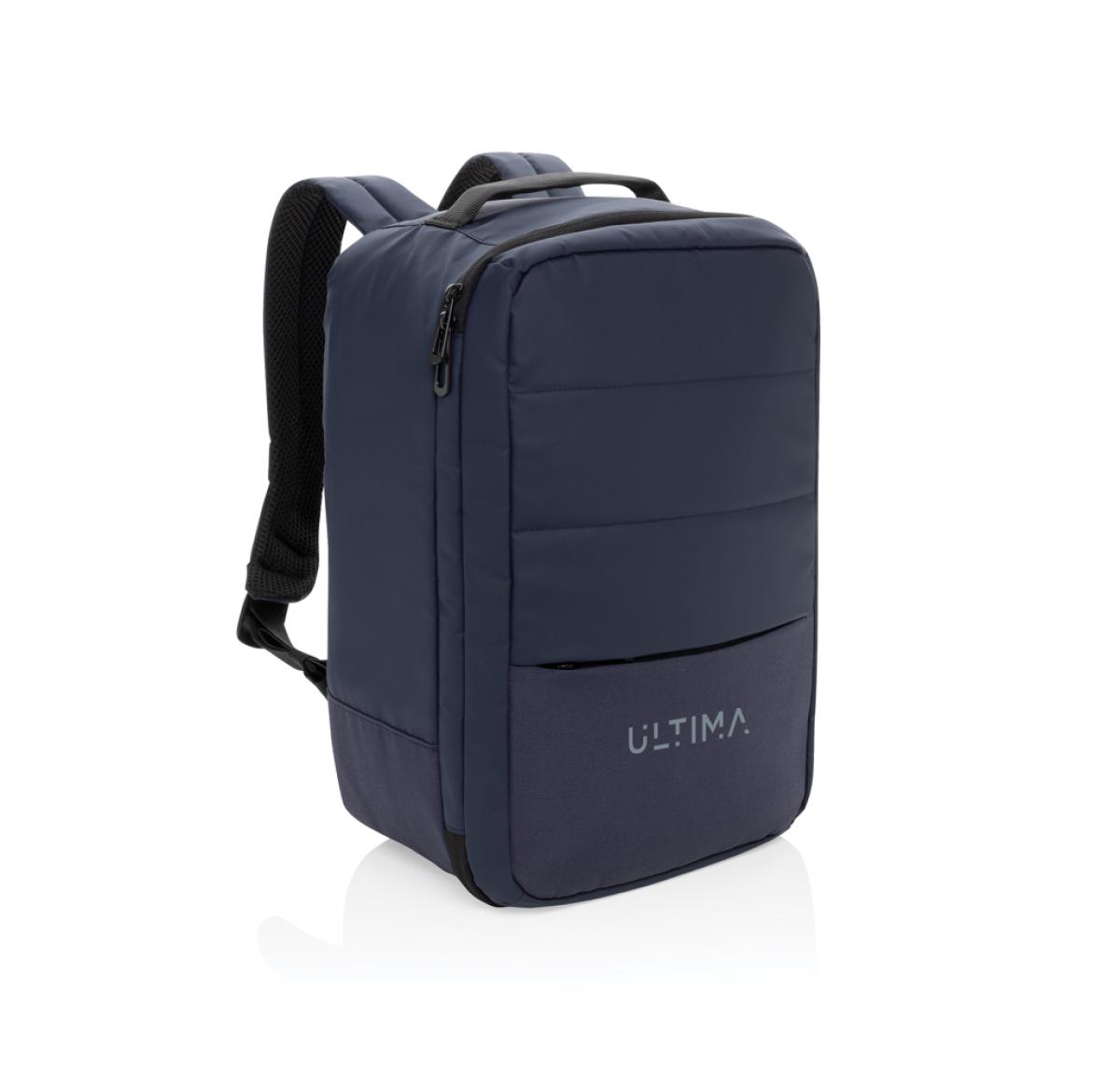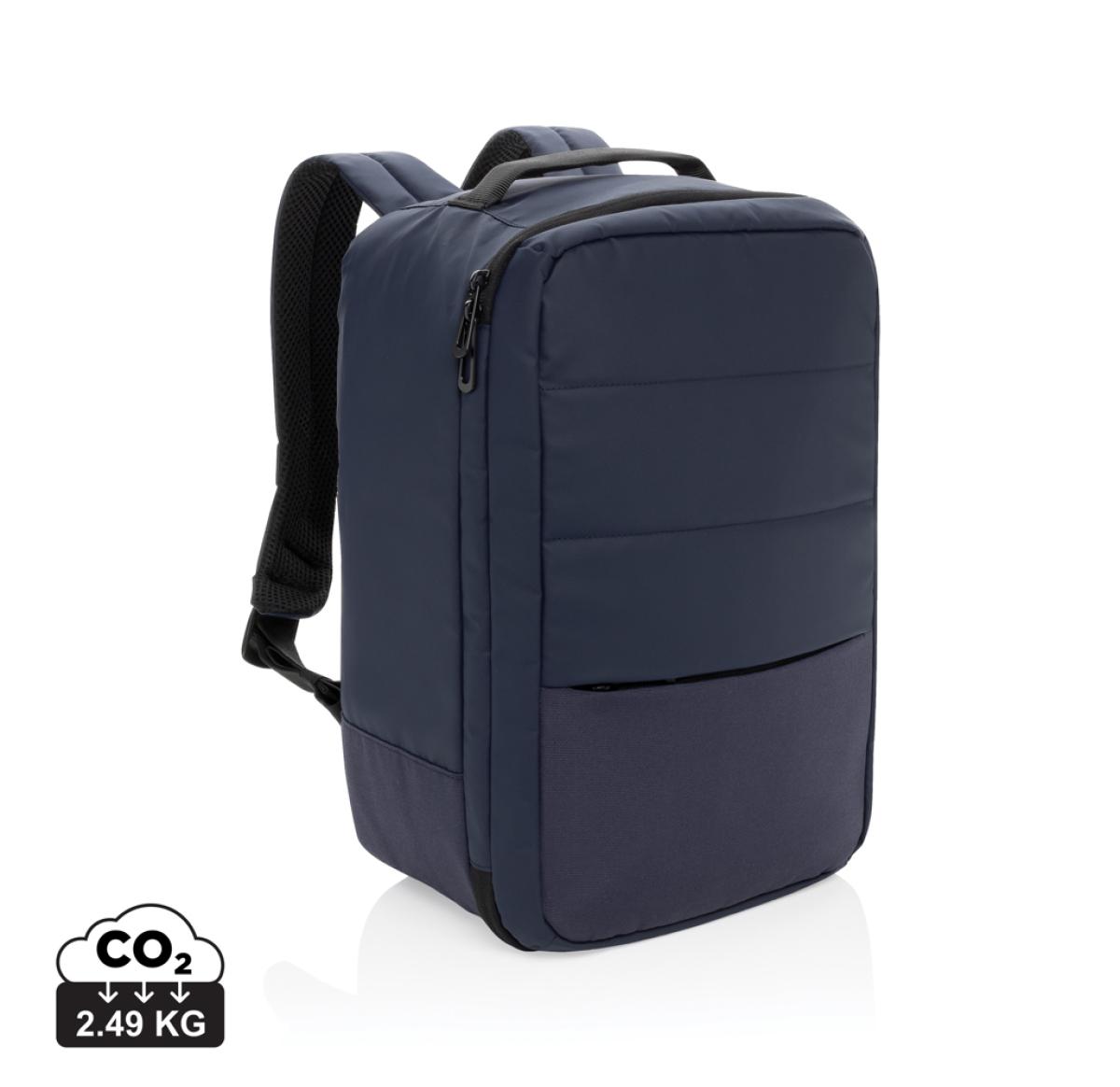 The Armond Aware™ RPET Free On Board Travel Pack is designed for the budget-conscious or short business traveller. Made from rPET with a PU water-resistant coating and backed with AWARE technology, this backpack features a 15 inch padded laptop compartment on the right side, perfect for MacBooks or smaller devices. The interior, lined with rPET, ensures your belongings stay organised, while the adjustable shoulder straps and sturdy webbing handle on top provide comfort and convenience. With a front zipper pocket and a mini trolley compartment complete with an elastic strap, this pack is perfect for business or weekend trips. Its compact size fits under any budget airline seat, so you won't have to worry about extra baggage fees. Made with recycled polyester embedded with the AWARE™ tracer. 2% of proceeds of each product sold with AWARE™ will be donated to Water.org. PVC free.