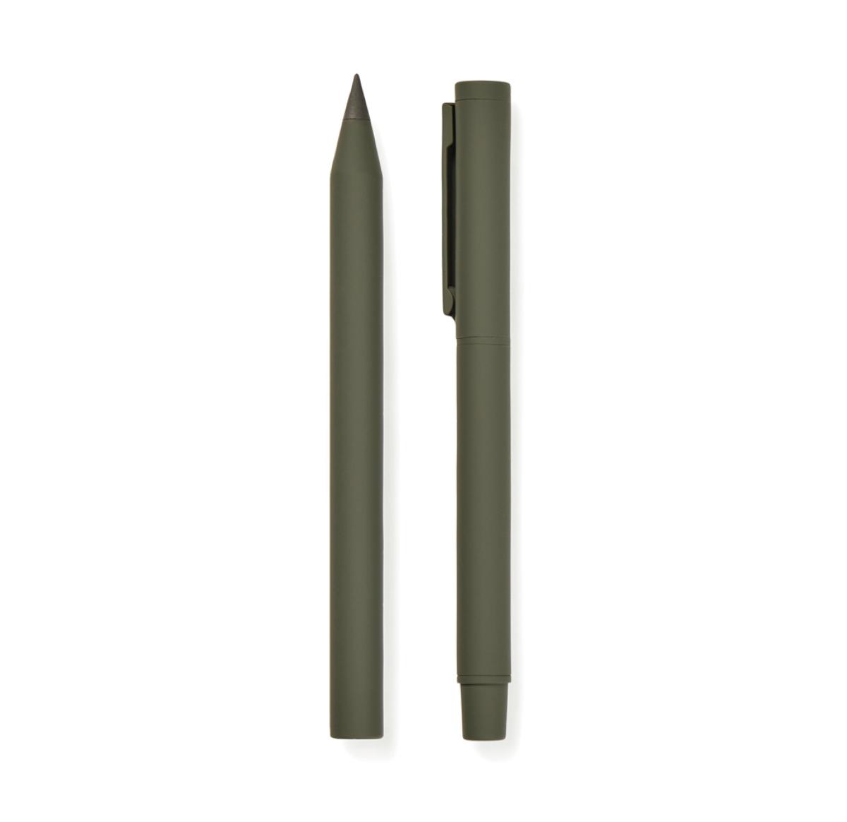 This modern and sleek set includes two pens: an eternal pen and a classic ballpoint pen with a cap and clip. Designed for both style and functionality, these pens are crafted from RCS certified recycled stainless steel, featuring a rubber surface coating for a comfortable grip and a matt finish. Both pens have a balanced weight that ensures stability and effortless writing. The eternal pen offers limitless writing. The ballpoint pen features a fine 1.00 mm tip and provides smooth, consistent writing with documental blue ink, lasting up to 1200 metres. Certified by RCS (Recycled Claim Standard), RCS certification guarantees that the entire supply chain of recycled materials is certified. The total recycled content is based on the overall product weight. This product contains 52% RCS certified recycled aluminum and 10% RCS certified stainless steel.