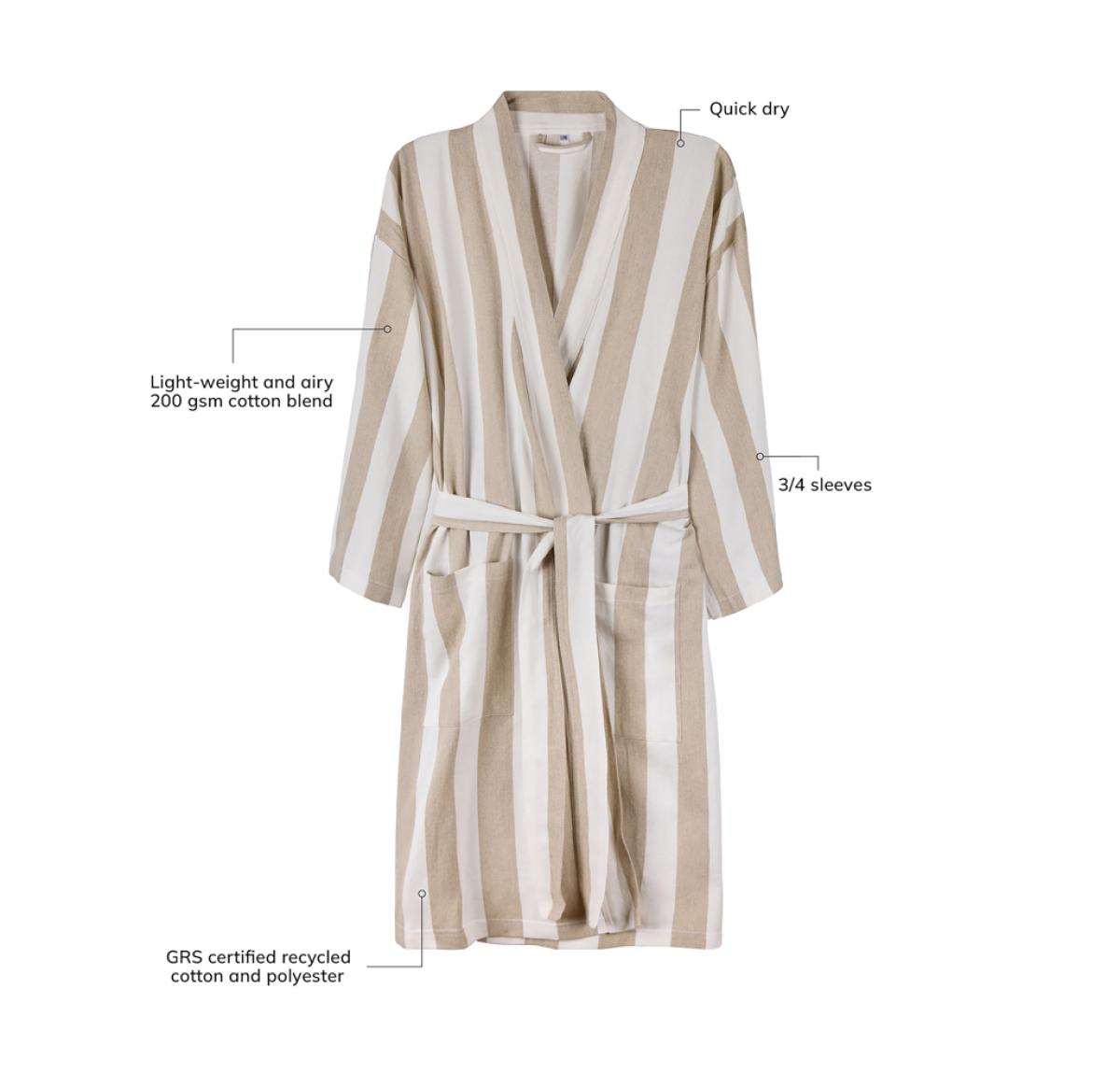 Bring this soft and comfortable hammam robe to the beach or simply enjoy it at home. Crafted from a lightweight and airy 200 gsm blend, it combines the comfort of cotton with the quick-drying benefits of polyester. Designed in a classic style with a two-tone striped pattern, it features a neat collar, front pockets, 3/4 sleeves, and a waist belt for a perfect fit. Certified by GRS (Global Recycled Standard), GRS certification guarantees that the entire supply chain of the recycled materials is certified. The total recycled content is based on the overall product weight. This product contains 69% GRS certified recycled cotton and 29% GRS certified recycled polyester.