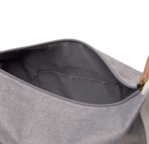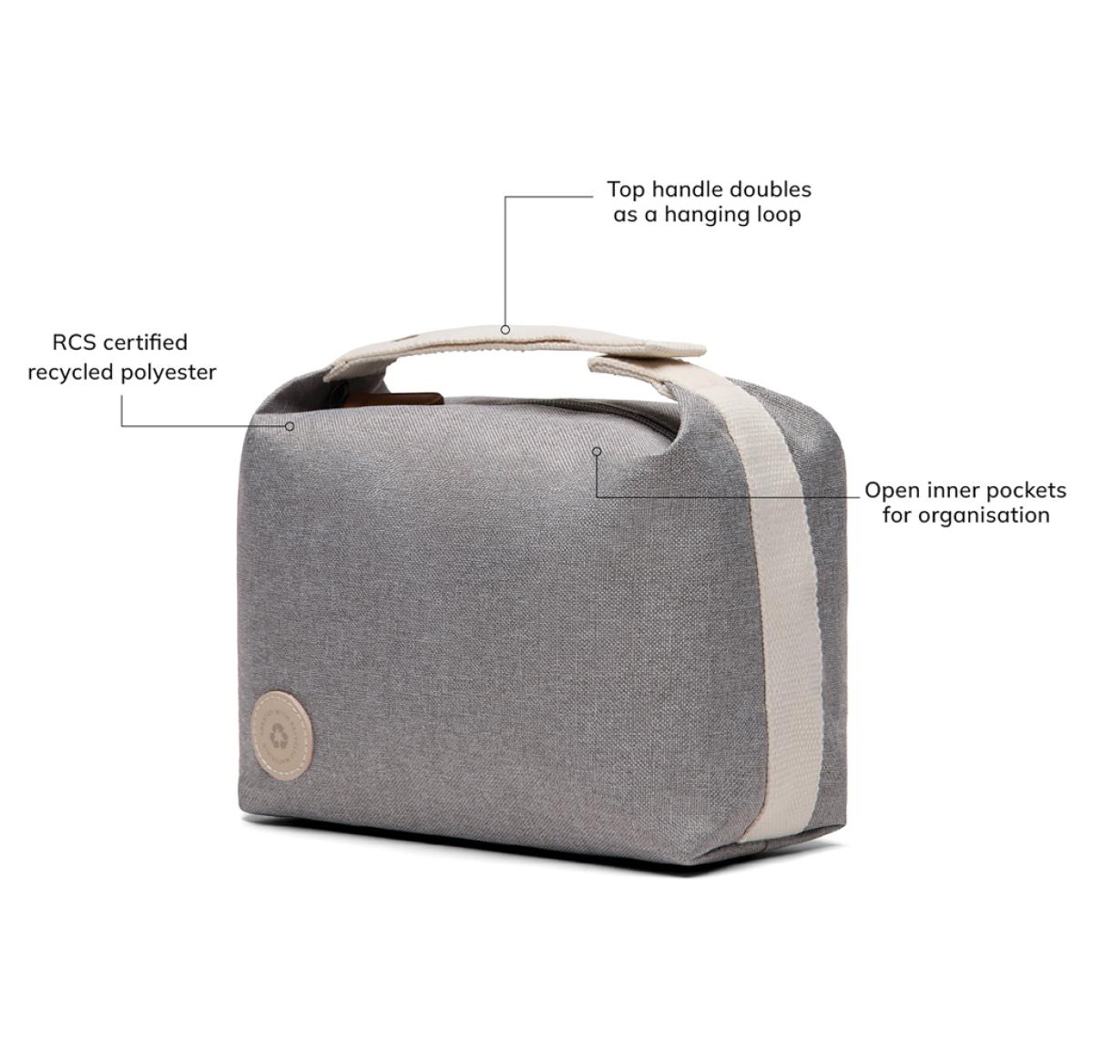 Elevate your travel essentials with this simple yet stylish toiletry bag. Crafted from RCS certified recycled polyester with contrasting details, this bag combines practicality with a refined design. The top handle, secured with a snap button, doubles as a convenient hanging loop. A smooth zipper at the top provides easy access to the main compartment, while the open inner pocket keeps your essentials organised. RCS (Recycled Claim Standard), RCS certification guarantees that the entire supply chain of recycled materials is certified. The total recycled content is based on the overall product weight. This product contains 24% RCS certified recycled polyester.