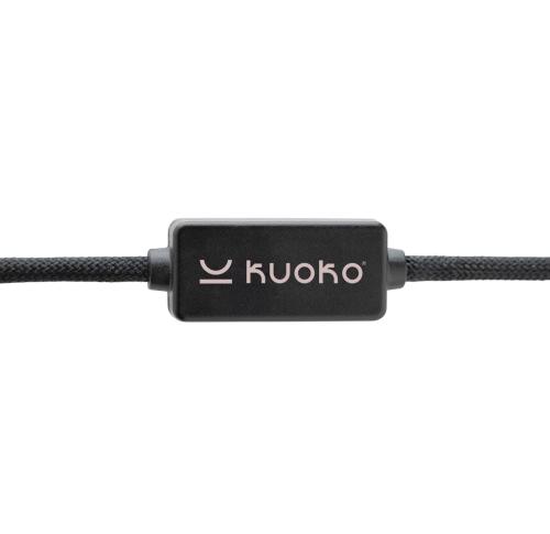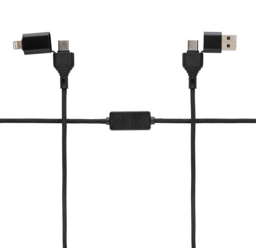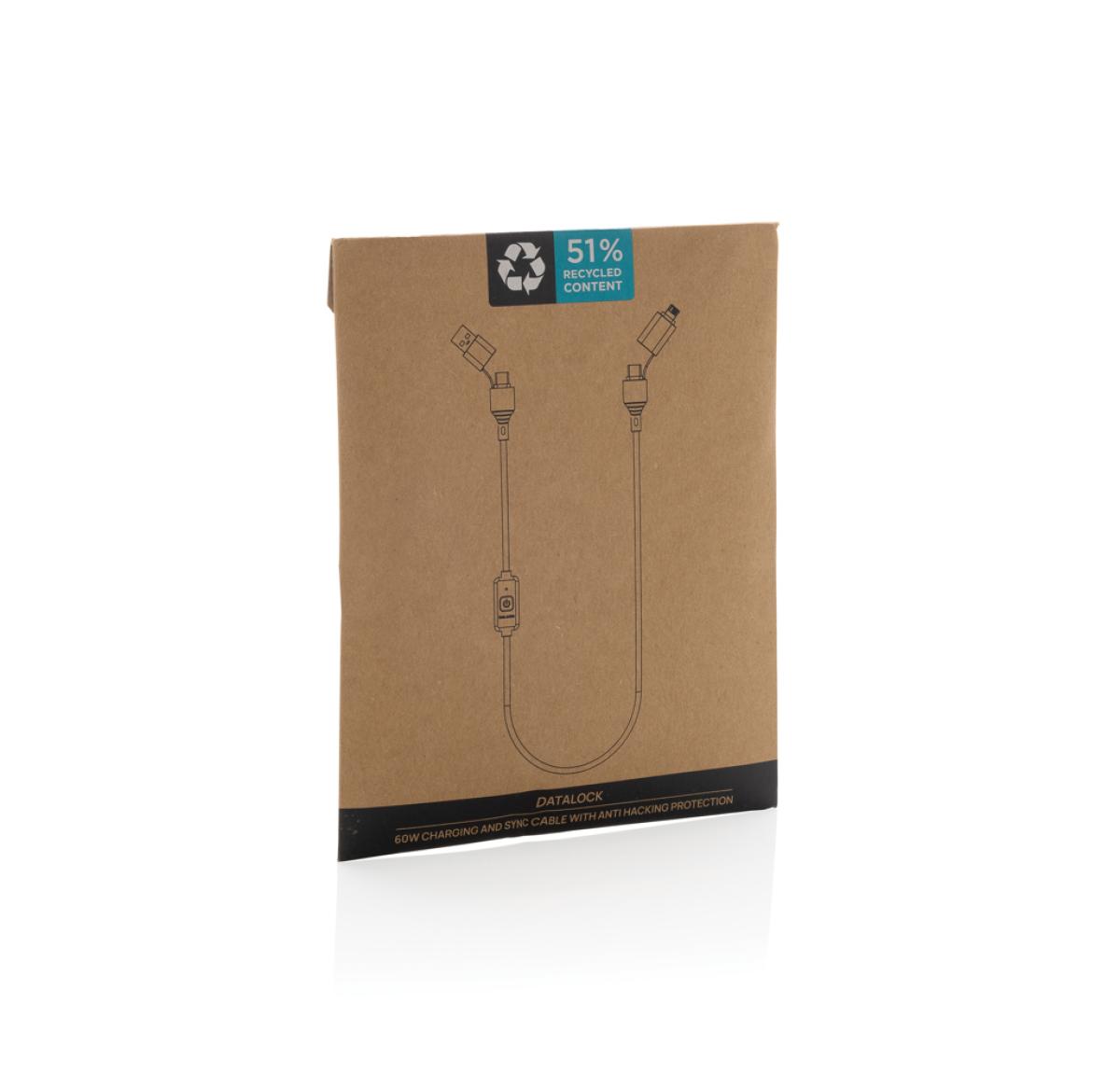 60W charging and data cable that can charge all your mobile devices at top speed and even supports laptop charging. The cable has a unique integrated button to switch off the data transfer function when using the cable in public to avoid data theft or hackers accessing your phone. Simply push the button to activate the protection mode. The cable is made with recycled TPE, PET, ABS and recycled aluminium. 120 CM long and supports Car play and Android auto (type C to type C only) . Total recycled content: 52% based on total item weight. RCS certification ensures a completely certified supply chain of the recycled materials. Packed in FSC mix packaging. PVC free.