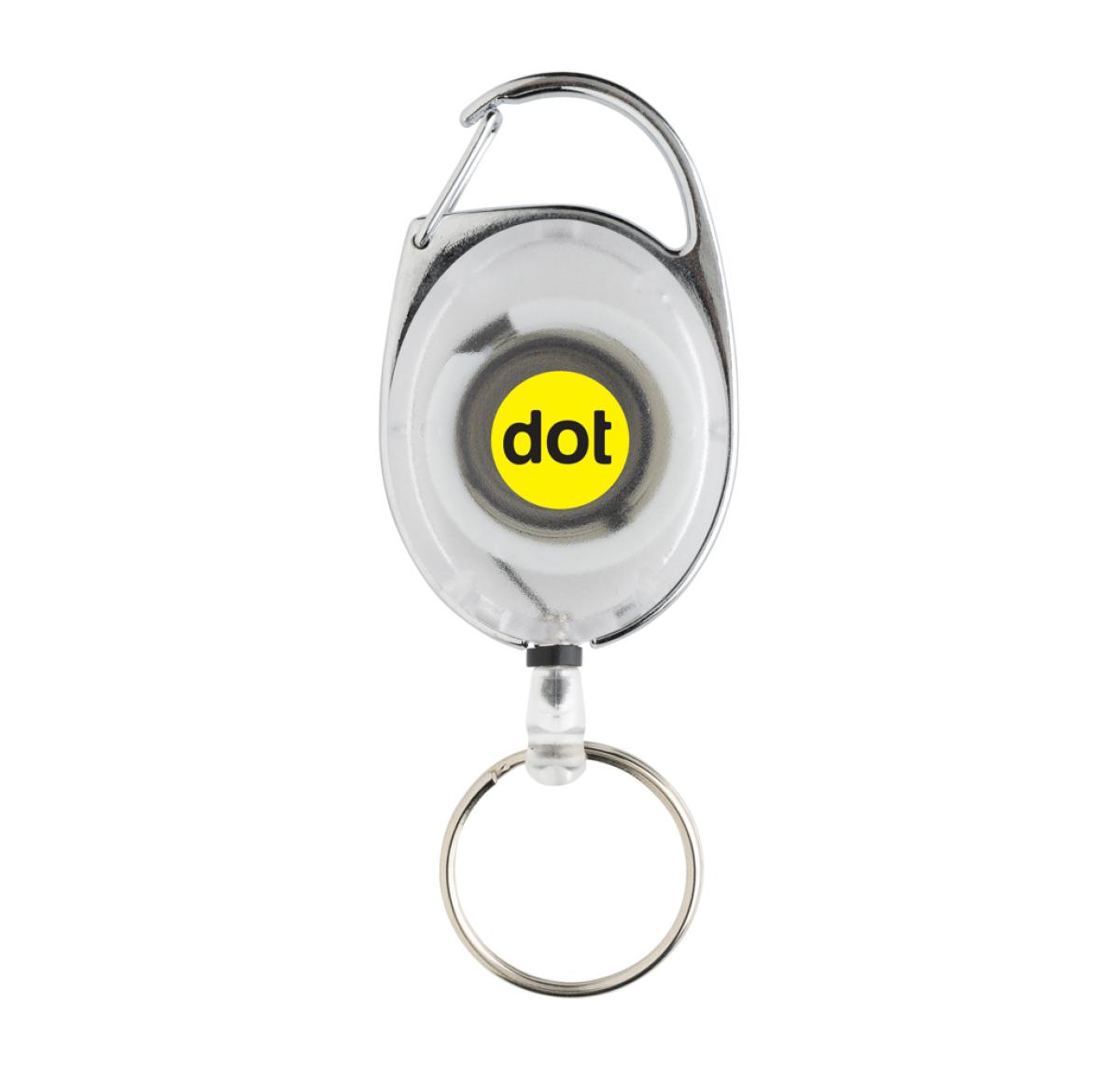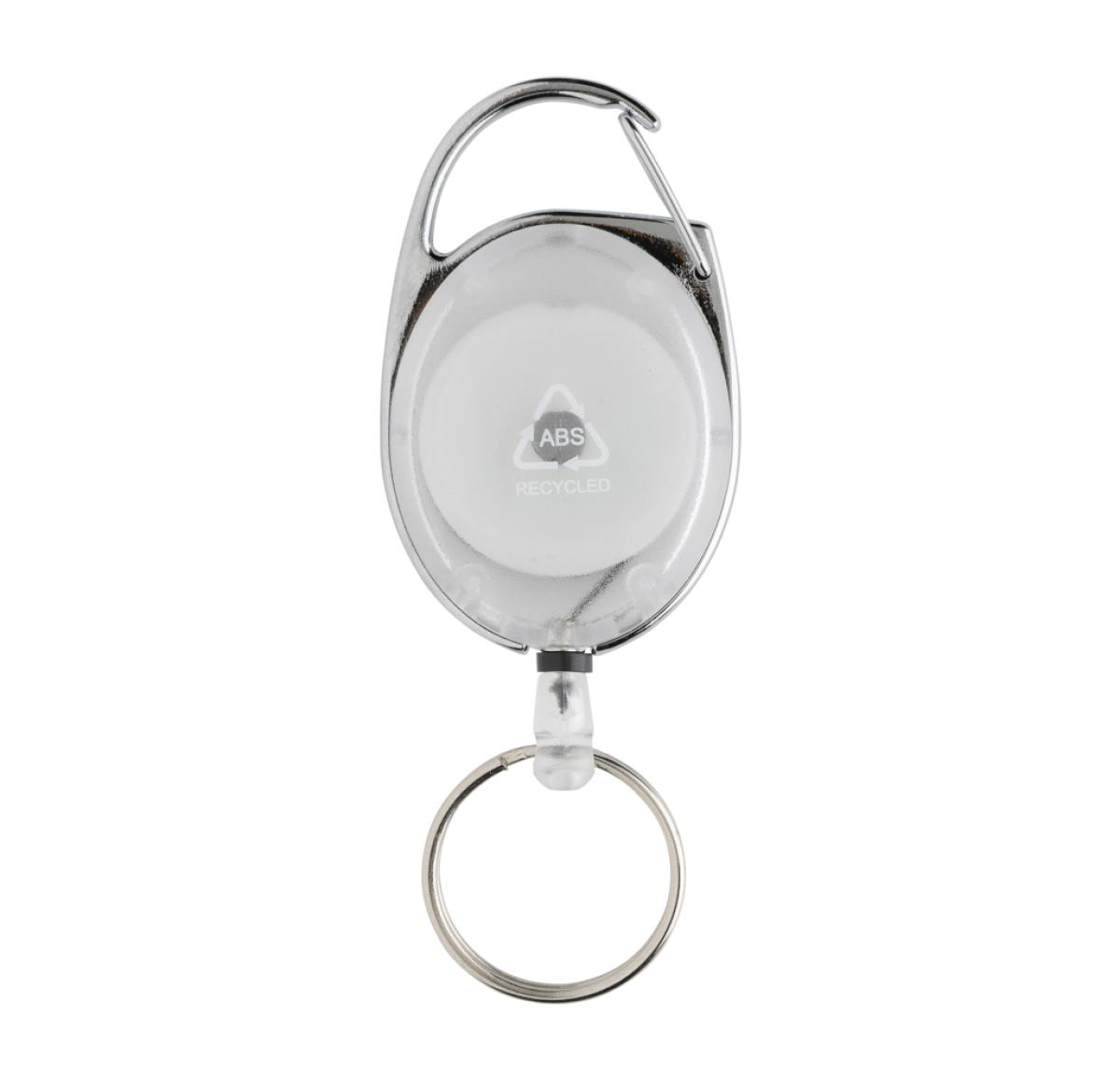 Roller clip keychain made with RCS recycled ABS and zinc alloy. Ideal item for office, trade show or even when skiing. With 60cm cord to attach badge for easy access. With carabiner hook to attach to bag or clothing. Total recycled content: 34% based on total item weight. RCS certification ensures a completely certified supply chain of the recycled materials. Packed in paper bag.