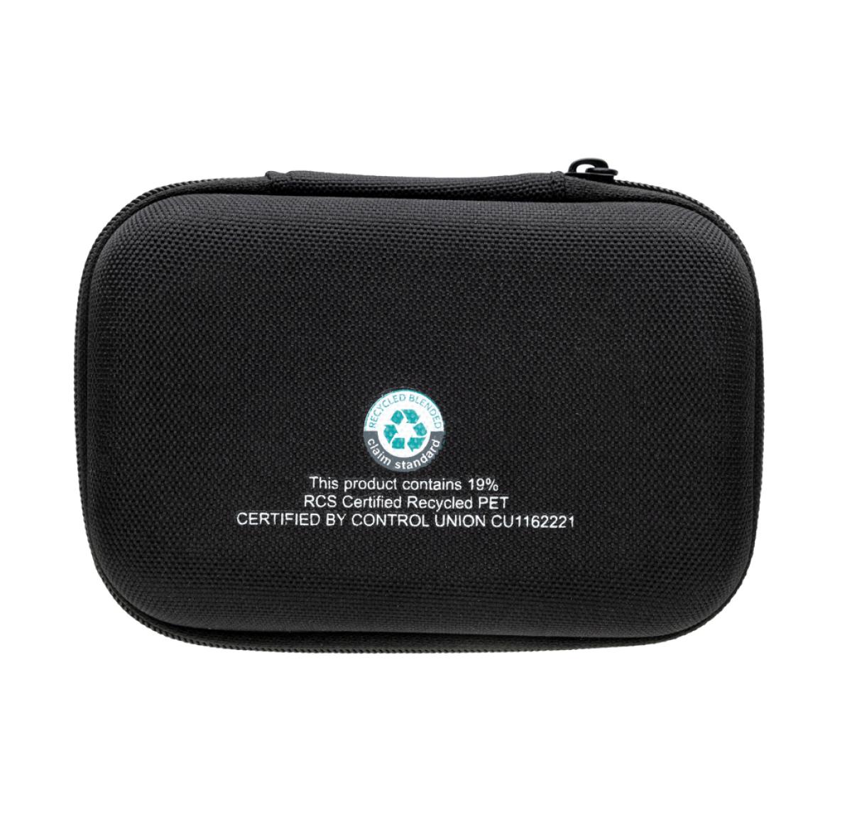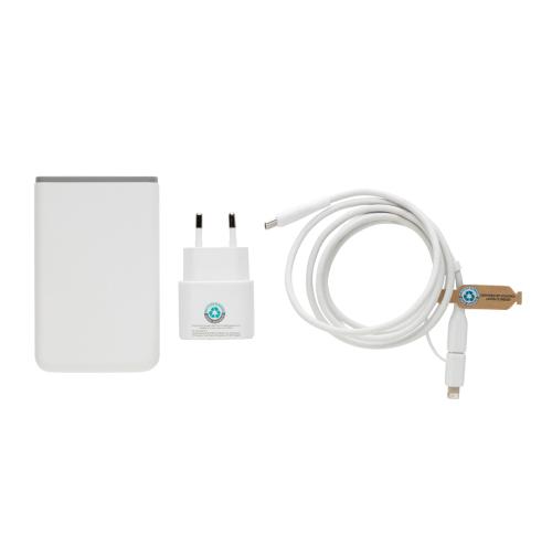 3 pcs 20W fast charging set for mobile devices and other small devices. With EU adapter with 20W USB C port, 5000 mAh powerbank and 120cm recycled TPE 60W fast charging cable (USB C to USB /Lightning). The cable supports data transfer and also charging of larger devices like laptops. Adapter, powerbank and cable made from RCS certified recycled PC, ABS and recycled TPE. Packed in pouch made from RCS certified recycled PET. Total recycled content of whole set: 59% based on total item weight. RCS certification ensures a completely certified supply chain of the recycled materials. Packed in FSC® packaging. PVC Free. Input wall charger AC 100-240V 50/60Hz 0.6A; Output wall charger USB-C :5.0V?3.0A,9.0V?2.22,12.0V?1.67A (20W Max). Output powerbank 5V?2.4A -USB-C Input: 5V?2.4A