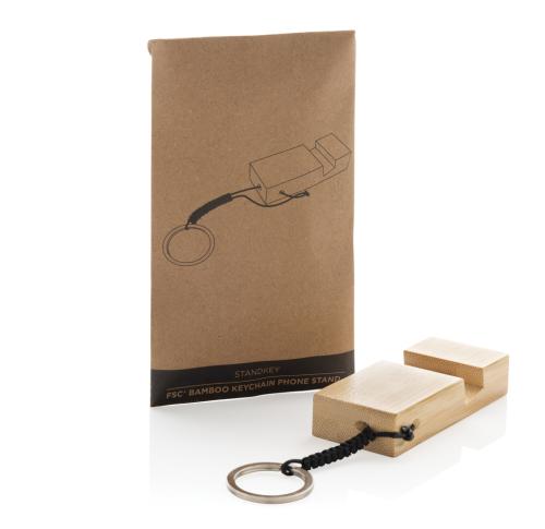 FSC® 100% certified bamboo phone stand keychain. With fabric rope and metal keyring. Convenient so you always have a phone stand with you when you do a call or want to watch a movie. Packed in plastic free envelope packaging.