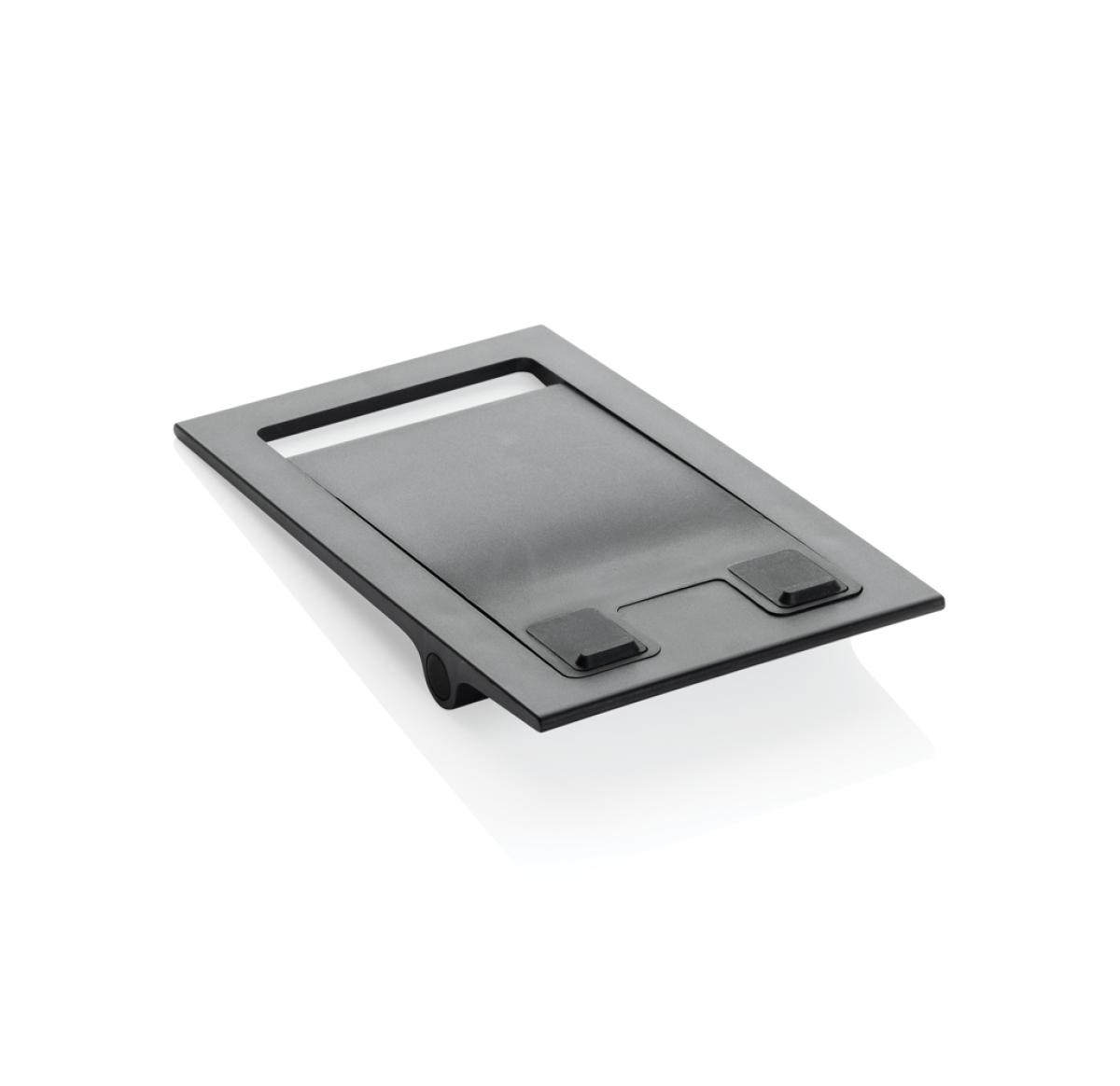 Flat and foldable phone stand made from RCS recycled ABS. The stand comes flat and folded and can be unfolded into a phone stand that can carry all size phones. The stand is strong enough to adjust the viewing angle. With silicon cushioning to keep your phone in optimal condition. Total recycled content: 85% based on total item weight. RCS certification ensures a completely certified supply chain of the recycled materials. Packed in FSC® packaging. PVC Free.