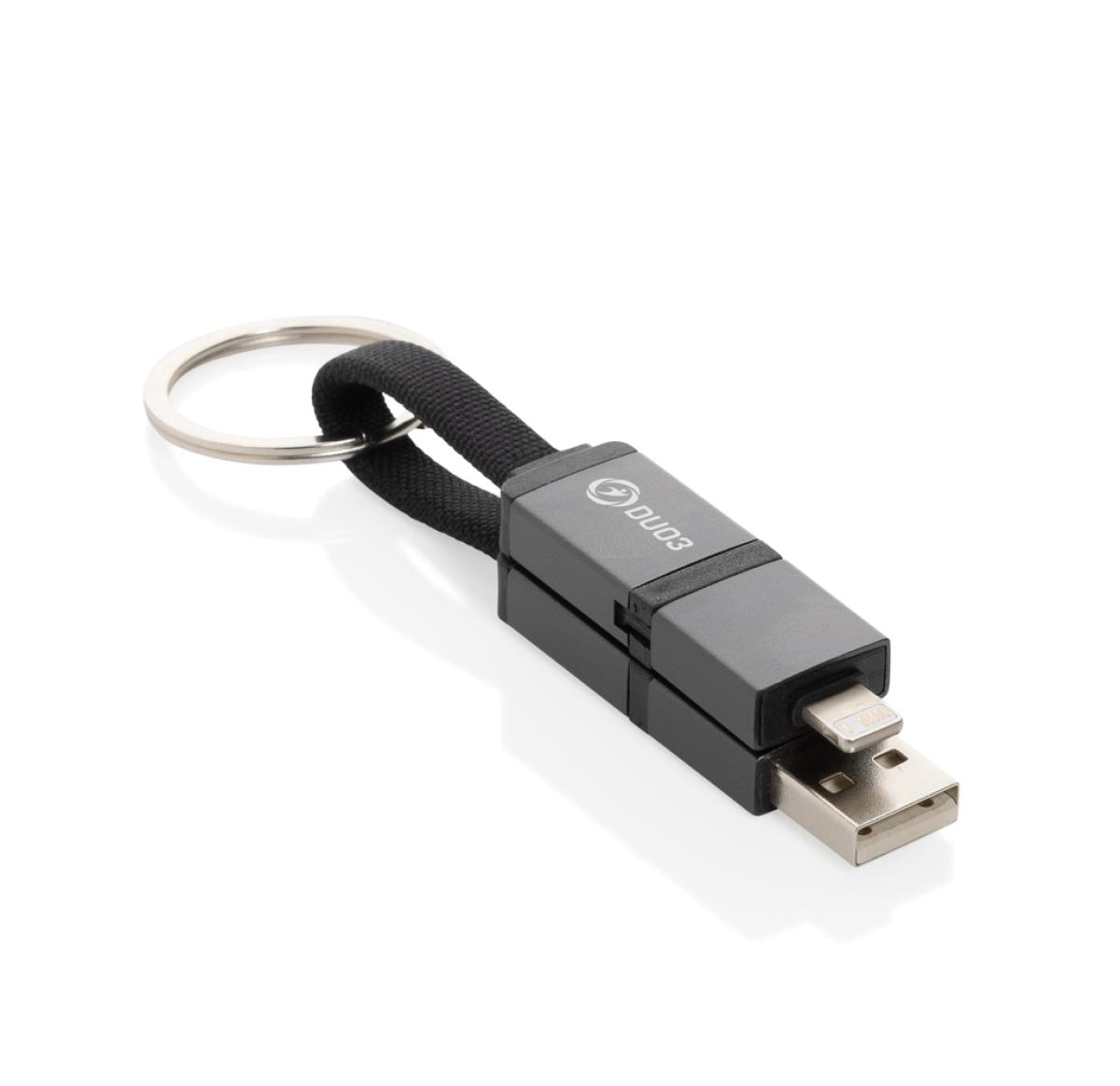 Fast charging 4-in-1 keychain cable made from RCS recycled TPE, recycled aluminium alloy and recycled PET. With USB A and type C input and IOS and Type C output it is suitable to charge many types of items. This small size cable supports a boosting 60W fast charge. Easy to attach to your keychain with included keychain ring. The connectors have magnets inside to keep them together while carrying them. Total recycled content: 60% based on total item weight. RCS certification ensures a completely certified supply chain of the recycled materials. Max supported current 20V/3A; Packed in plastic free envelope packaging. PVC free.