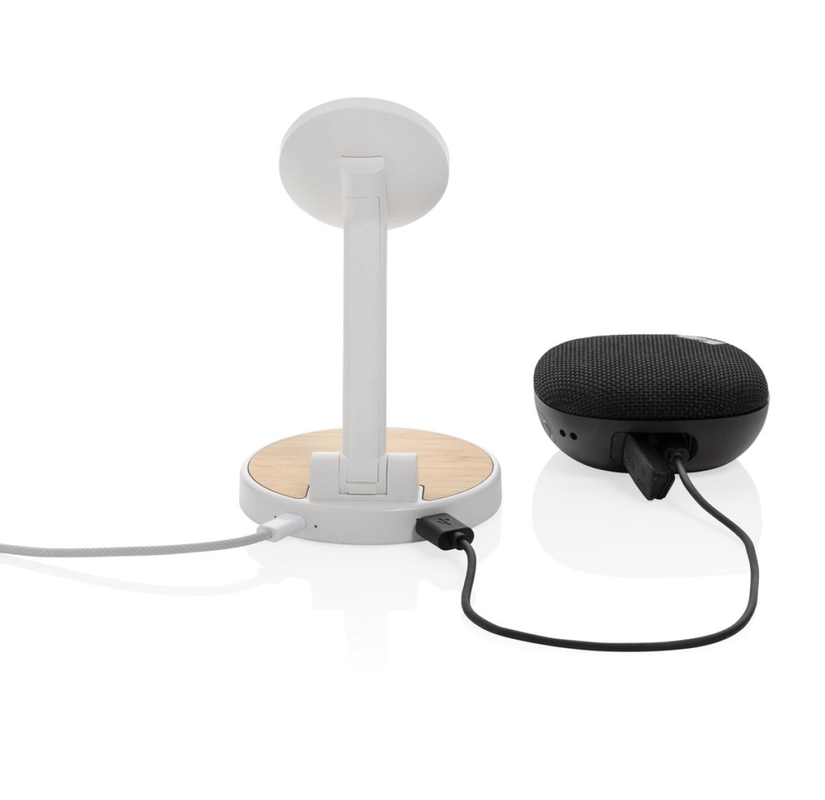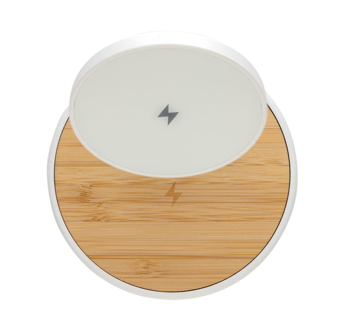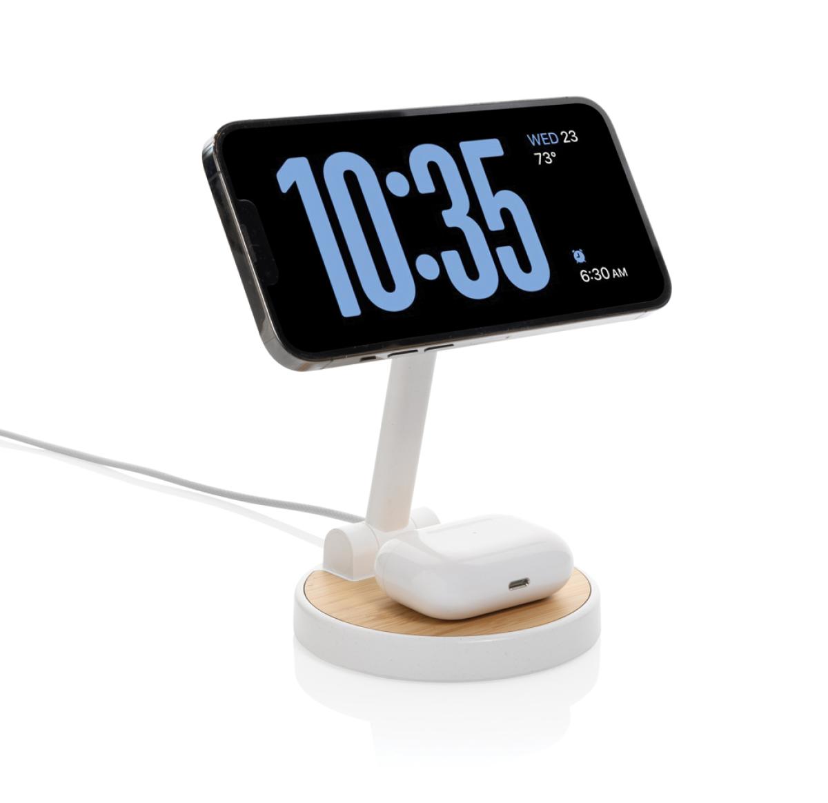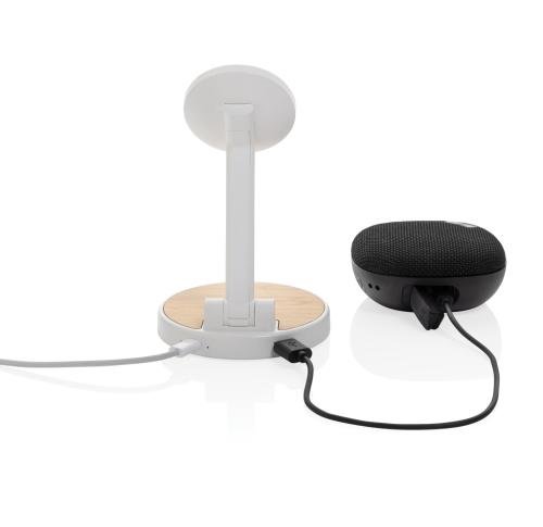 15W 2-in-1 fast wireless charger with magnetic charging made with with RCS (Recycled Claim Standard) certified recycled ABS. Total recycled content: 30% based on total item weight. RCS certification ensures a completely certified supply chain of the recycled materials. Bamboo wireless charging area made from FSC 100% bamboo. With magnetic 15W charger and one 5W charger for other wireless chargeable items like earbuds. With one USB A port to charge items via cable. Item and accessories PVC free. Including 120cm type C charging cable made from RCS certified recycled TPE. Packed in FSC mix kraft box. 9V/3A; W: 9V/1.1A; 9V/1.67 A/(15W), Earbuds: 5V/1A (5W), USB output 5V / 2.1A. PVC free.