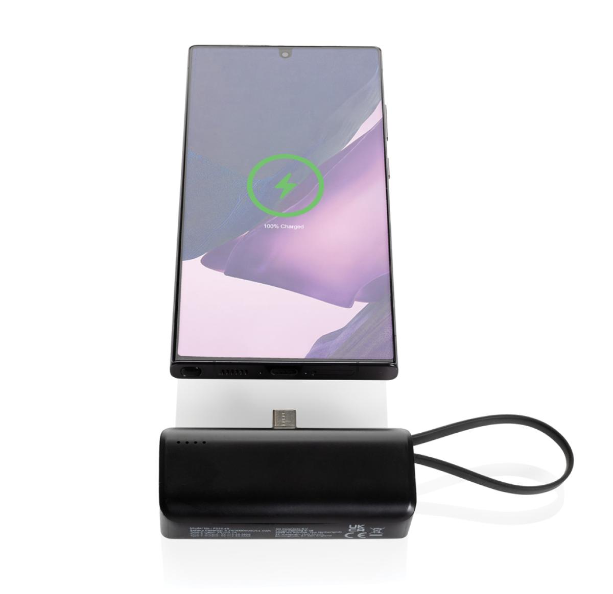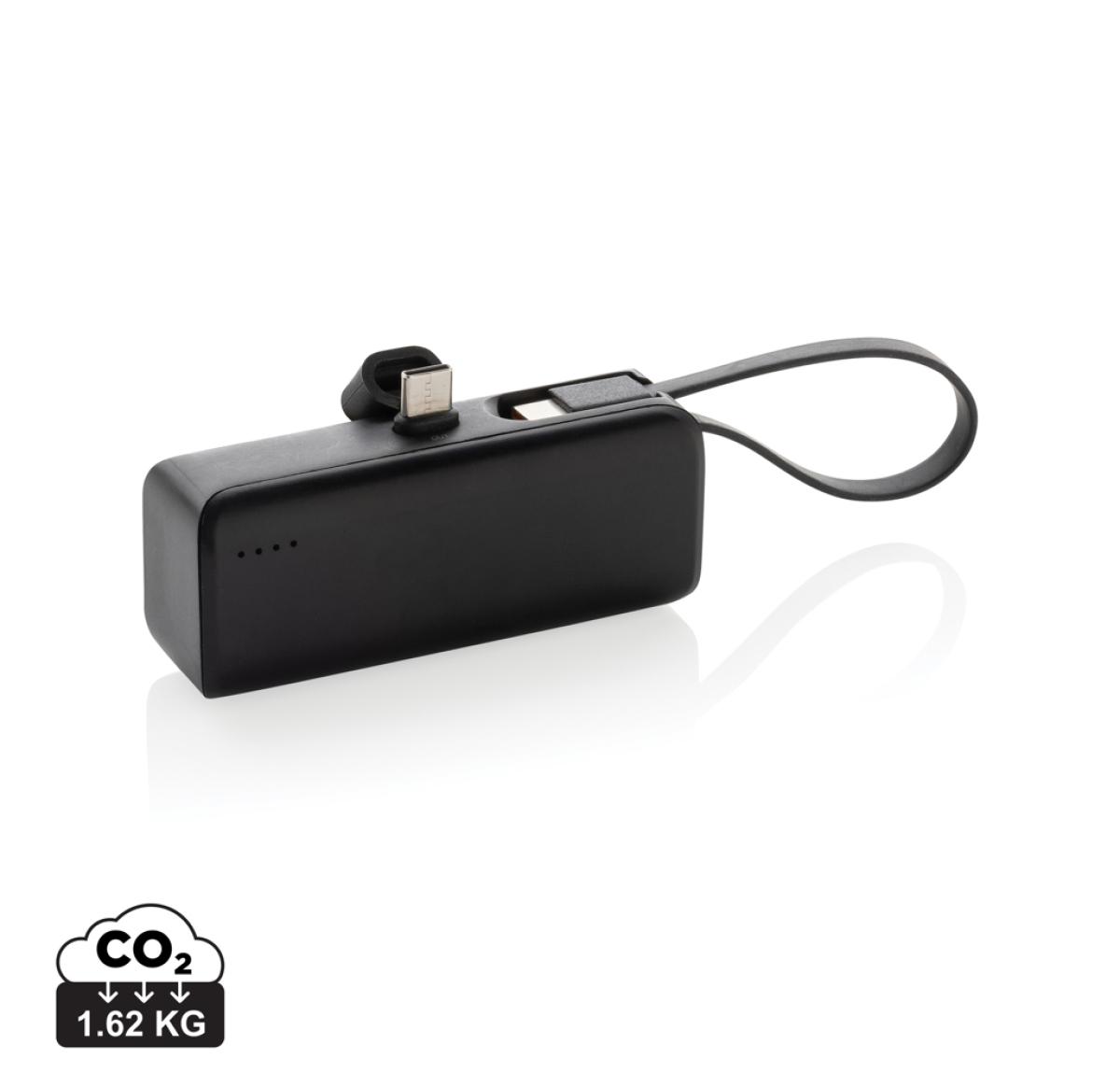 Portable and pocket size powerbank that’s easy to bring on the go. The powerbank comes with a type C connector plug that you can easily connect to your newest iPhone (15 and up) or Android phone to start charging direct. The 3000 mAh powerbank has an integrated USB C input and output cable that can be used to charge other USB C items and to re-charge the powerbank. No need to carry any cables to use or re-charge this powerbank. Made with recycled ABS and recycled TPE. Total recycled content: 19% based on total item weight. RCS certification ensures a completely certified supply chain of the recycled materials. Packed in FSC® packaging. PVC Free. Input: 5V/2.1A Output 5V/2.4A.