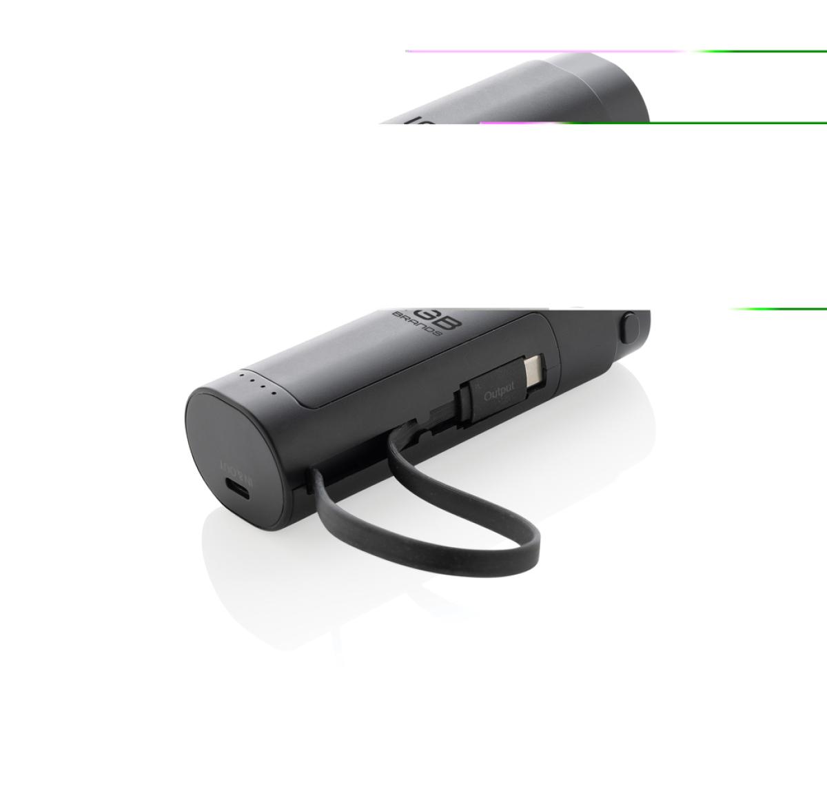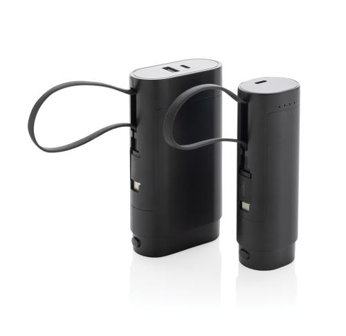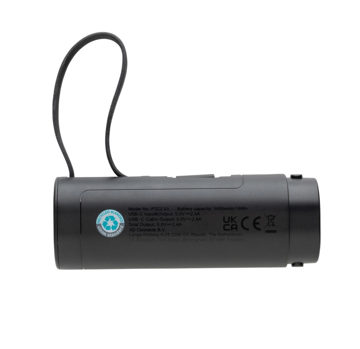 Unique design powerbank that is designed to stimulate recycling of the battery at the end of the products life cycle. Simply open the powerbank and remove the a-grade battery for safe and responsible battery recycling. The 5000 mah powerbank comes with an integrated type C cable that you can easily connect to your device to start charging direct. The cable can also be used to charge the powerbank itself. With one additional type C port to connect your own charging cable. Made with recycled ABS and recycled TPE. Total recycled content: 30% based on total item weight. RCS certification ensures a completely certified supply chain of the recycled materials. Packed in FSC® kraft packaging. PVC Free. Input: 5V/2.1A Output 5V/2.4A.