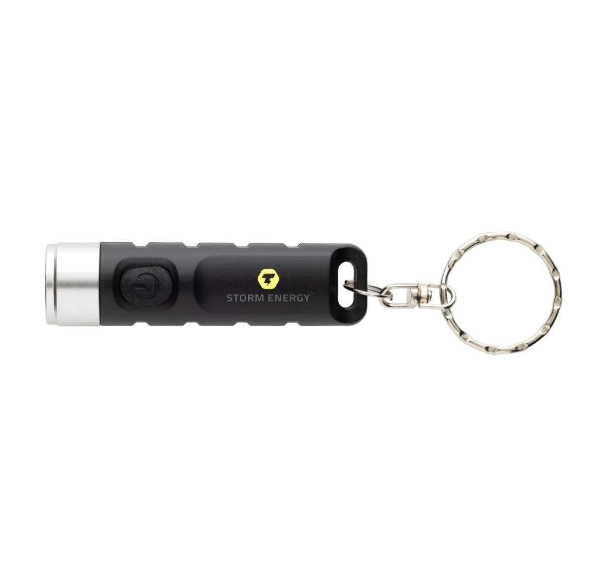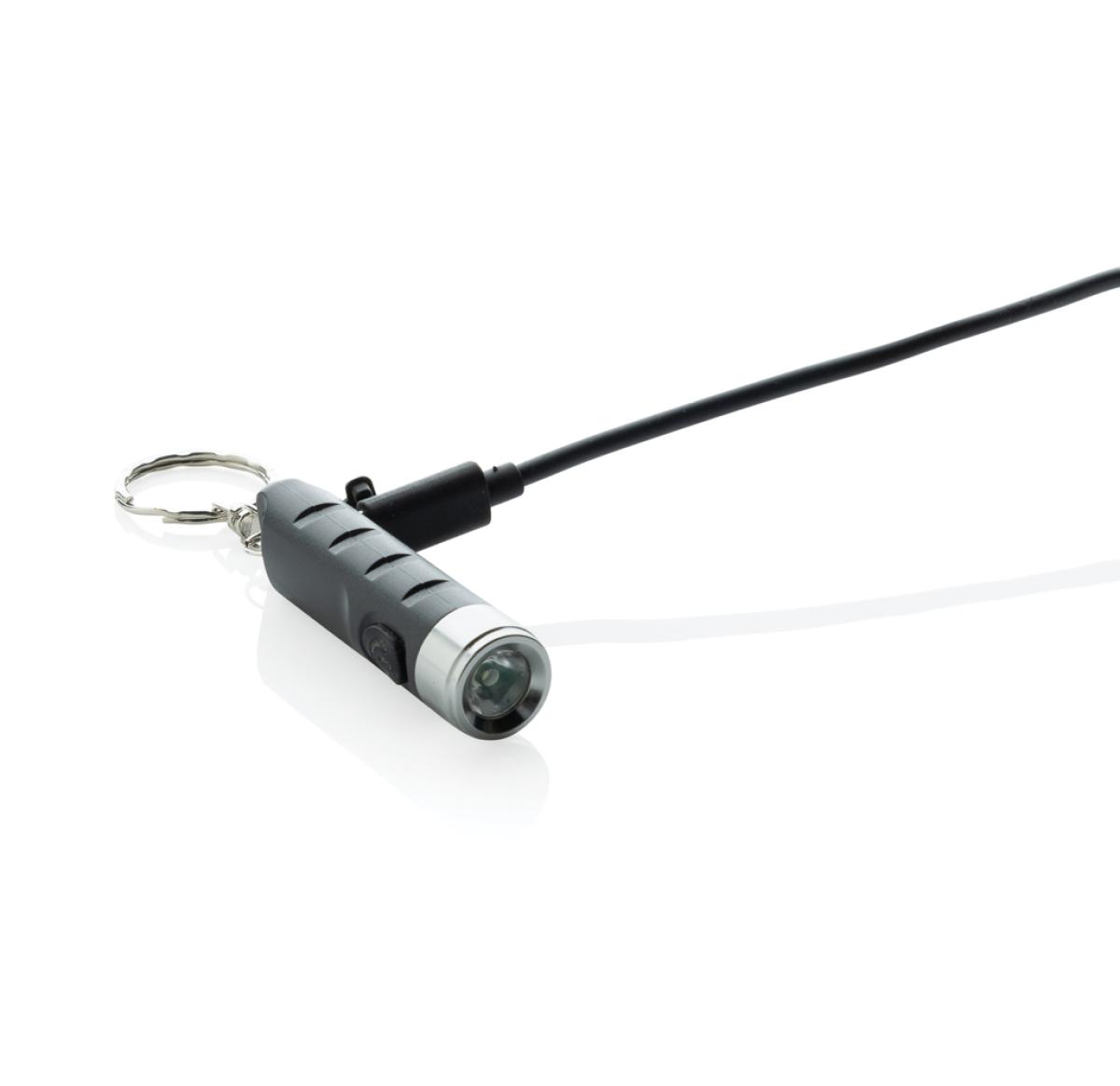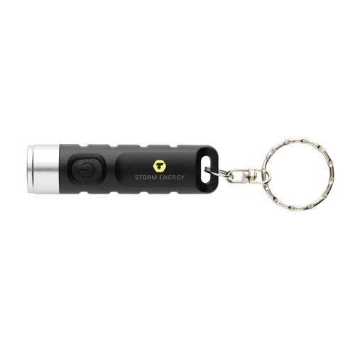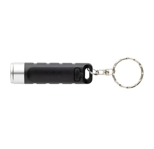 USB re-chargeable keychain torch made with RCS recycled ABS. The 1 LED keychain supports up to 3 hour of usage on one single charge . When depleted it can easily be re charged via type C input. With 155 mAh battery. The torch has 3 light modes (Strong, medium and flashing) Beam distance up to 10 metres. Packed in plastic FSC mix box. Total recycled content: 33% based on total item weight. RCS certification ensures a completely certified supply chain of the recycled materials. PVC free. Including recycled TPE type C charging cable.