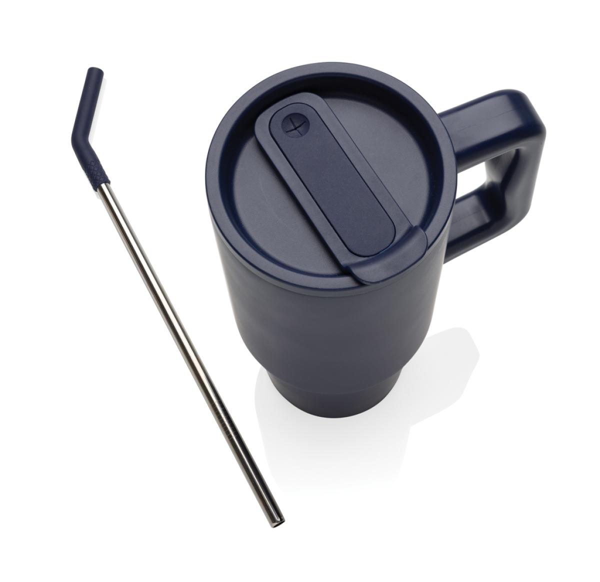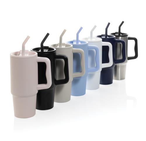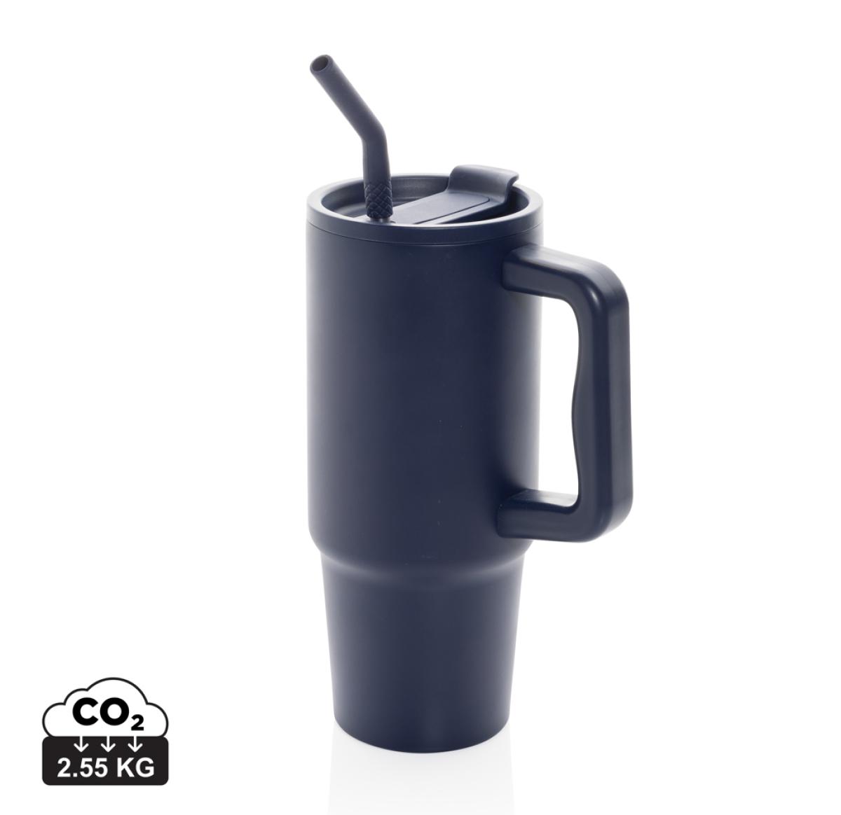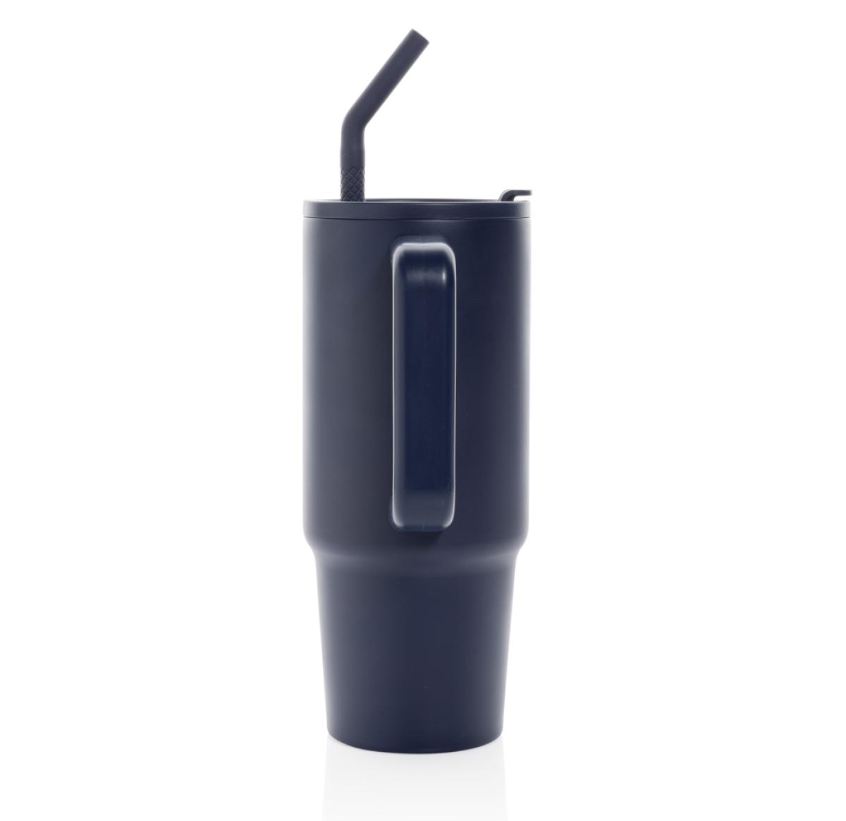 Experience the spacious yet conveniently portable embrace of our generously sized tumbler – not too big, not too small. Its comfort-grip handle and slim base make it a perfect fit for most cup holders, ensuring you stay refreshed whether you're enduring a long day of meetings, conquering a rowing class, or embarking on a trip out of town. Crafted from durable recycled stainless steel, this 900 ml. tumbler rises to the hydration challenge. This double-walled, vacuum-insulated tumbler comes complete with a spill secure lid, recycled steel straw, and a silicone straw tip. The screw-on lid boasts a dual function, offering a convenient drinking spout or the option to use a straw. We recommend handwash. RCS certification ensures a completely certified supply chain of the recycled materials. Total recycled content: 70% based on total item weight. BPA free.