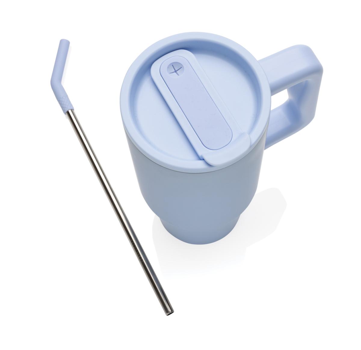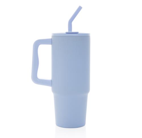 Experience the spacious yet conveniently portable embrace of our generously sized tumbler – not too big, not too small. Its comfort-grip handle and slim base make it a perfect fit for most cup holders, ensuring you stay refreshed whether you're enduring a long day of meetings, conquering a rowing class, or embarking on a trip out of town. Crafted from durable recycled stainless steel, this 900 ml. tumbler rises to the hydration challenge. This double-walled, vacuum-insulated tumbler comes complete with a spill secure lid, recycled steel straw, and a silicone straw tip. The screw-on lid boasts a dual function, offering a convenient drinking spout or the option to use a straw. We recommend handwash. RCS certification ensures a completely certified supply chain of the recycled materials. Total recycled content: 70% based on total item weight. BPA free.