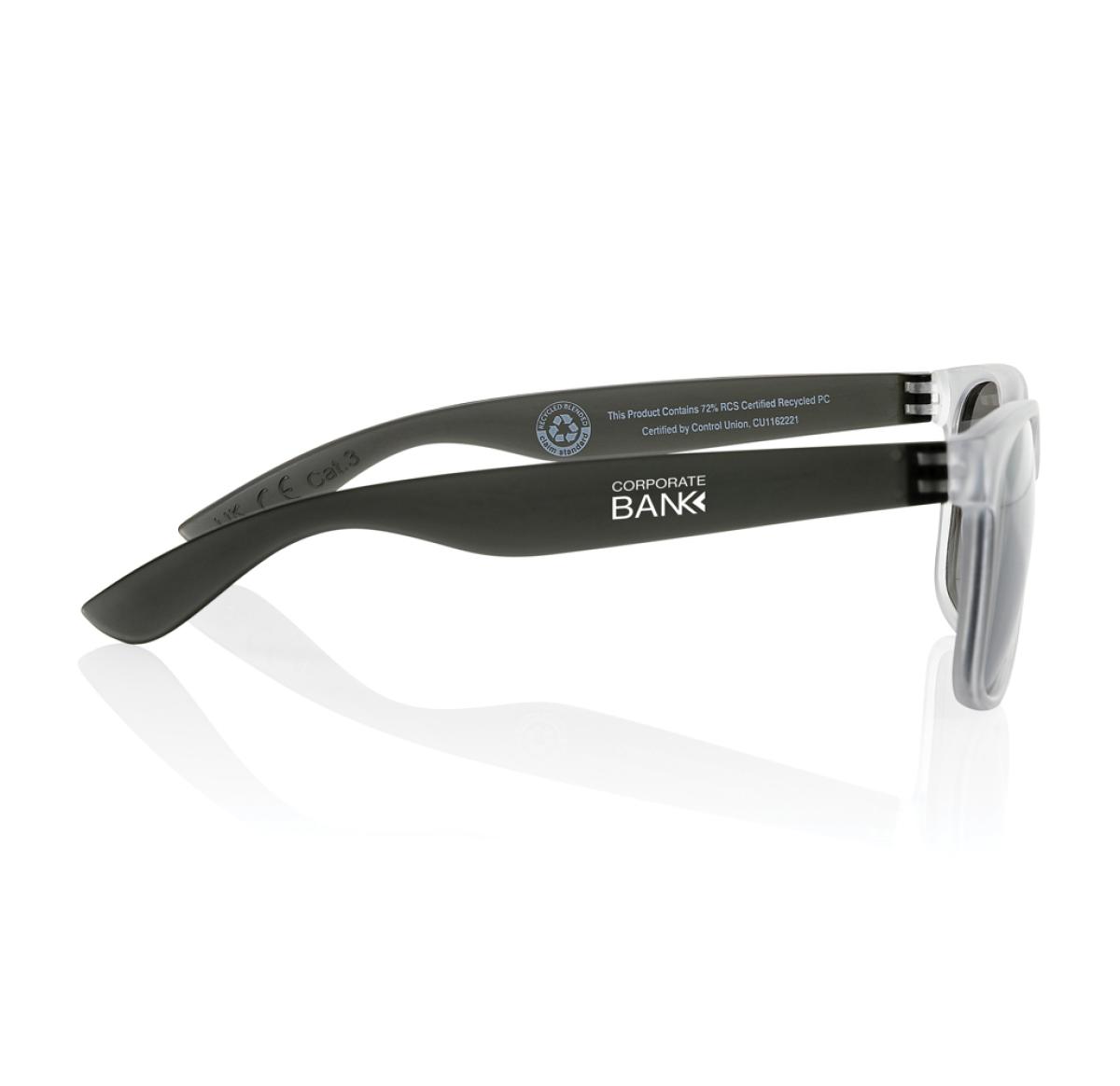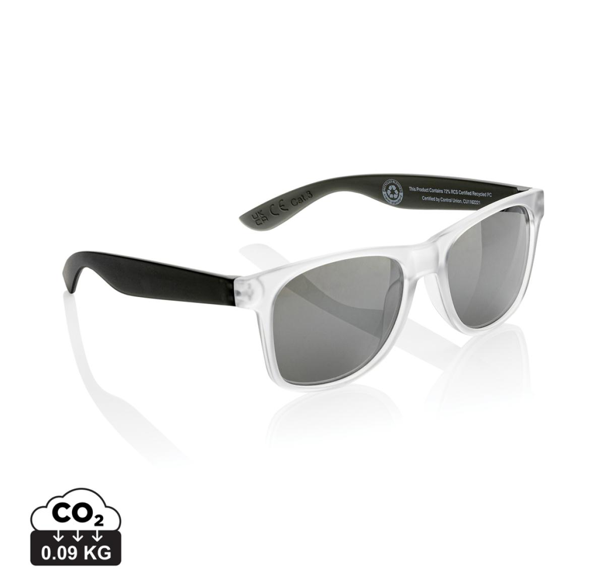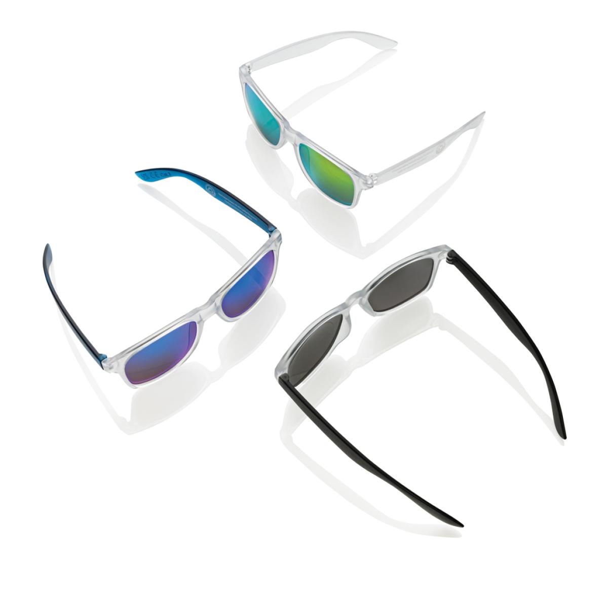 Sunglasses made with RCS certified recycled transparent PC frame. With colored mirrored lenses. Total recycled content: 72% based on total item weight. RCS certification ensures a completely certified supply chain of the recycled materials. The lenses are conform EN ISO 12312-1,UV 400 and CAT 3. Packed in a FSC® kraft box.