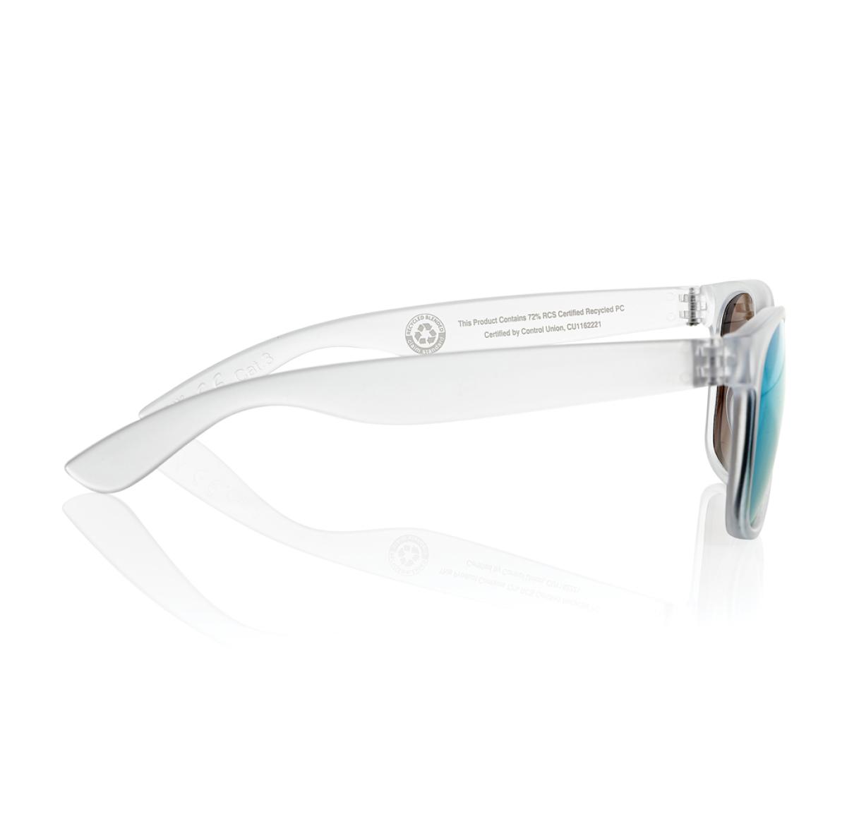 Sunglasses made with RCS certified recycled transparent PC frame. With colored mirrored lenses. Total recycled content: 72% based on total item weight. RCS certification ensures a completely certified supply chain of the recycled materials. The lenses are conform EN ISO 12312-1,UV 400 and CAT 3. Packed in a FSC® kraft box.
