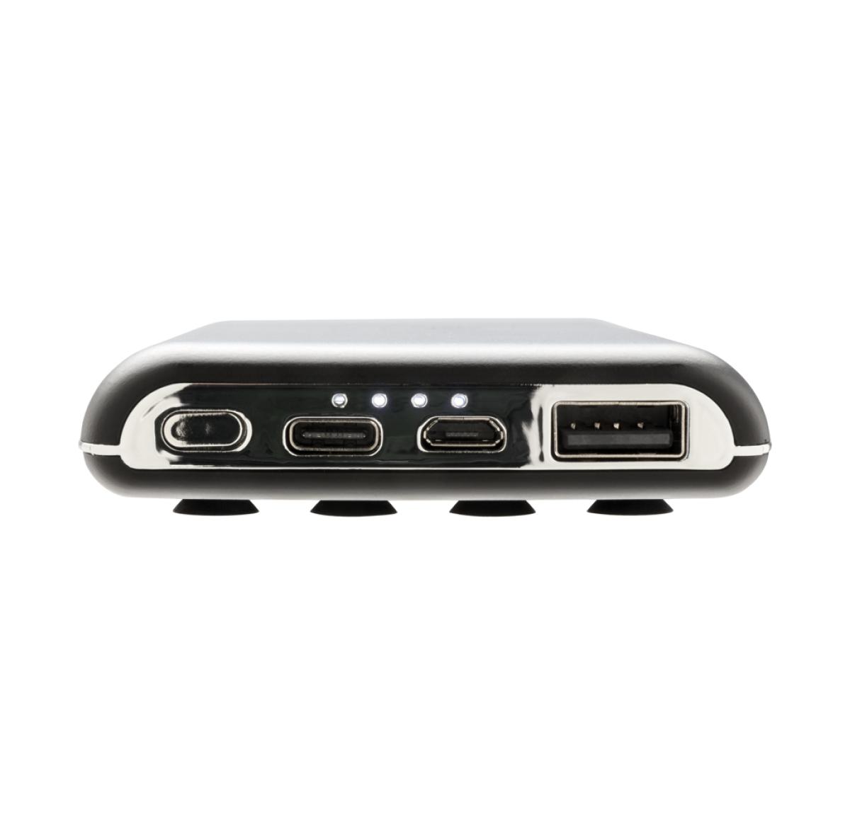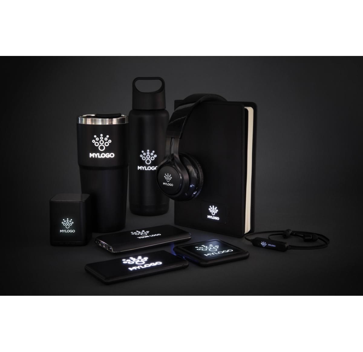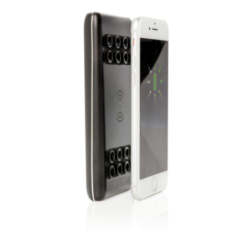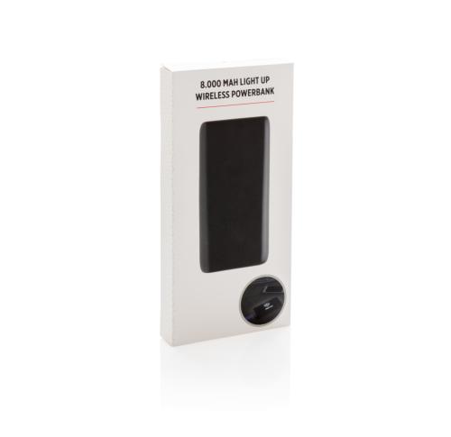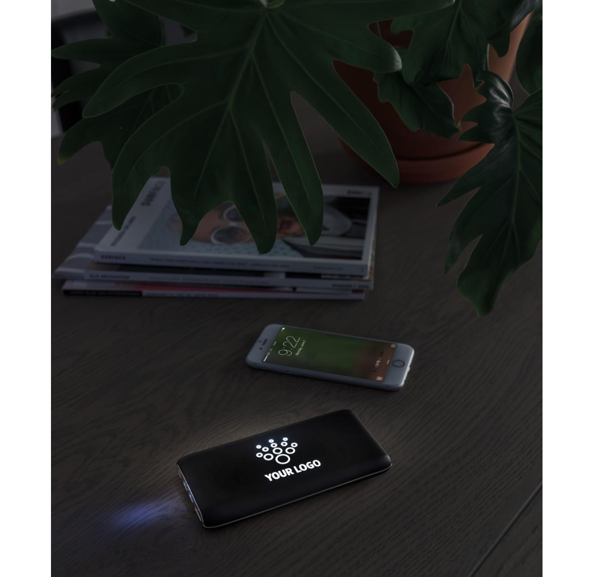 Flat and durable powerbank with 8.000 mAh lithium polymer battery. The wireless ABS powerbank has the option for an engraved logo on the front panel. When using the powerbank the logo will light up, highlighting your brand in a great way. The powerbank ha