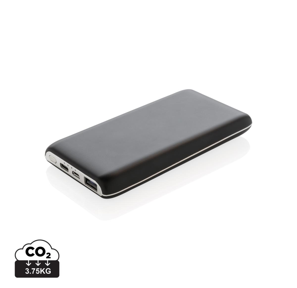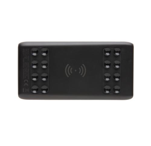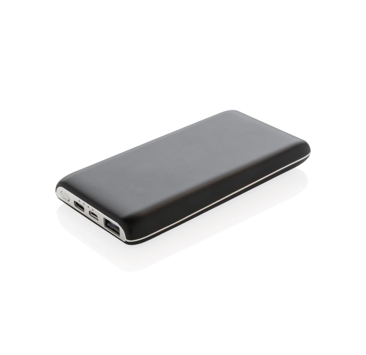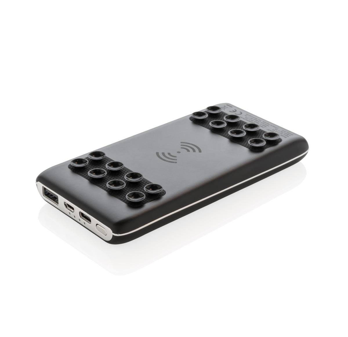 Flat and durable powerbank with 8.000 mAh lithium polymer battery. The wireless ABS powerbank has the option for an engraved logo on the front panel. When using the powerbank the logo will light up, highlighting your brand in a great way. The powerbank ha