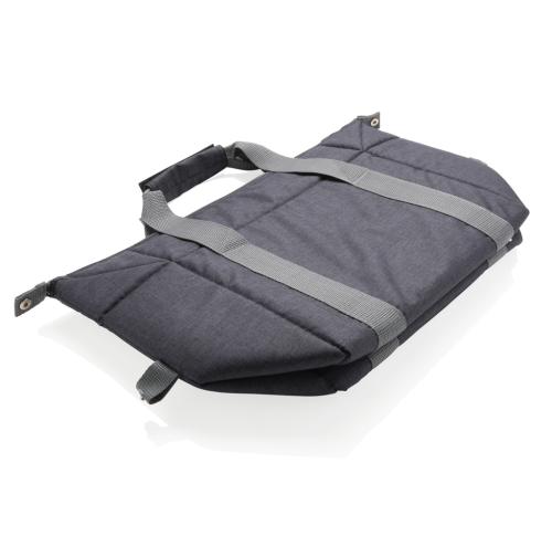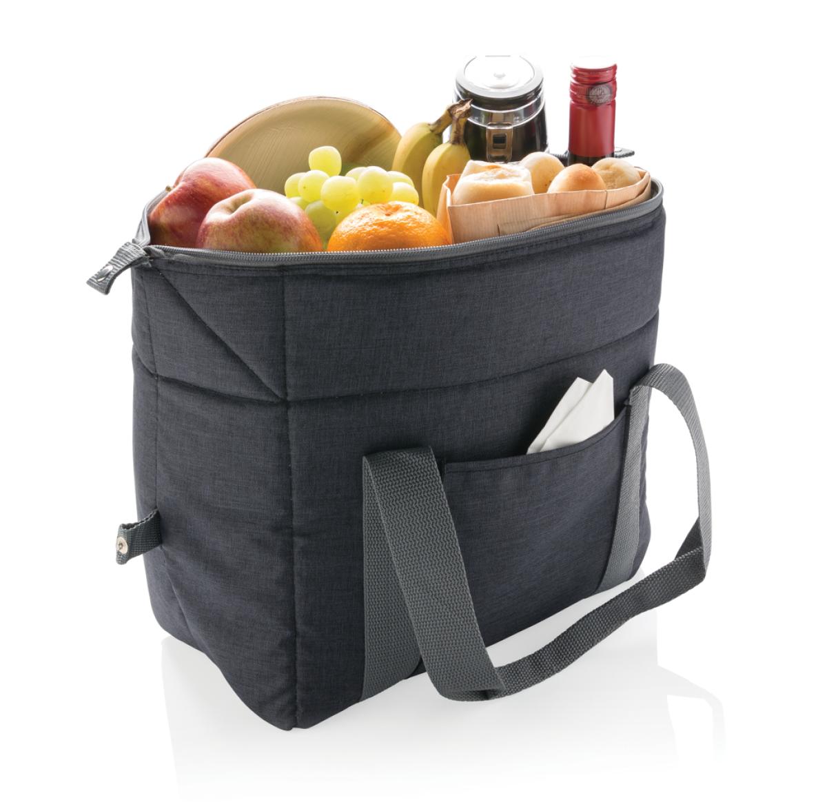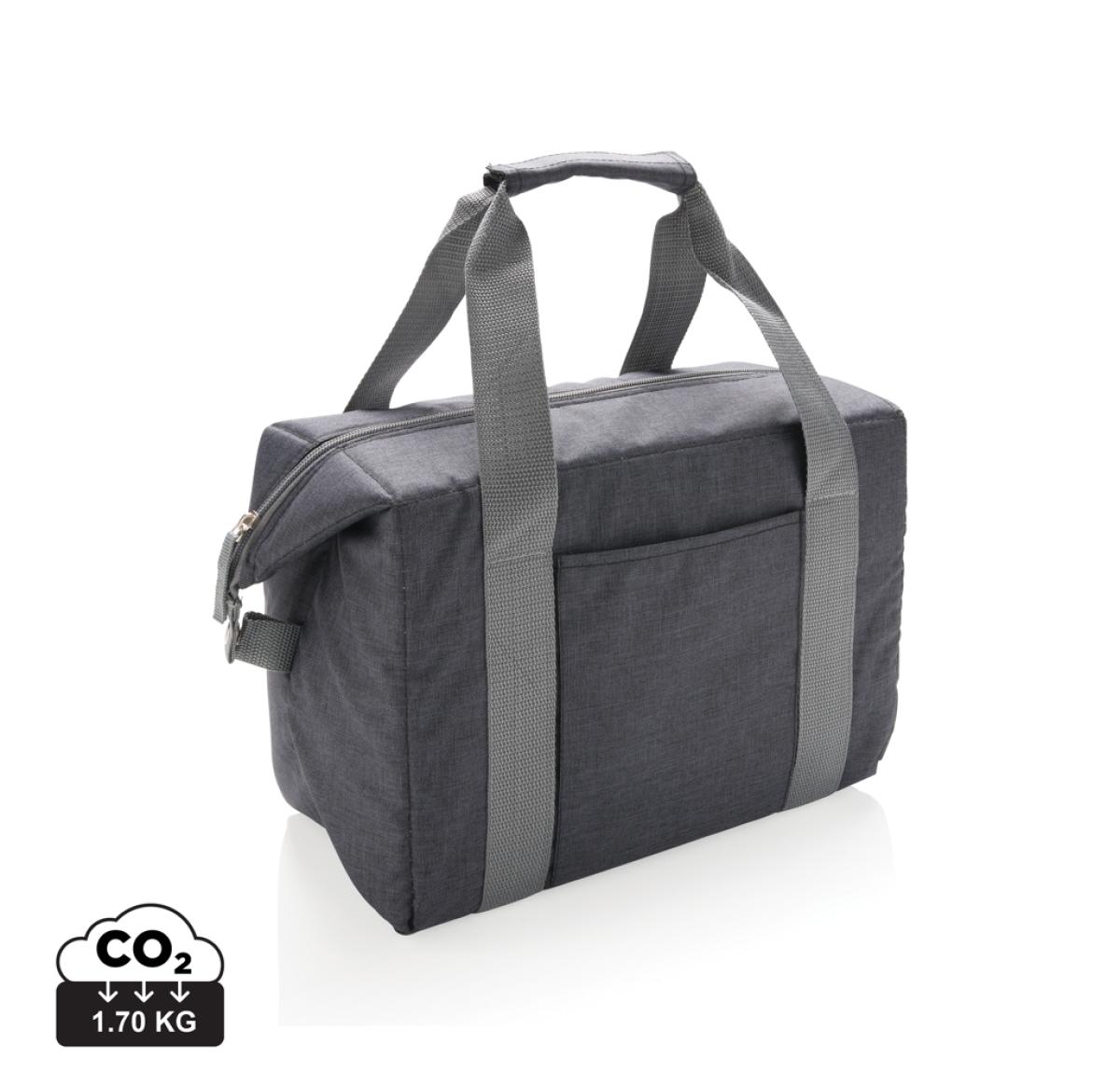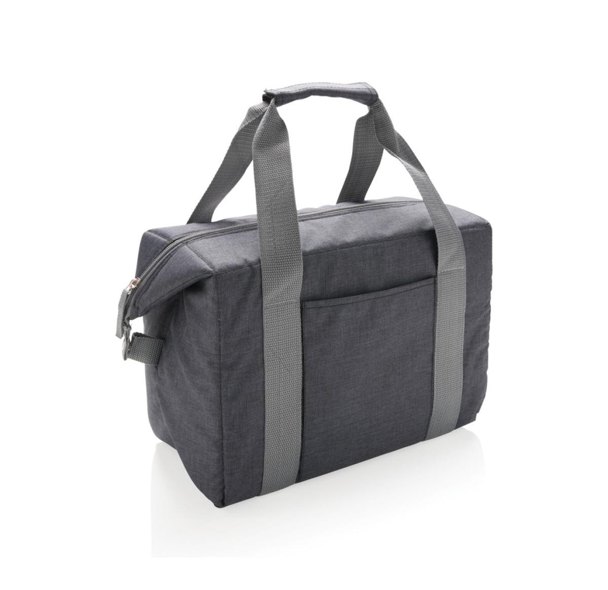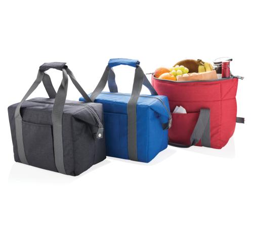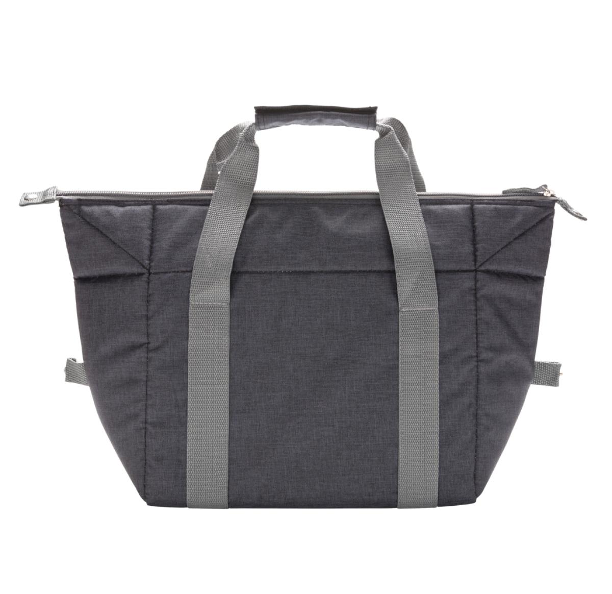 Medium size 600D tote cooler bag. Can hold up to 26 cans. Can be easily transformed to a duffle bag by closing the side buttons. With front sleeve pocket.