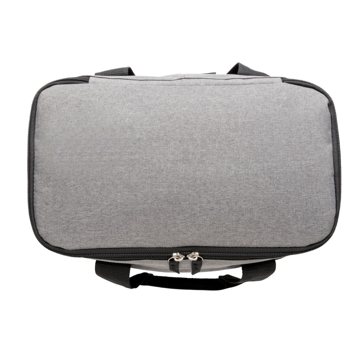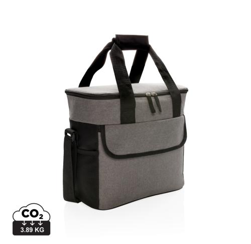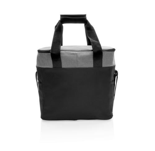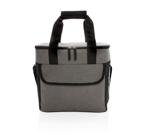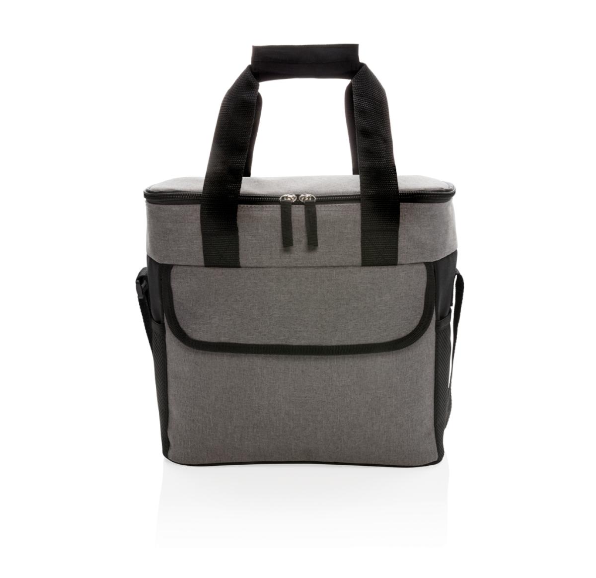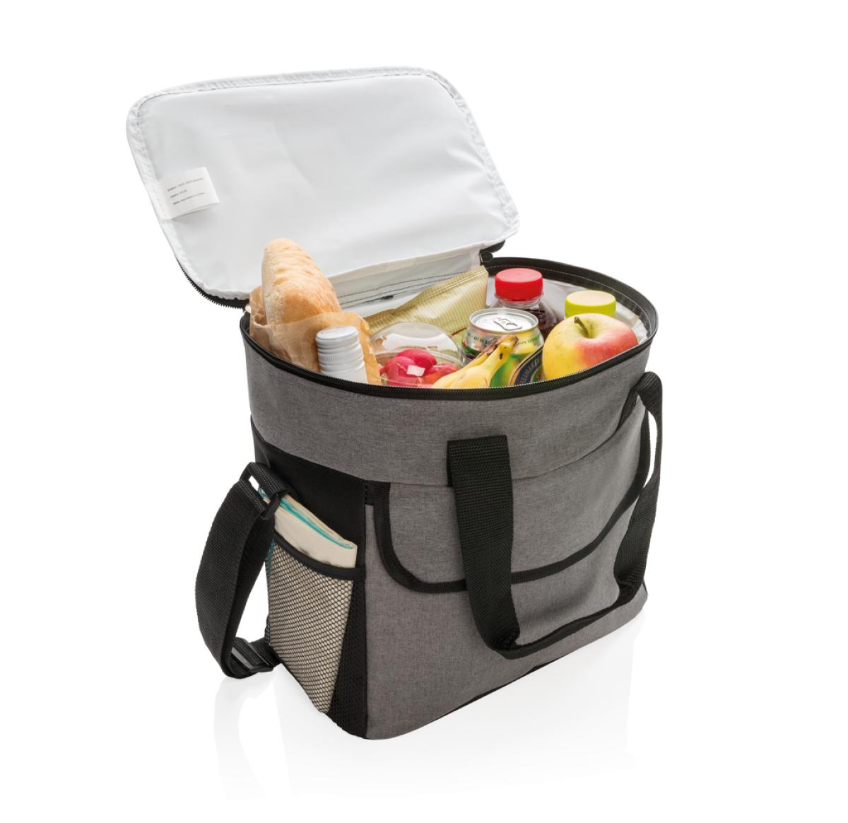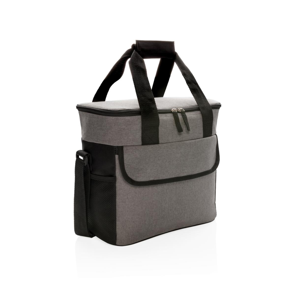 600D two-tone polyester large cooler bag can store up to 20 cans. With 2 mesh side pockets and 1 front pocket.