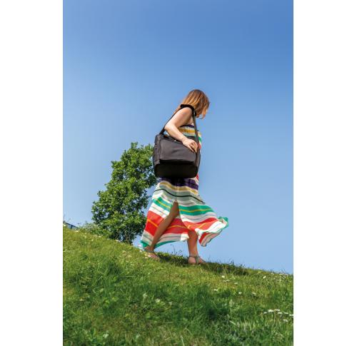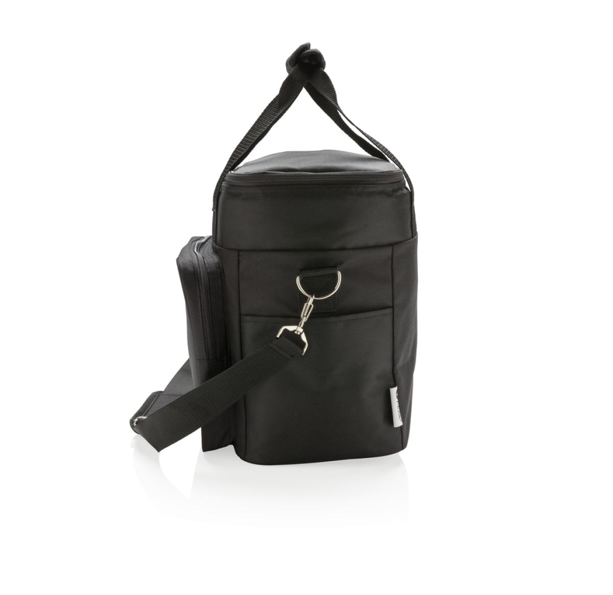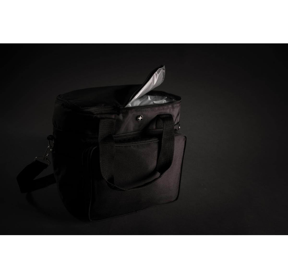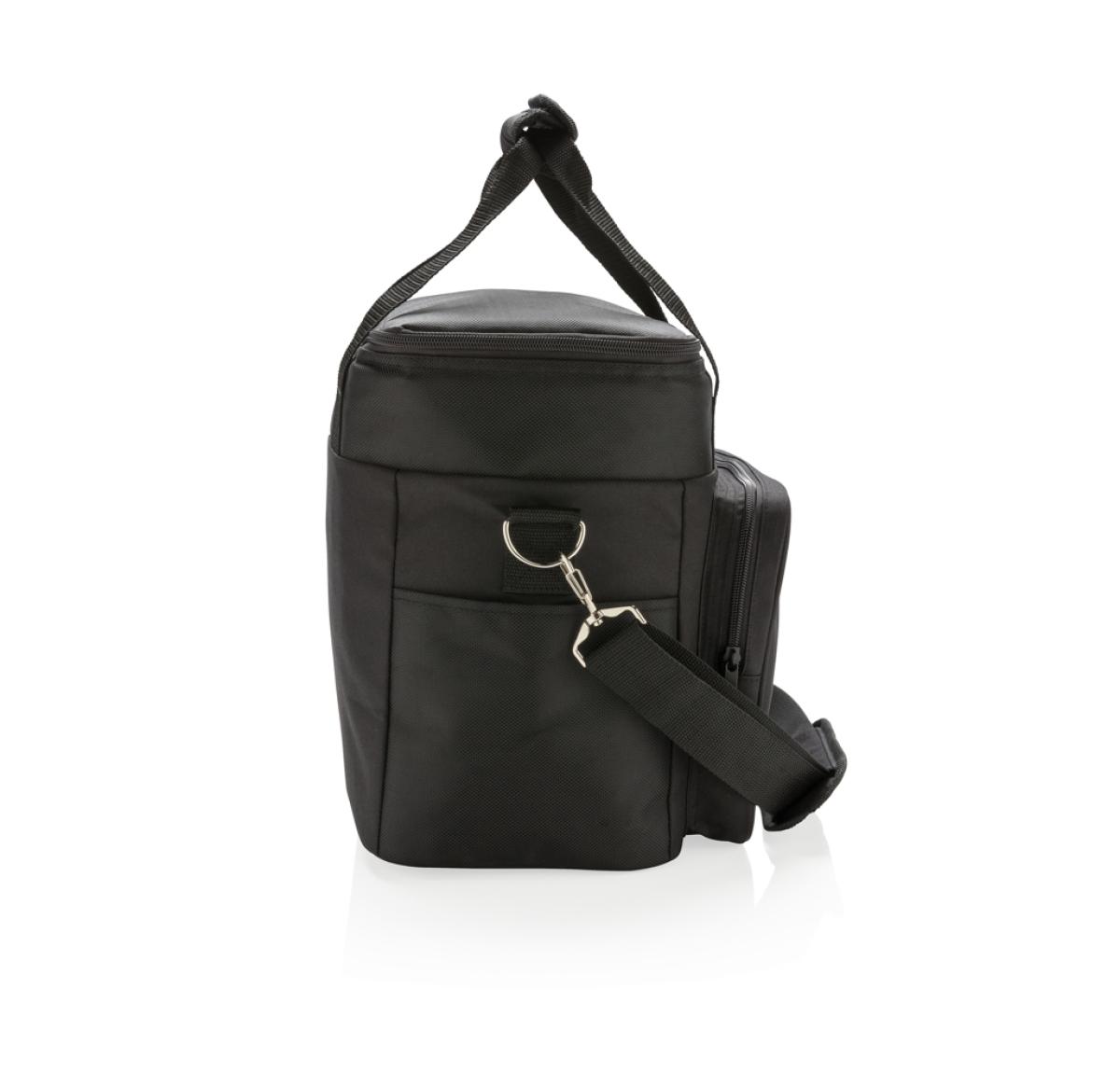 Deluxe 1680D and 600D polyester cooler bag with extra-large zipped main compartment and front sleeved pocket. Fits up to 20 cans. Double reinforced carrying handles. Removable adjustable shoulder strap.
