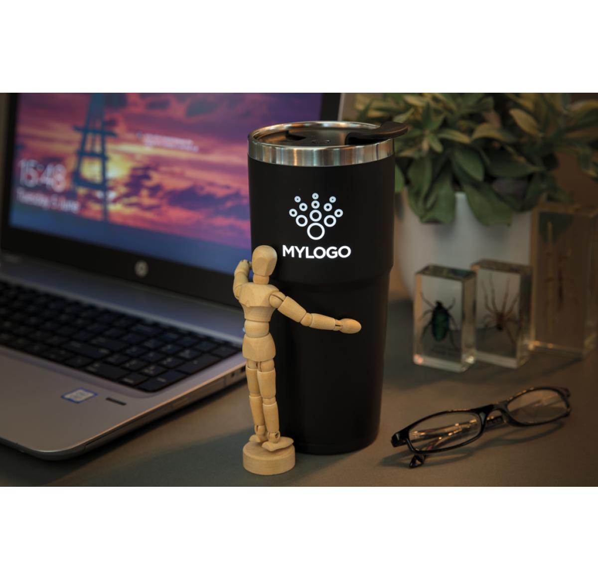 Double wall tumbler. 304 SS inside and ABS plastic outside. Engrave your logo and when picked up and shaken, the tumbler will light up your logo. Including 2 CR2032 cell battery Content: 480 ml.