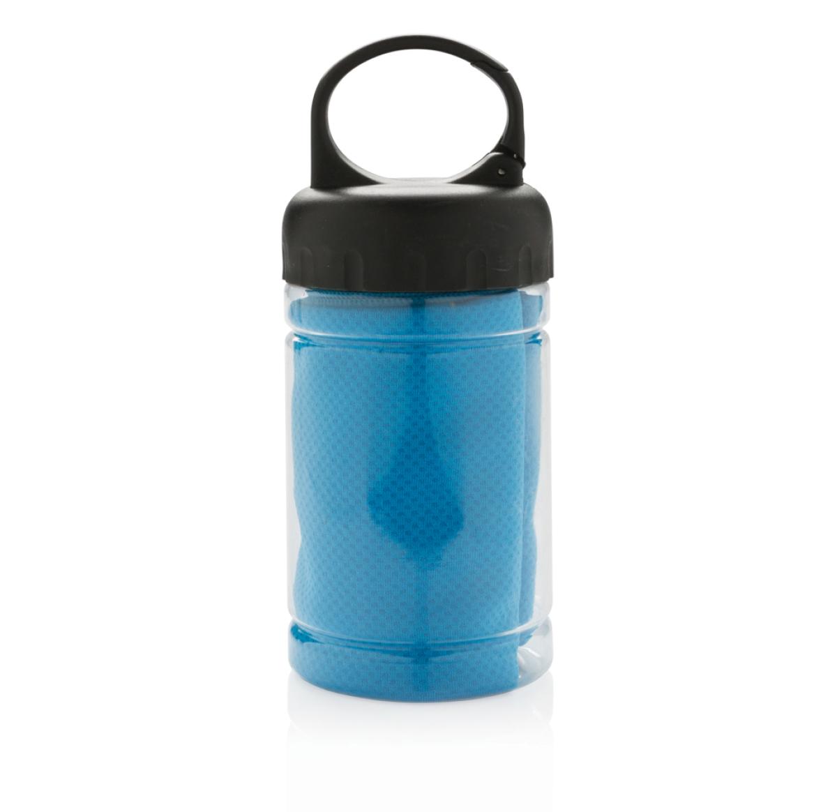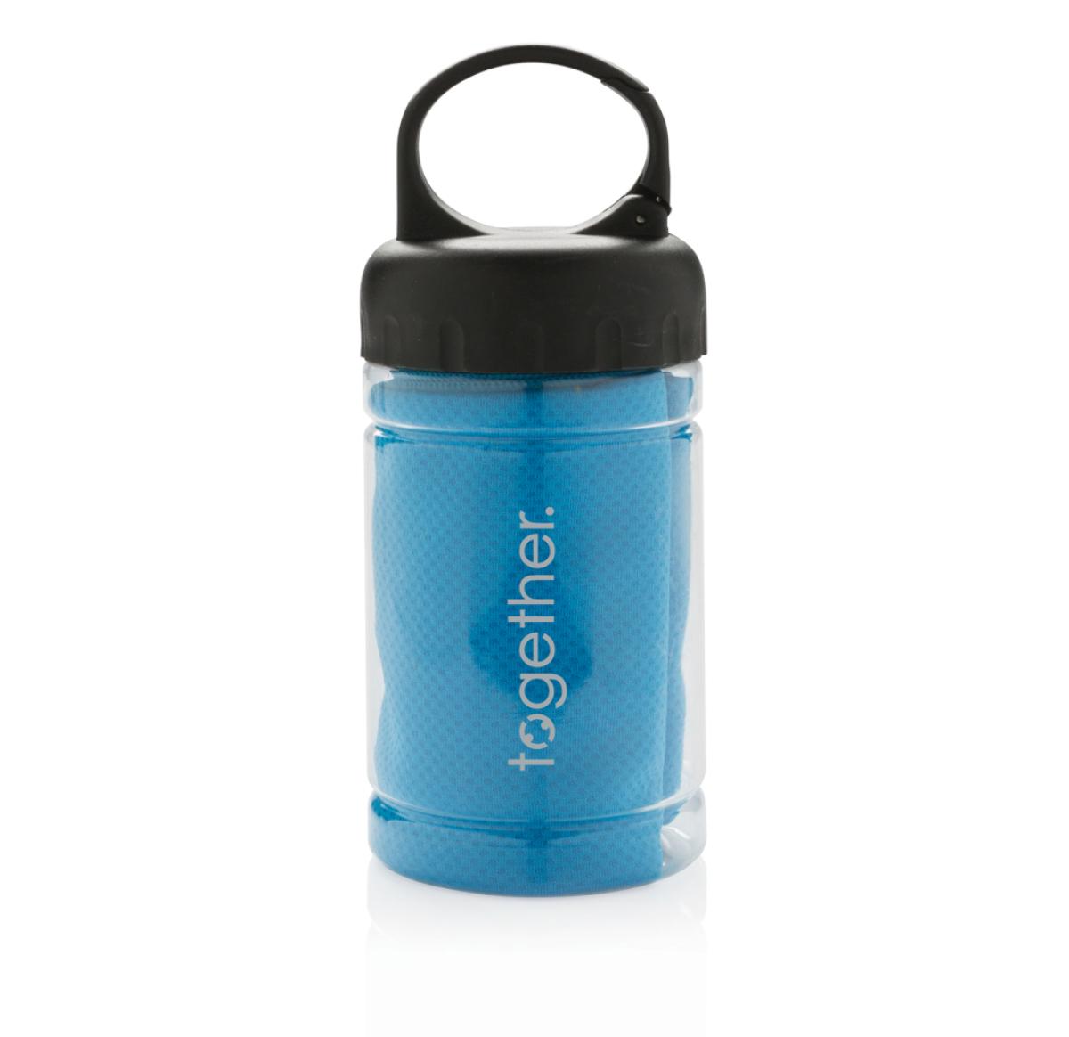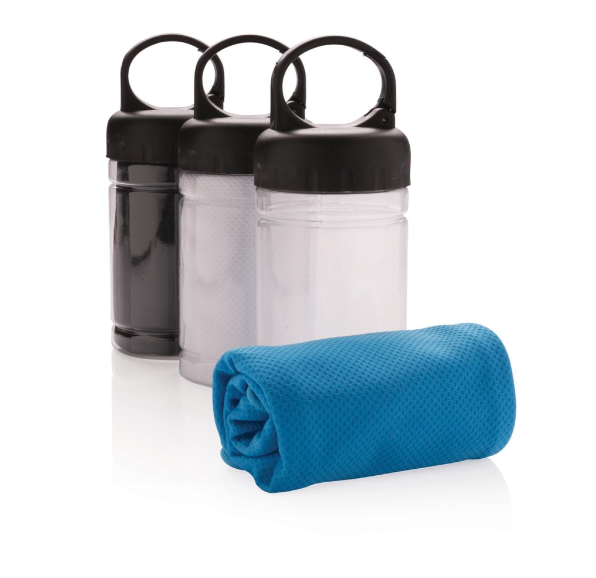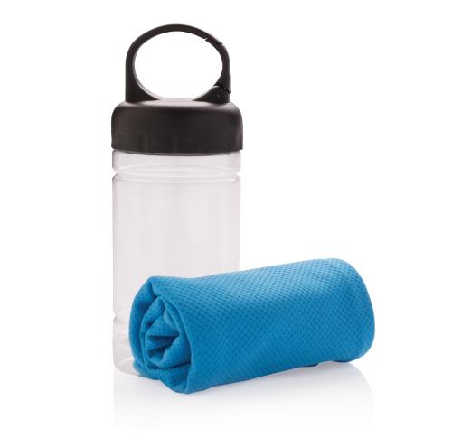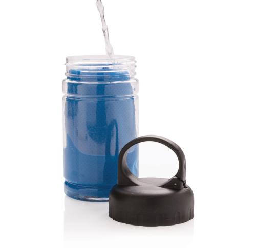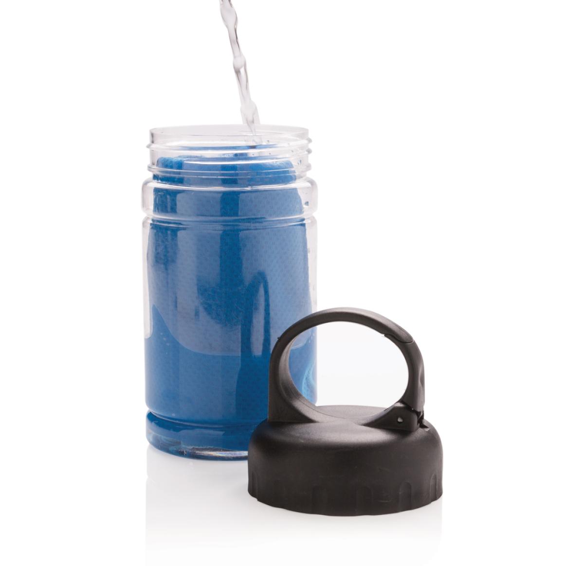 Microfibre cooling towel 100% free of chemicals. 98% sun blocking function up to UV 50+ protection. The towel can be easily used by adding some cold water to the bottle creating a cool towel for fast refreshment. The bottle is made out of PP with ABS top