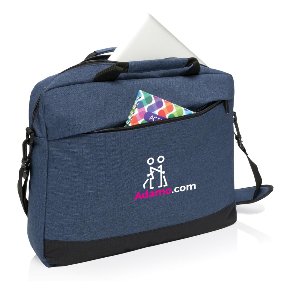 Protect and store your 15.6” laptop in style in this trendy 600D duo tone polyester laptop bag. 2 sided main compartment for your gear. Front slanted zippered accessory pocket. PVC Free.