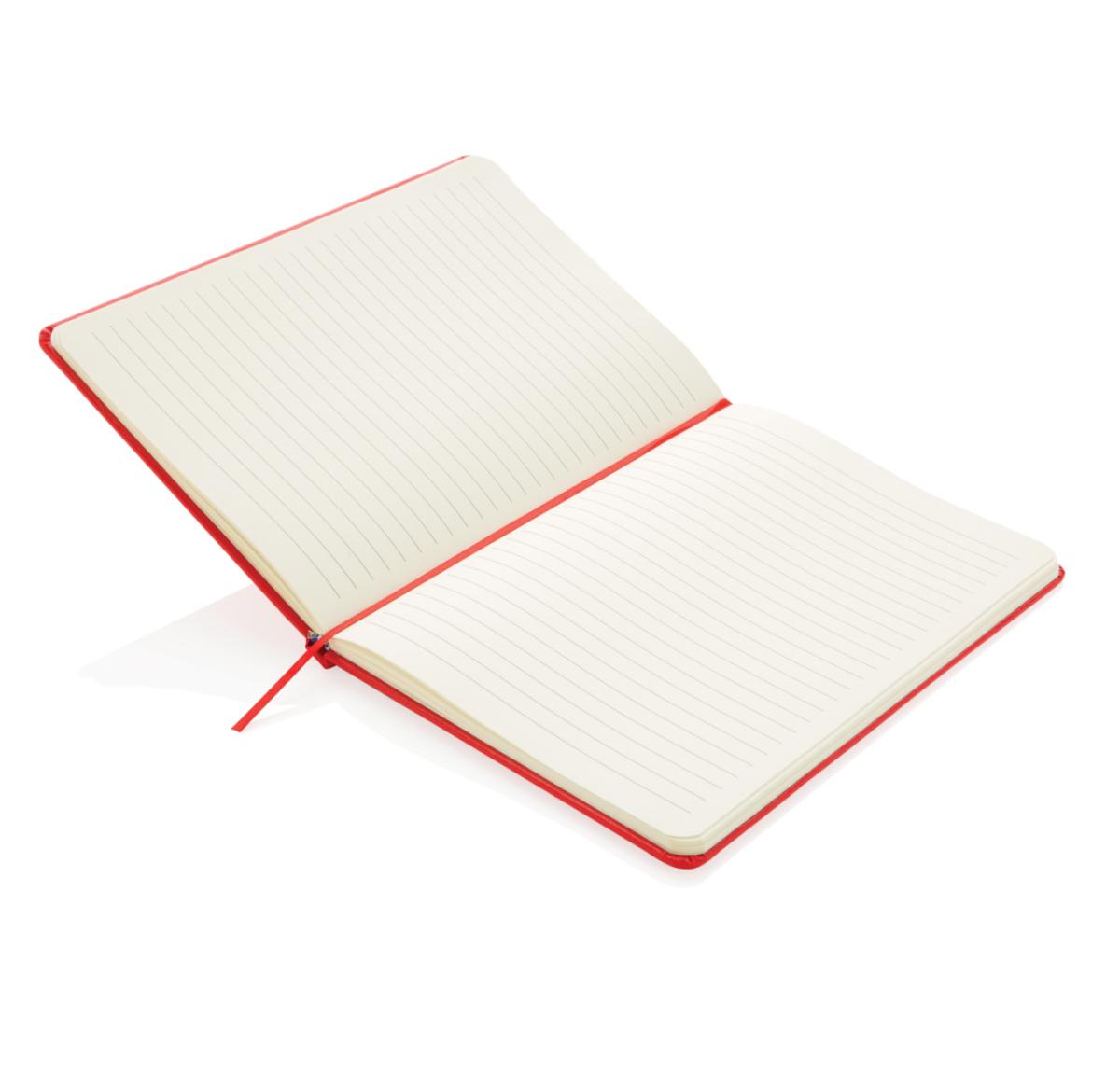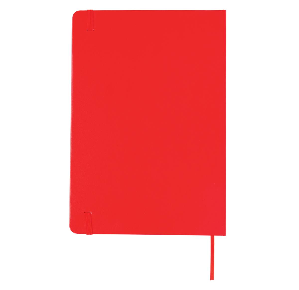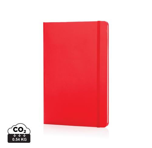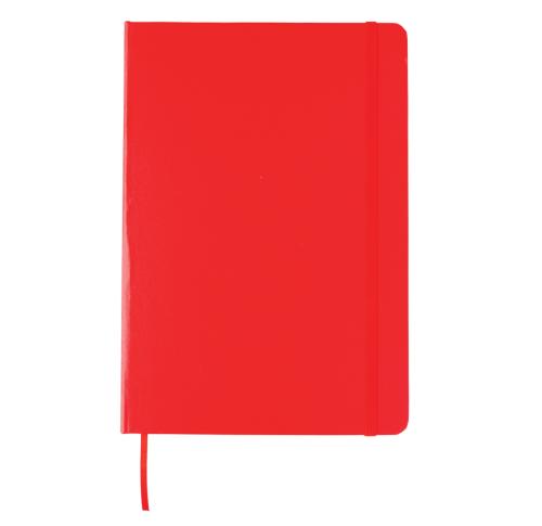 Ruled A5 hardcover standard notebook with elastic closure and bookmark ribbon. 144 pages of 70g/m2 paper inside. Cream coloured pages.