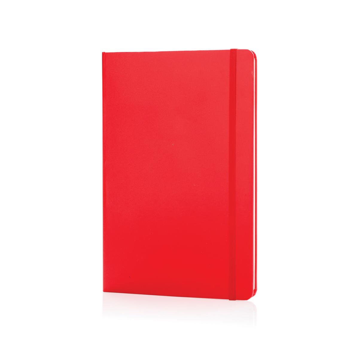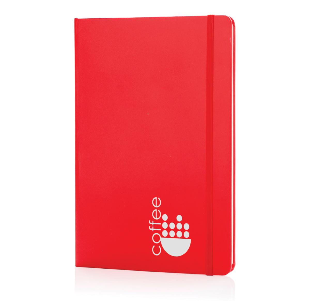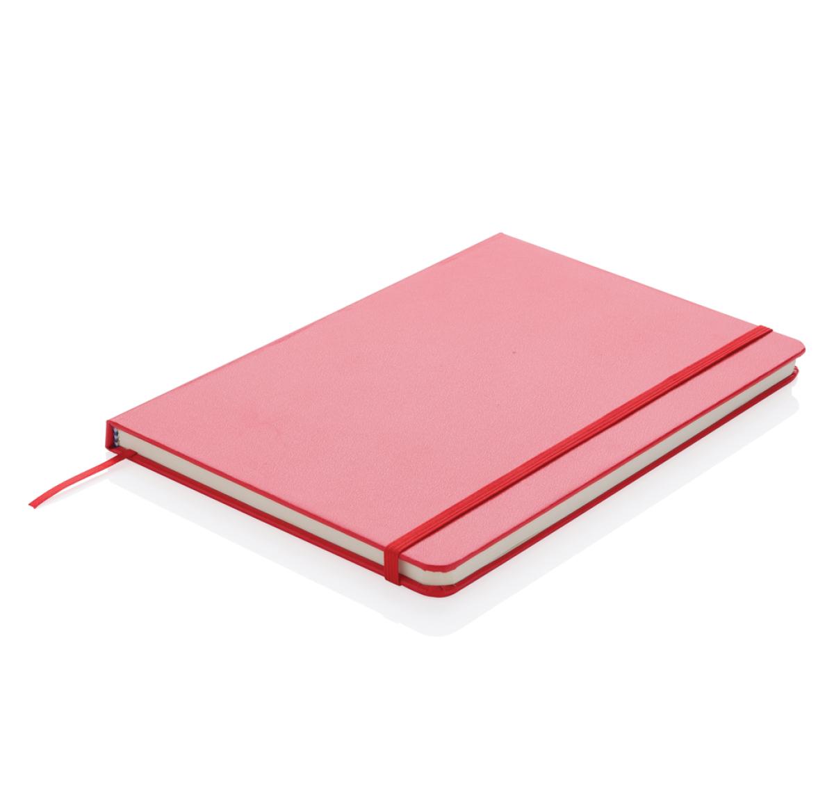 Ruled A5 hardcover standard notebook with elastic closure and bookmark ribbon. 144 pages of 70g/m2 paper inside. Cream coloured pages.