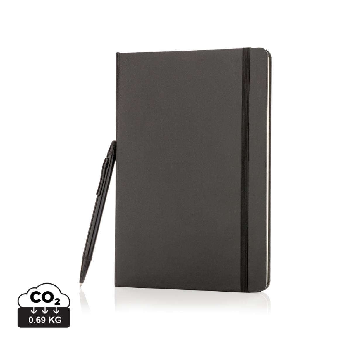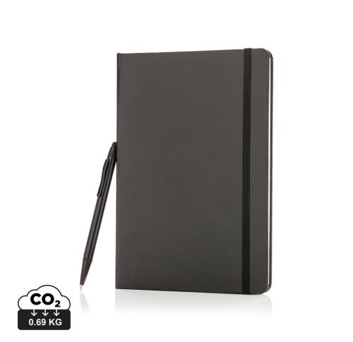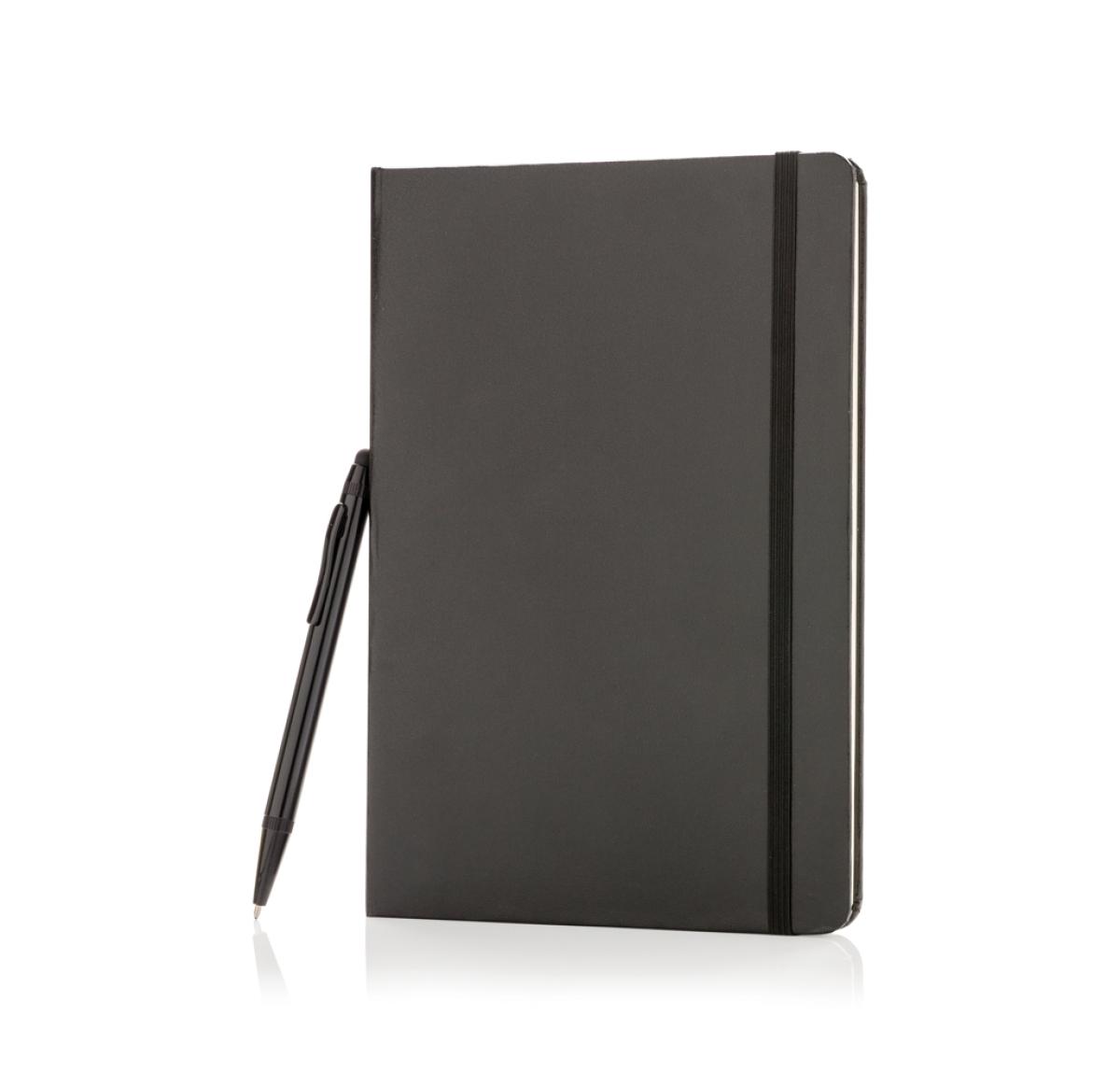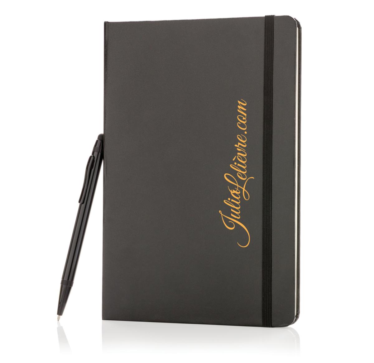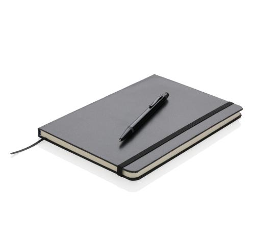 Ruled A5 hardcover classic notebook set including aluminium stylus pen. With elastic closure and bookmark ribbon. 144 pages of 70g/m2 paper inside. Cream coloured pages. Packed in giftbox.