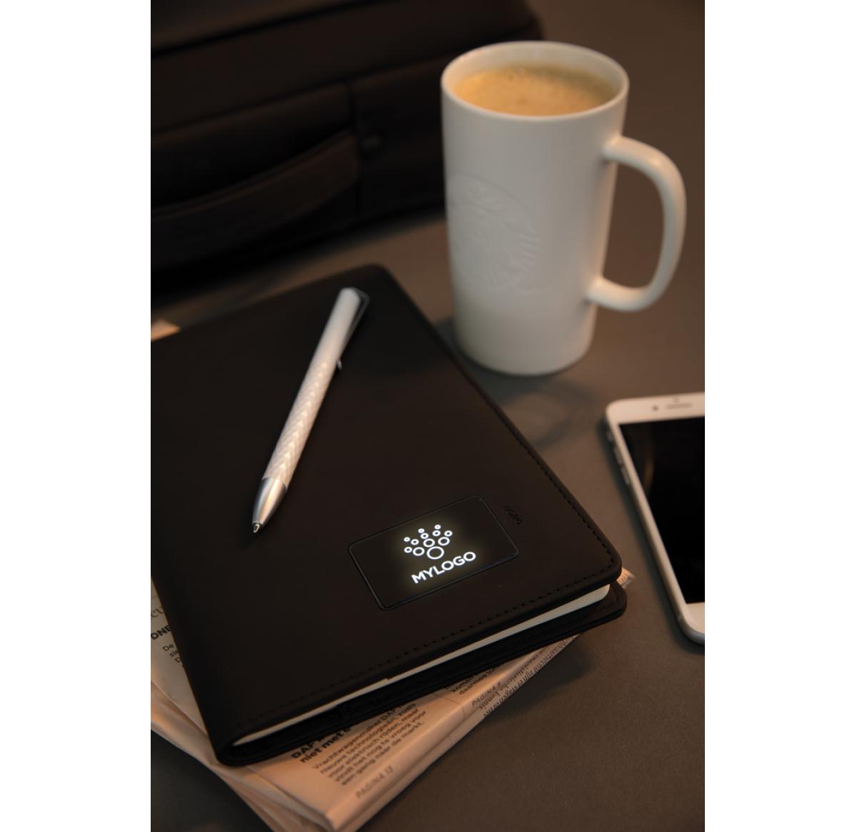 Display your logo in a unique way. The front of the notebook cover contains a light to light up your logo. Including two CR 2032 batteries and removable notebook with 128 pages of lined, cream coloured 80 gsm paper.