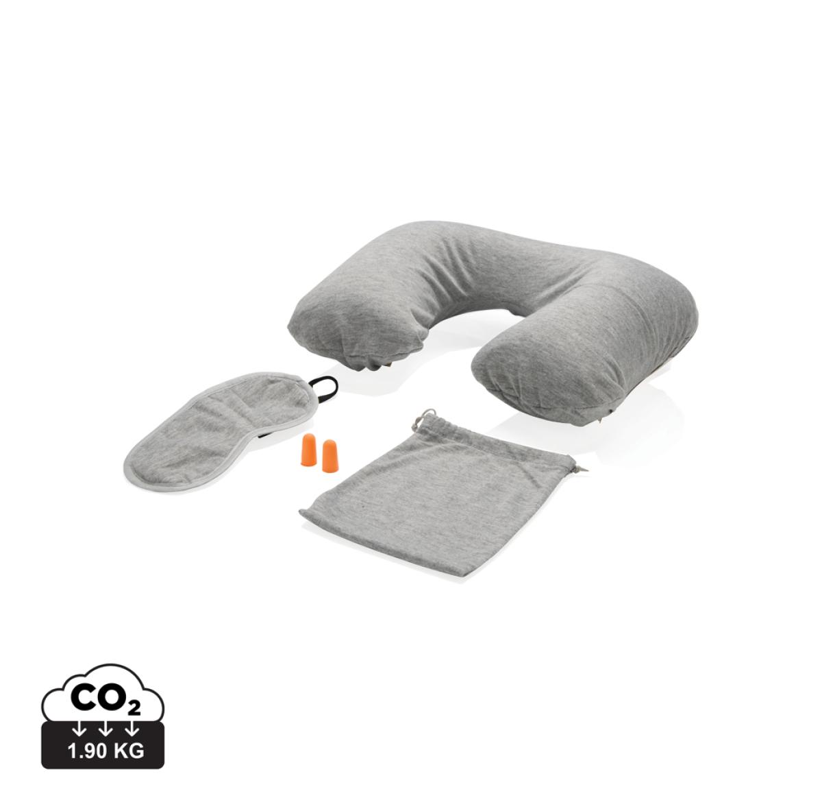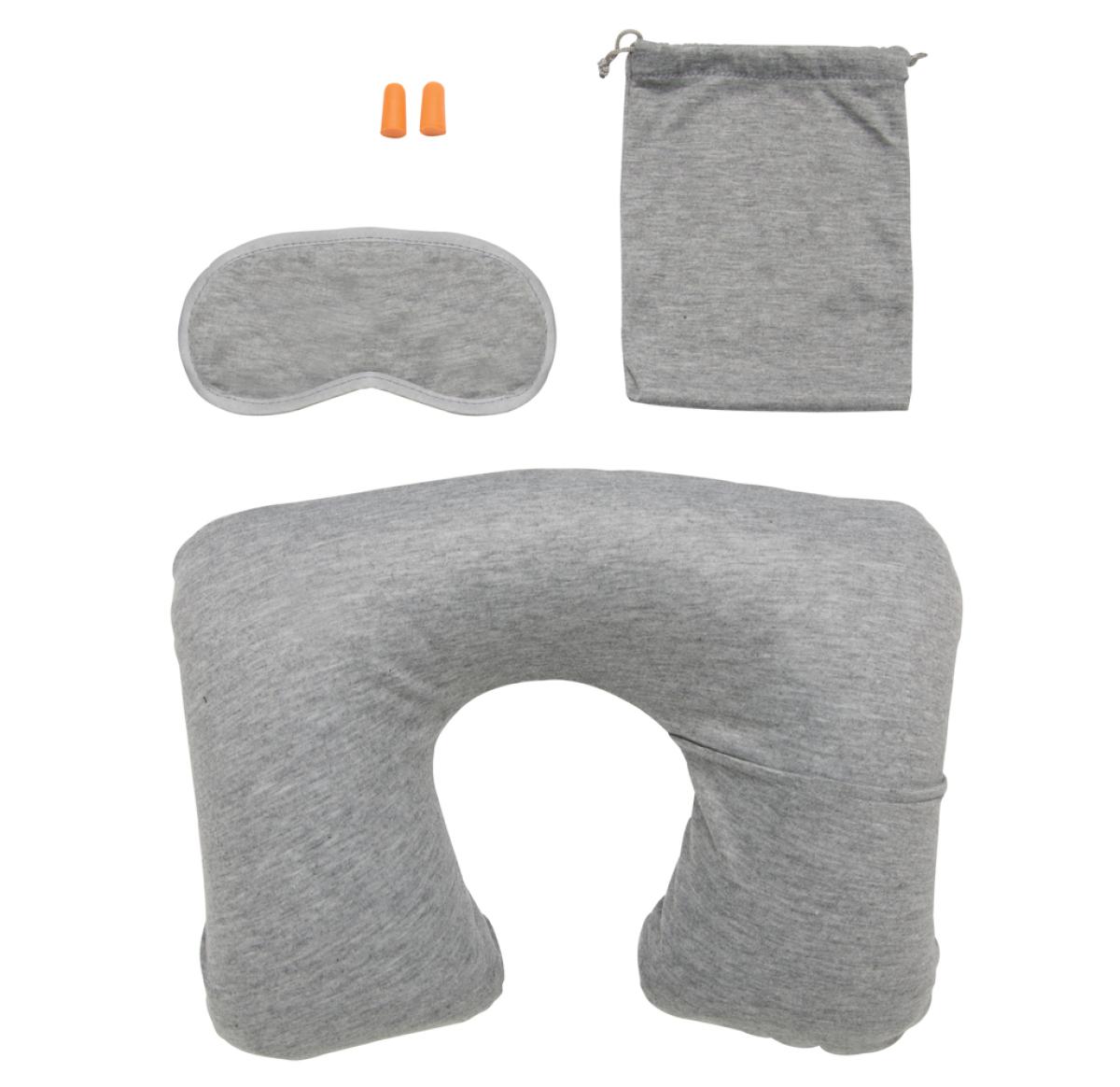 Jersey travel set with pocket for your phone or headphone. Soft travel set contains an inflatable neck pillow, eye mask, soft earplugs and a soft pouch with drawstring closure.