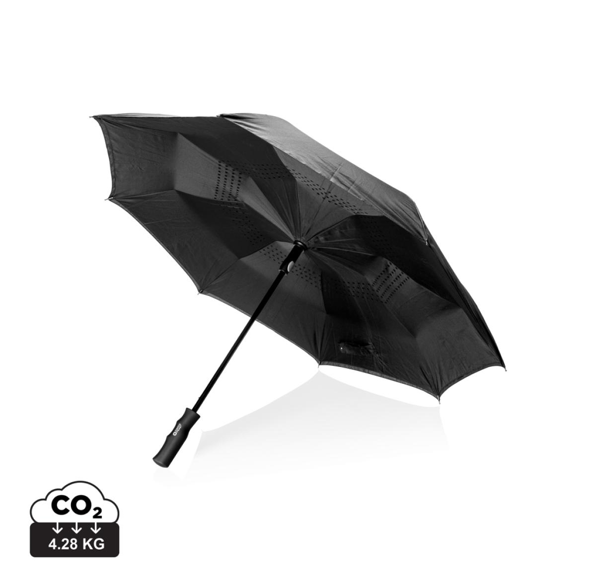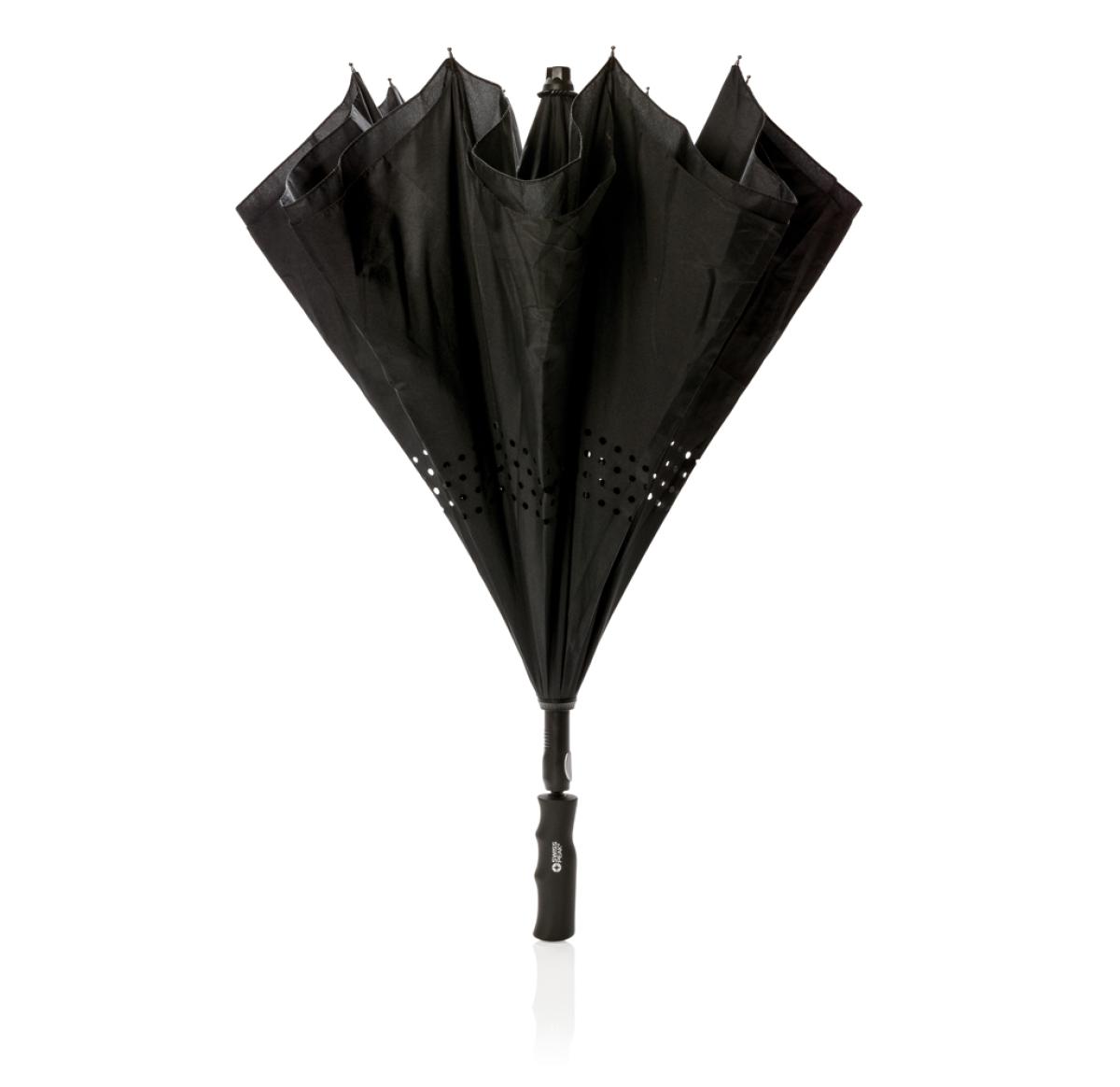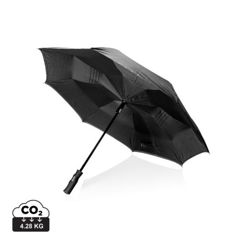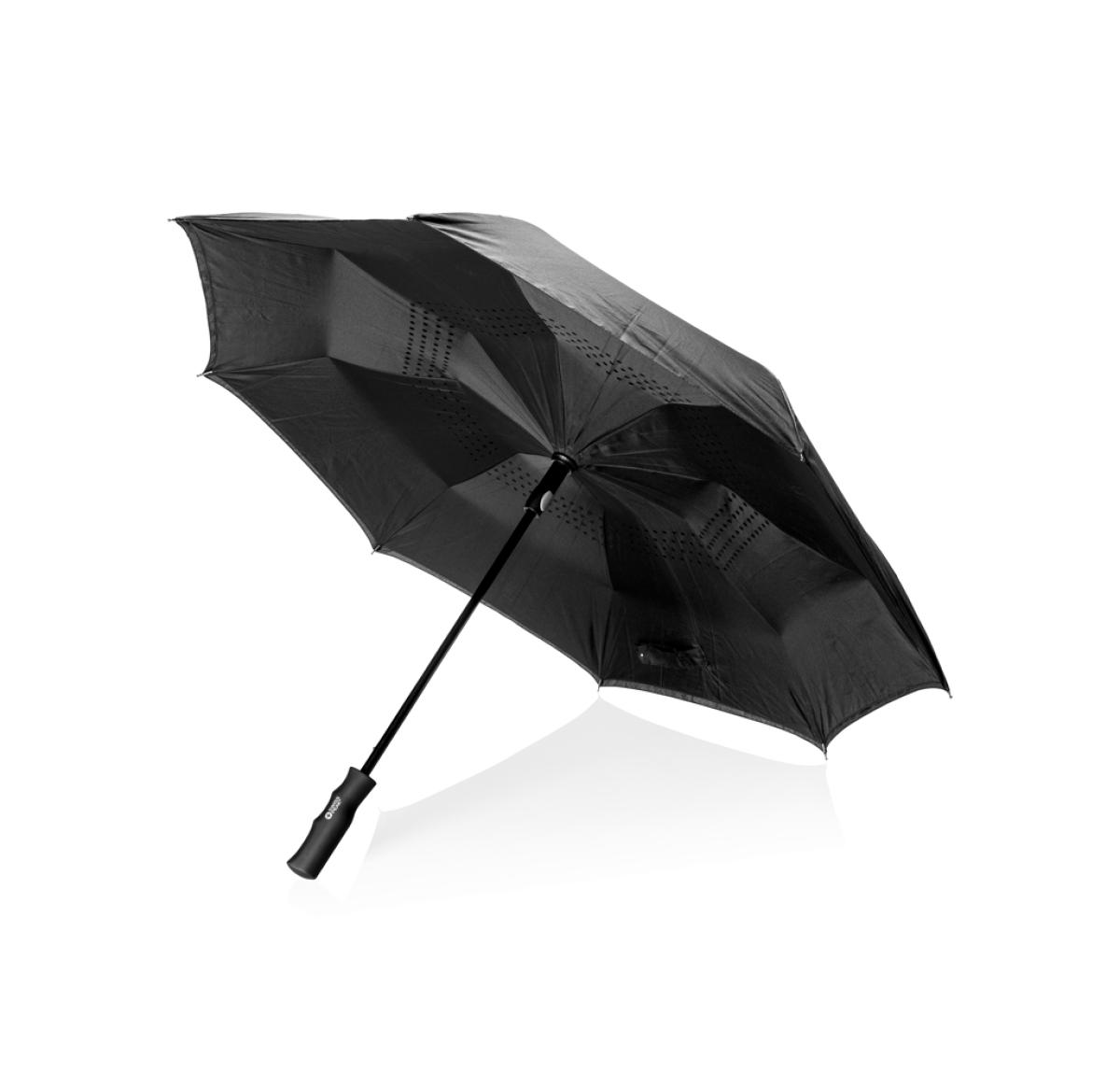 23’’ reversible umbrella in 190T pongee fabric with automatic opening and manual closing. Full fibreglass ribs and frame with windproof system.